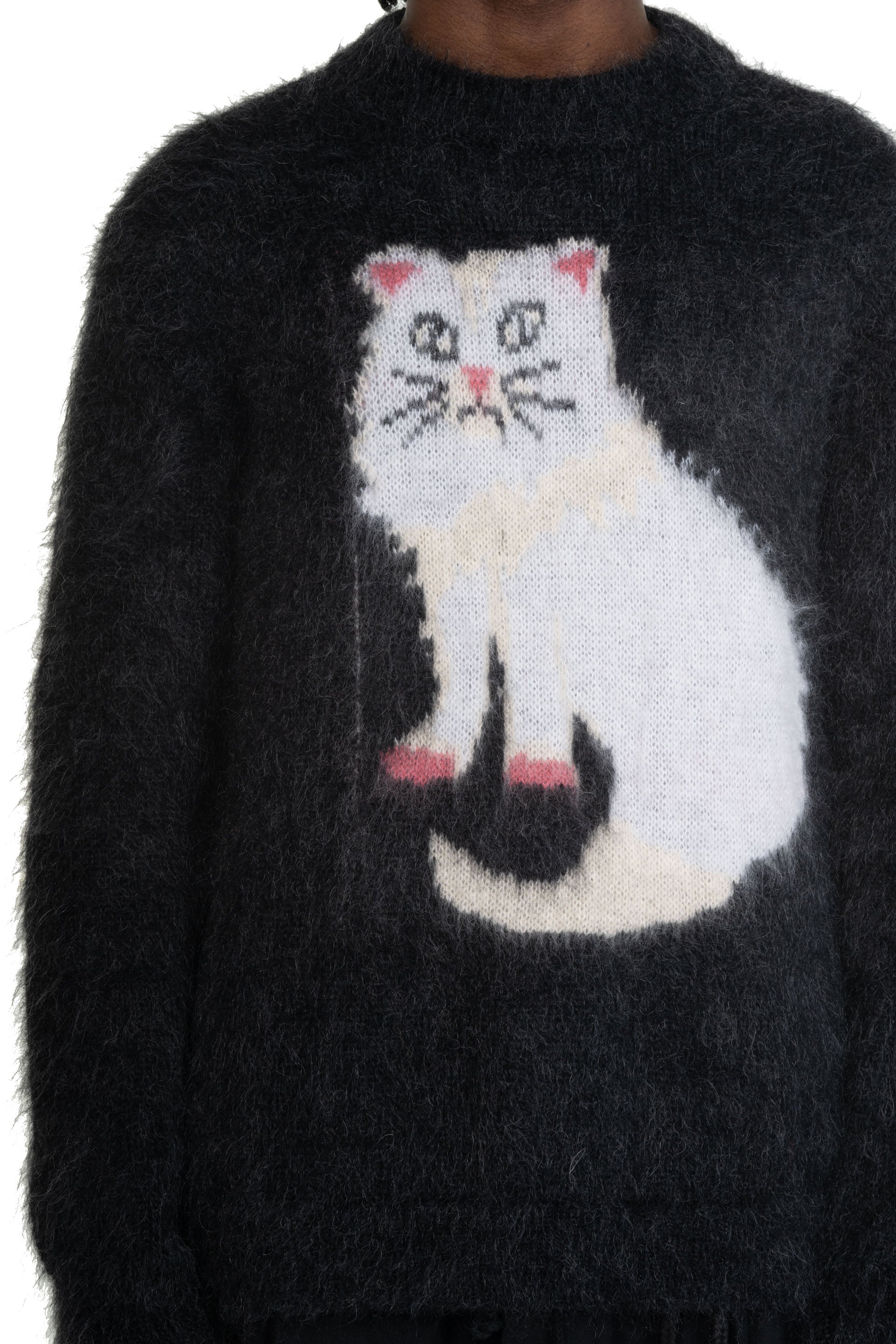 Long sleeves. Round neck. Soft wool fabric. Knitted pattern throughout with different textures. Seasonal animal design. "Cat" Design.