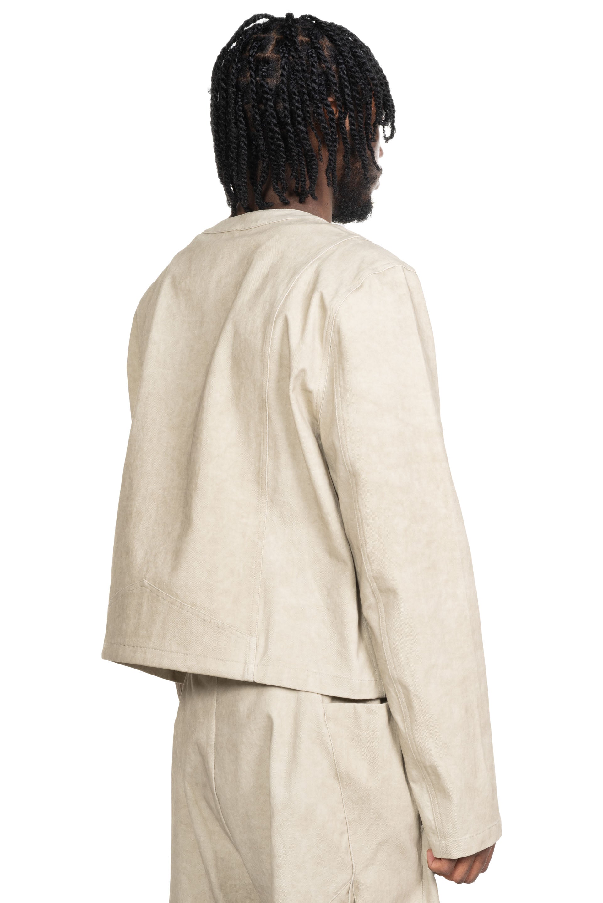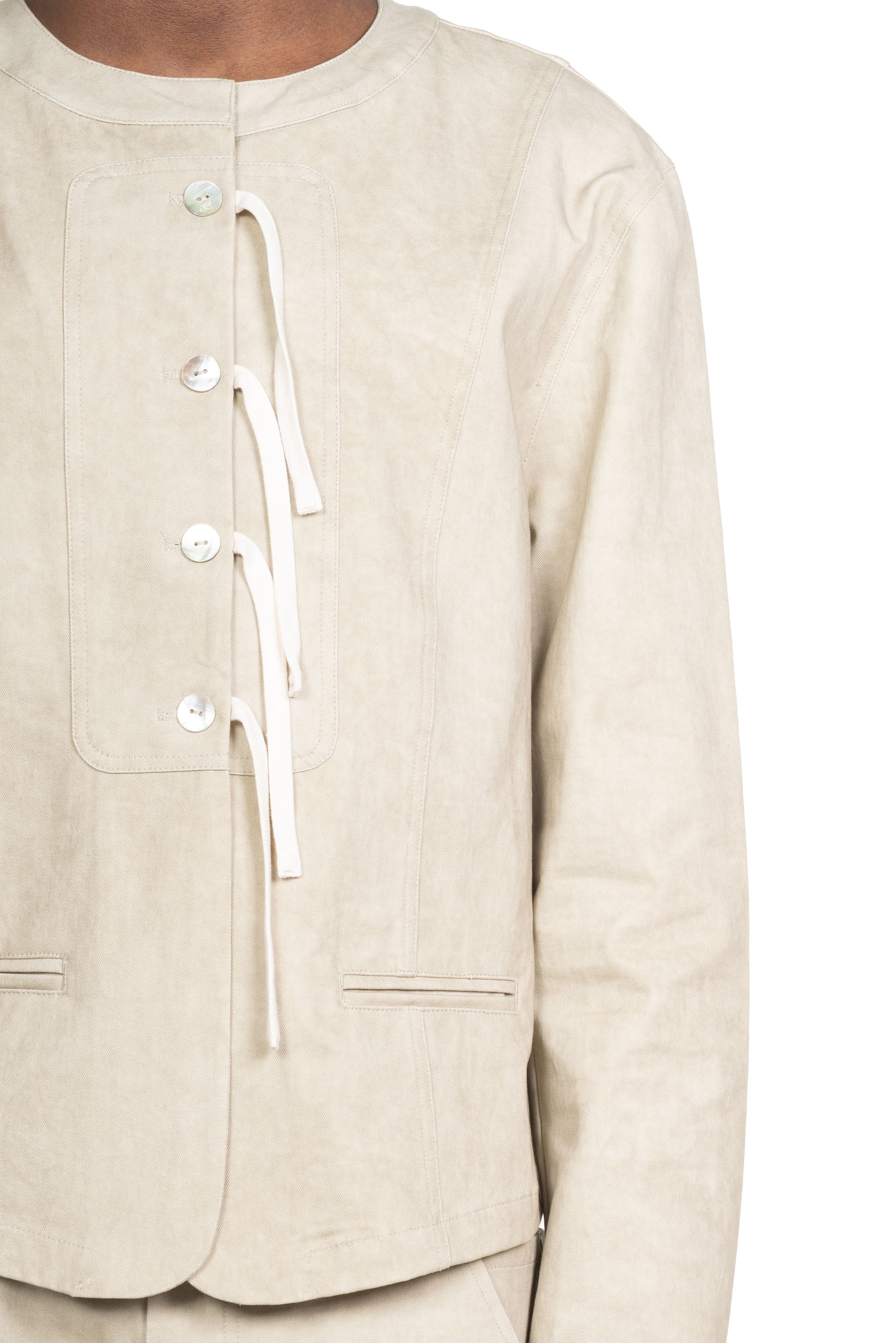 Aenrmous Gone Jacket in Cream. Long sleeves. Round collar. Button closure at front. String detail at front. Two side pocket. Boxy cropped fit.