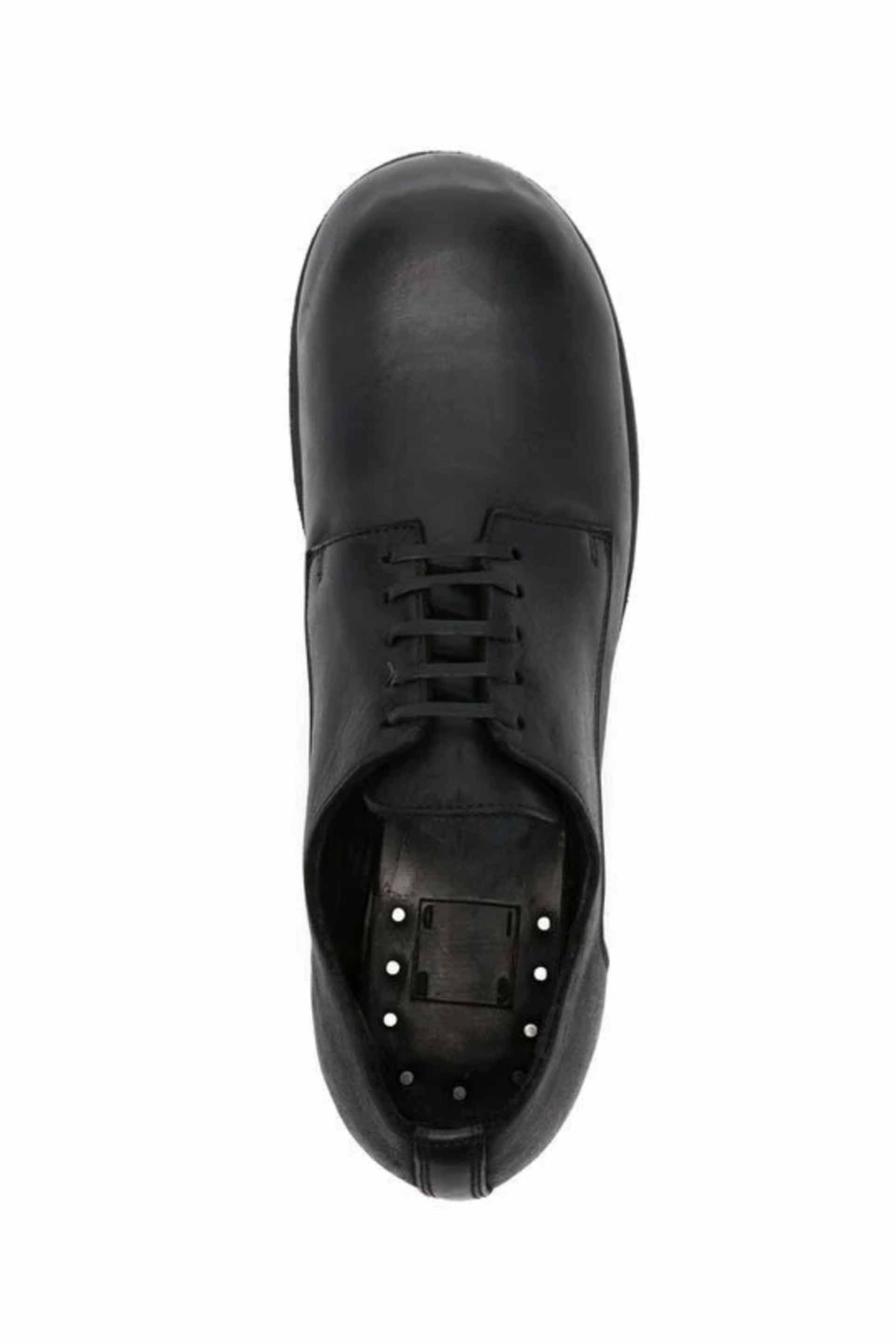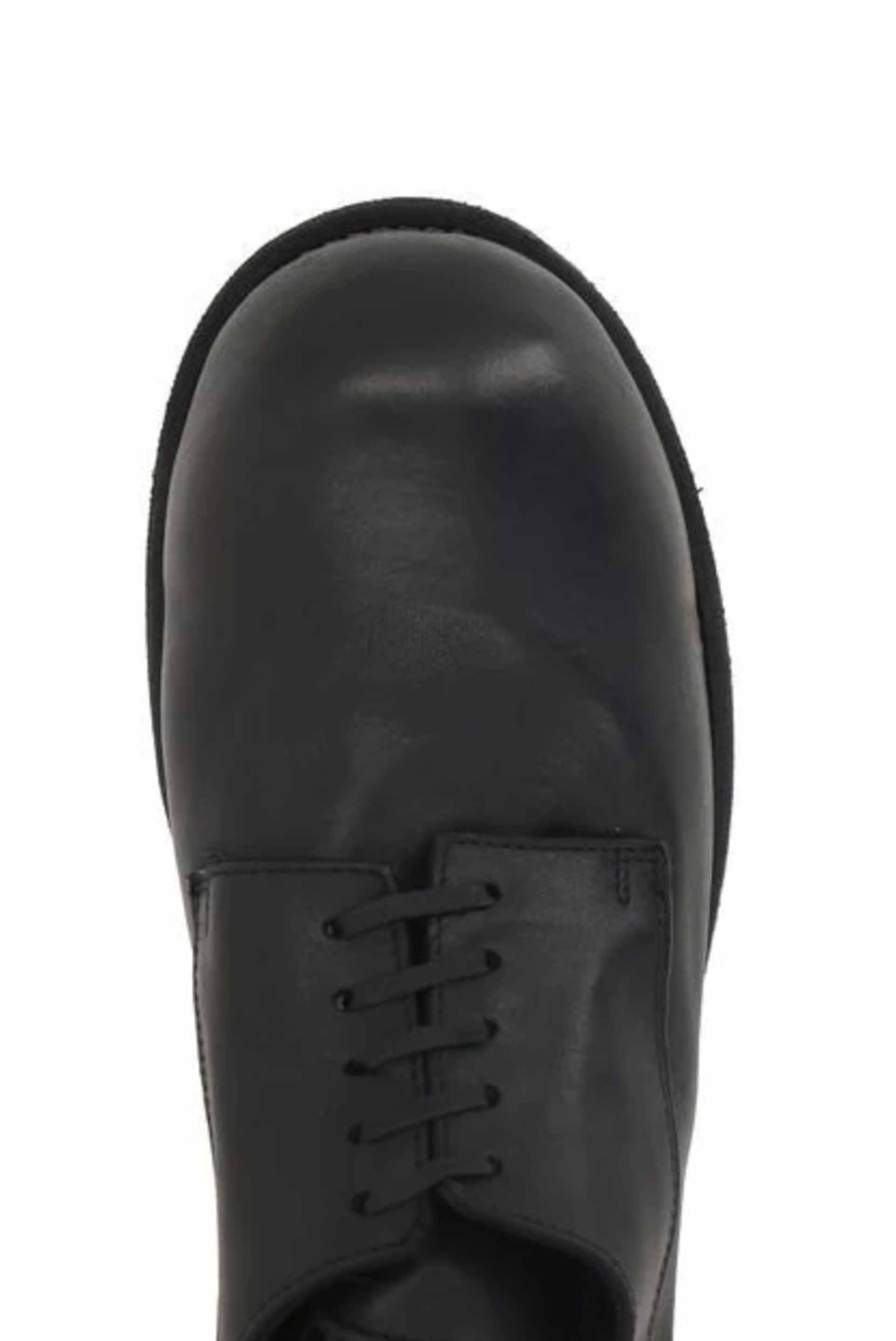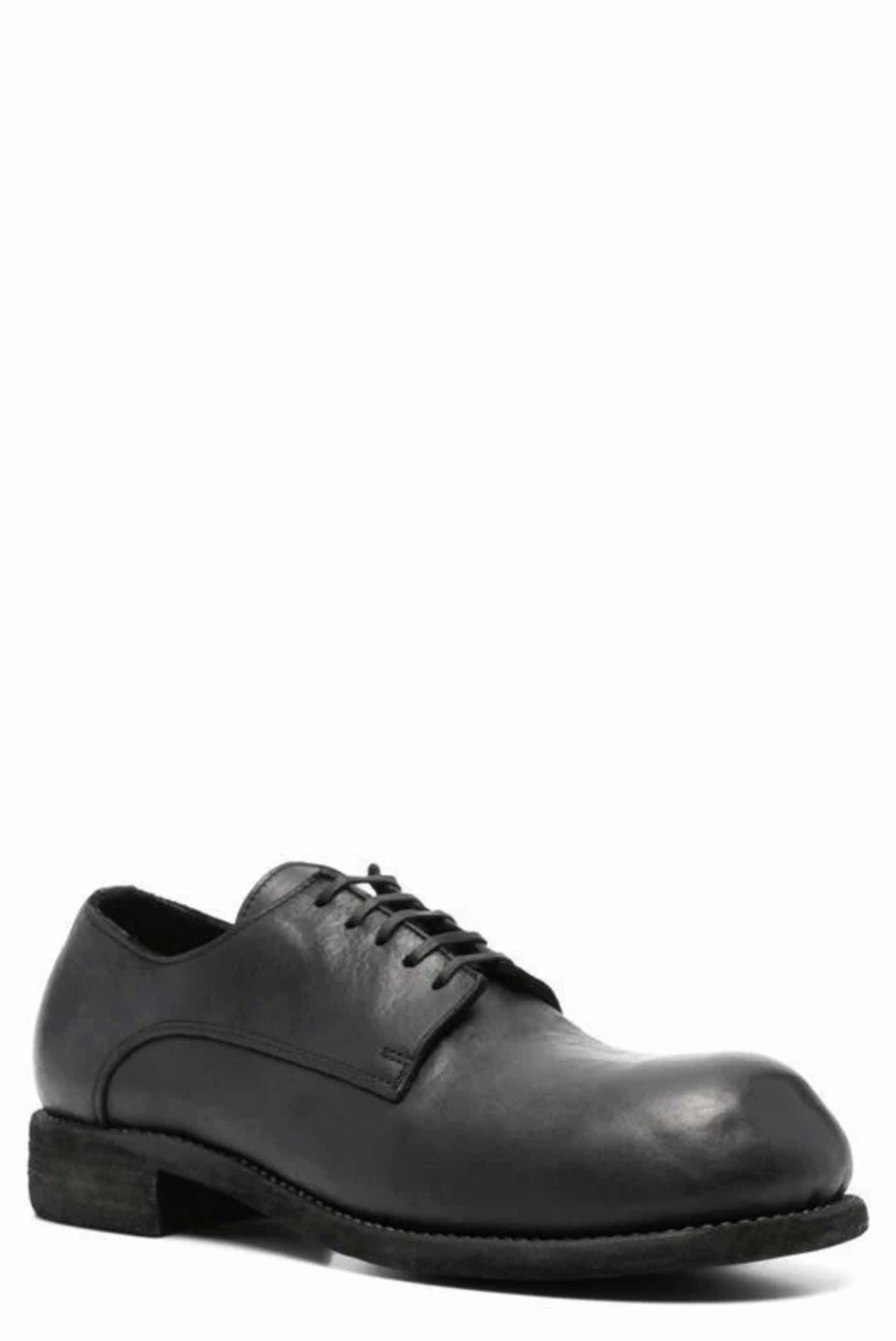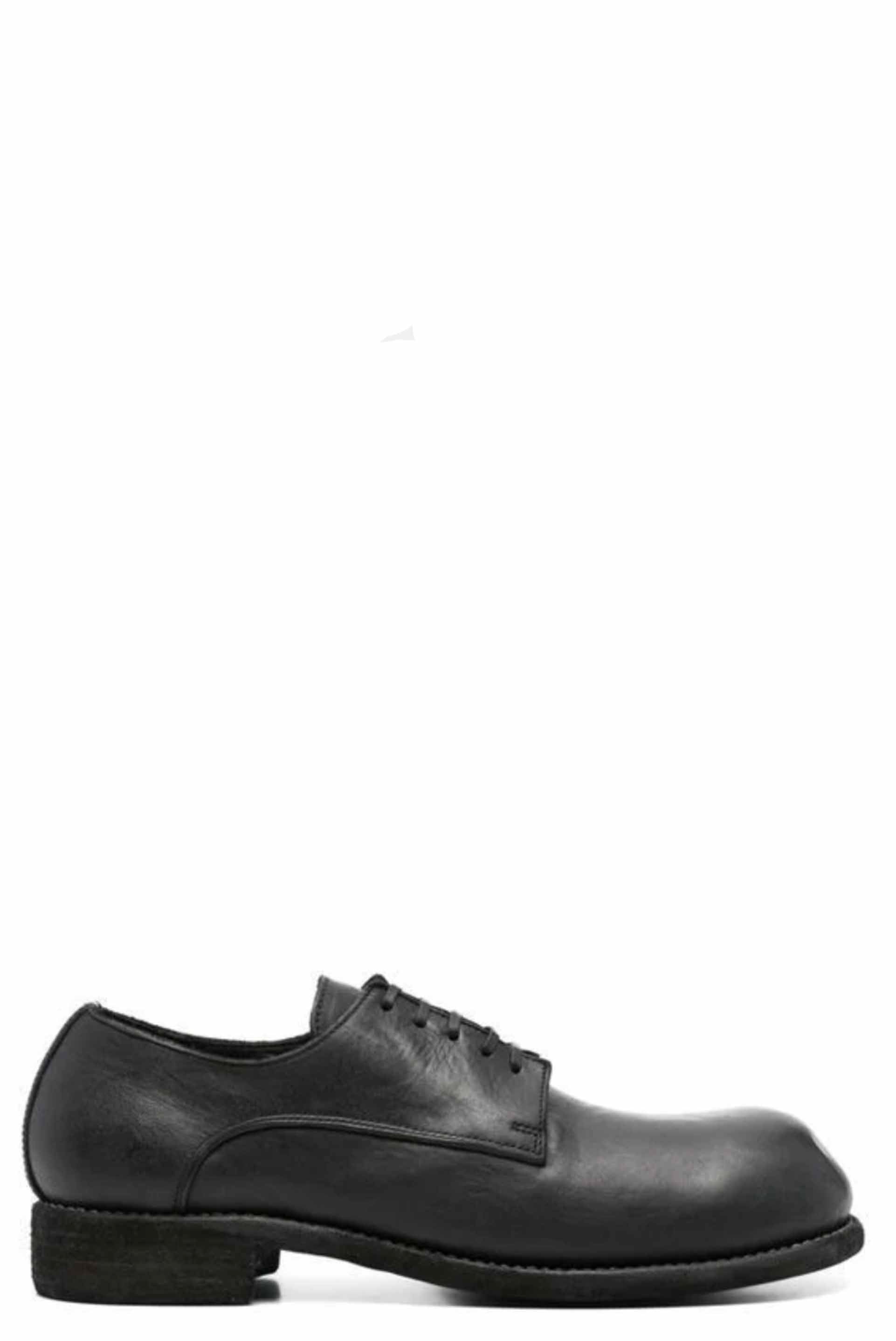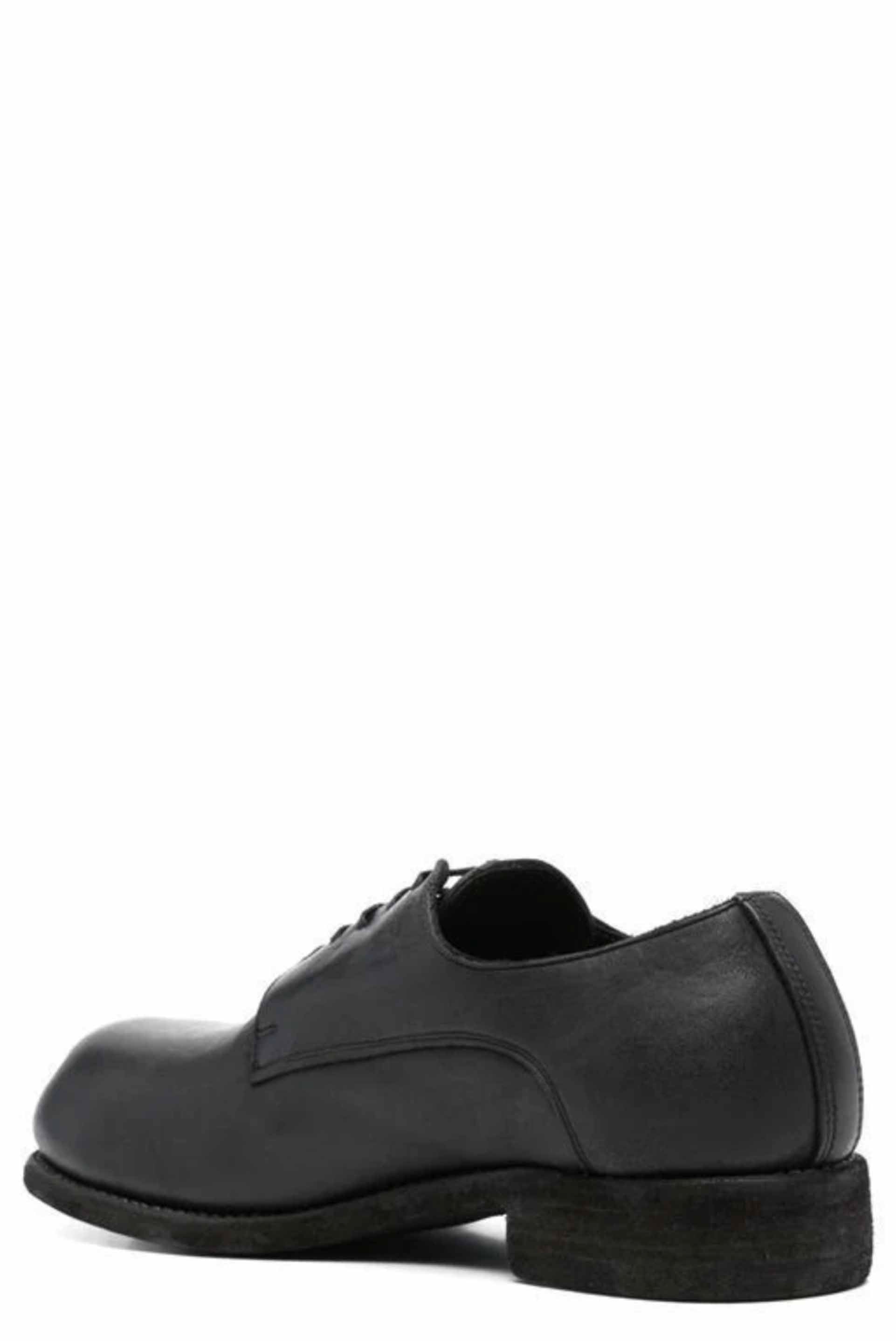 GR02 leather lace-up shoes from Guidi. Black leather tonal stitching. Almond toe. Front lace-up fastening. Branded insole. Low heel. Flat sole. Extra leather laces included.