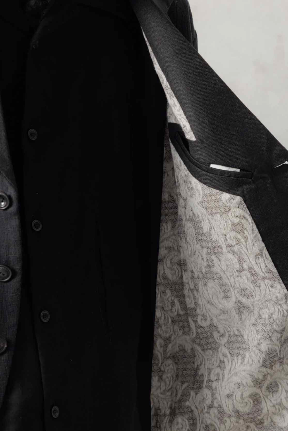Professor e washed black blazer. Inspiration from a 1920s American suit vest in our archive, we reinterpreted its mending details and placement in this season’s Grandpa’s series, incorporating double breasted elements. The series includes a suit vest, blazer, and overcoat, all designed with tonal fabric blocking to create a visually rich, layered effect.