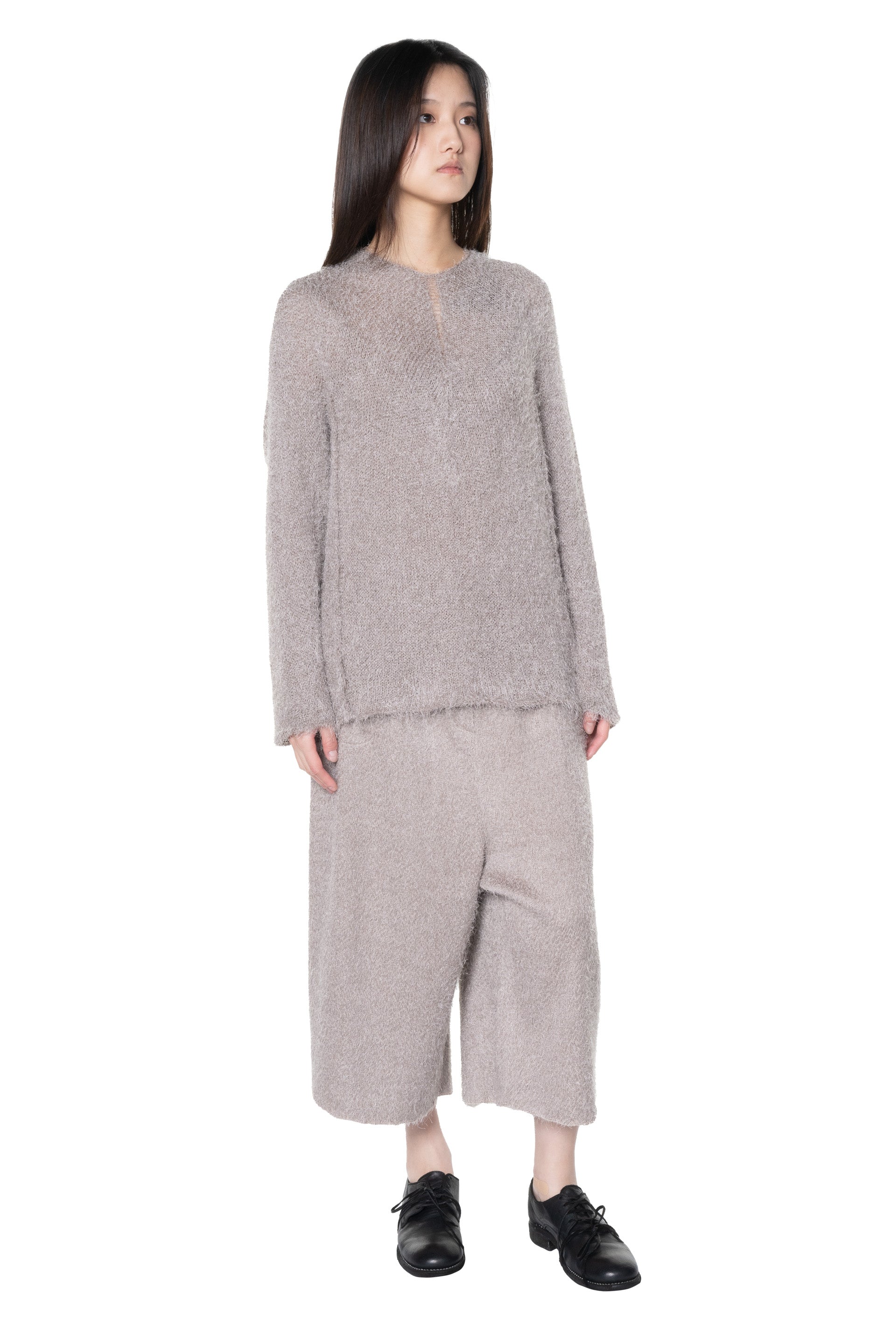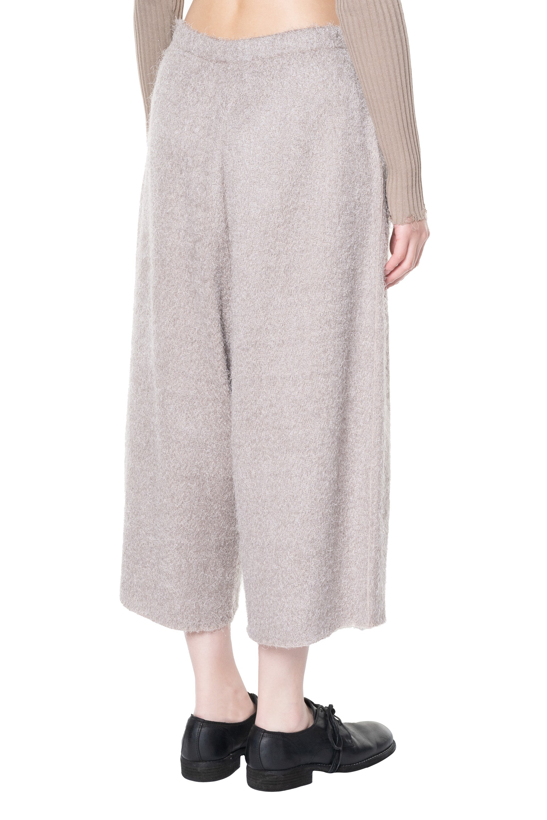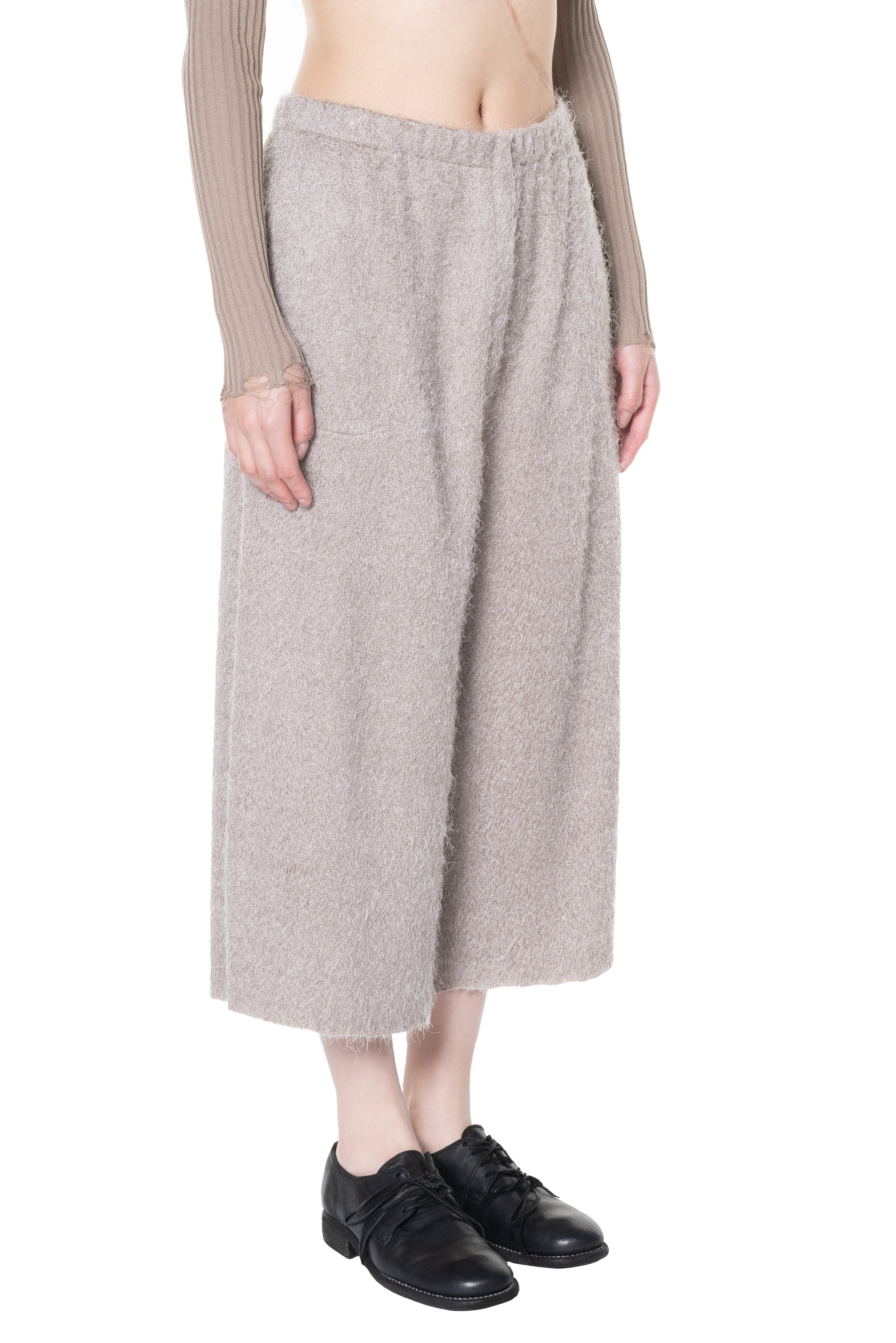 Boboutic consider knits an ideal medium, since its versatility allows conceiving unique surfaces and unexpected shapes. The approach to knitwear is unpredictable, aiming at creating a product where materials and structures compensate each other as seen with the Grey Pink Skirt Pants.