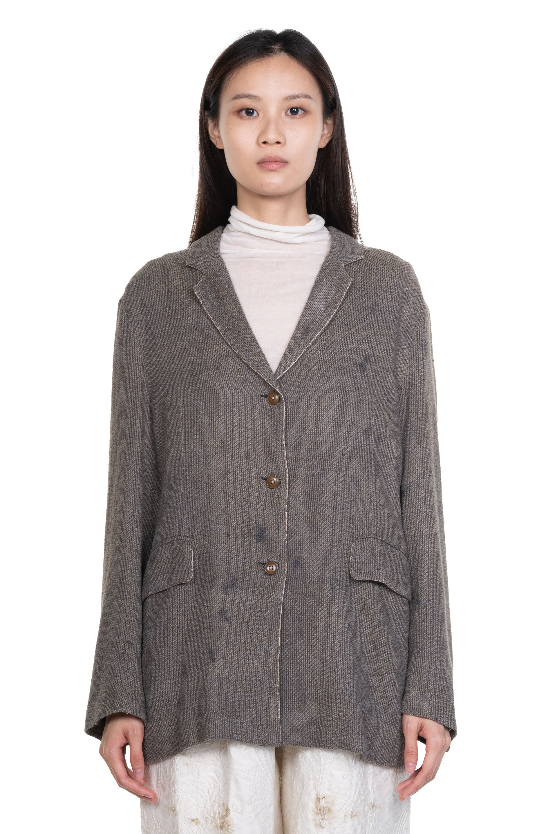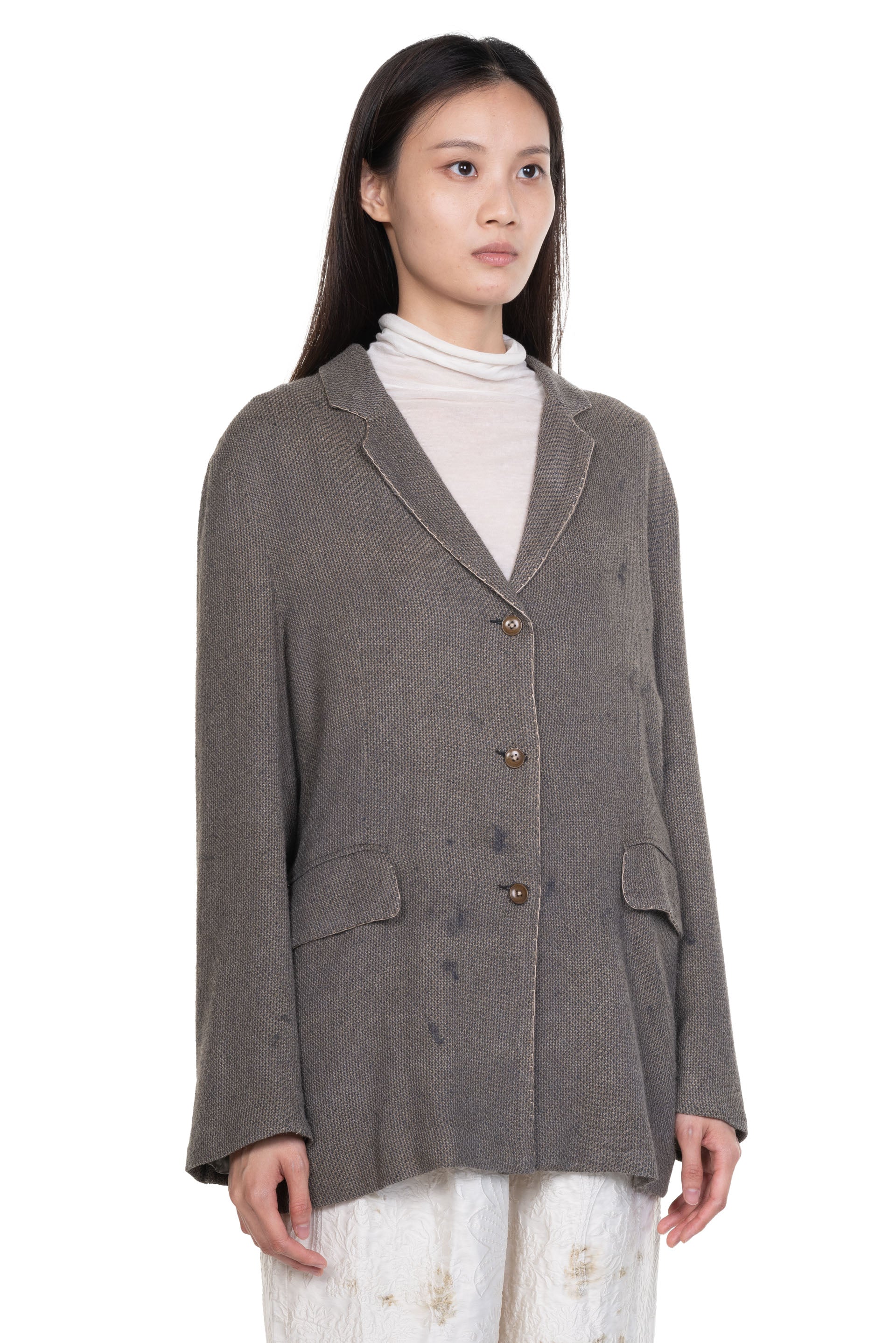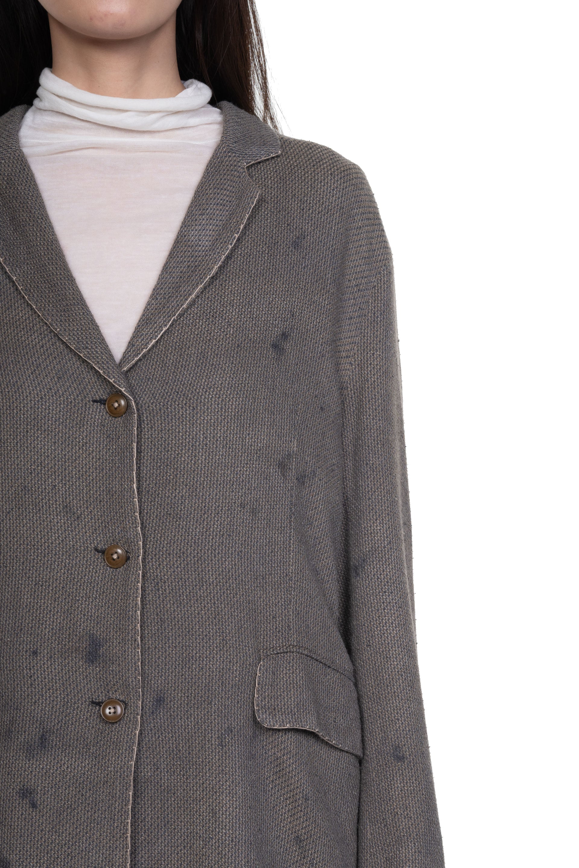 Grey jacket in Silk from Mute Dance. Long sleeves. Button closure at front. Metallic buttons. Signature dye throughout. Two front pockets. Lined.