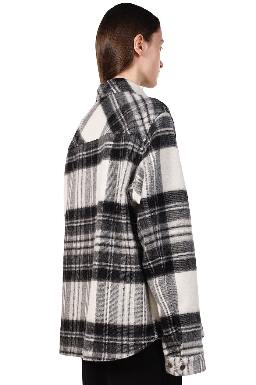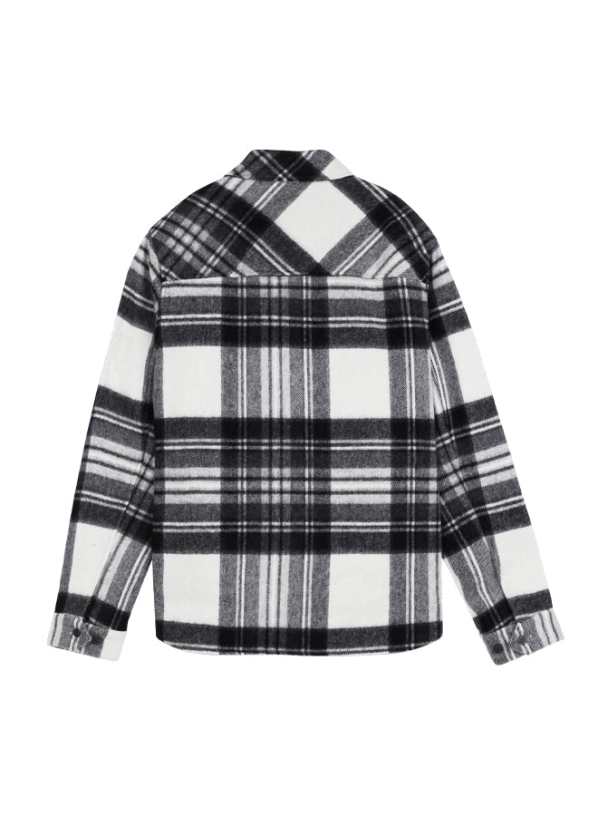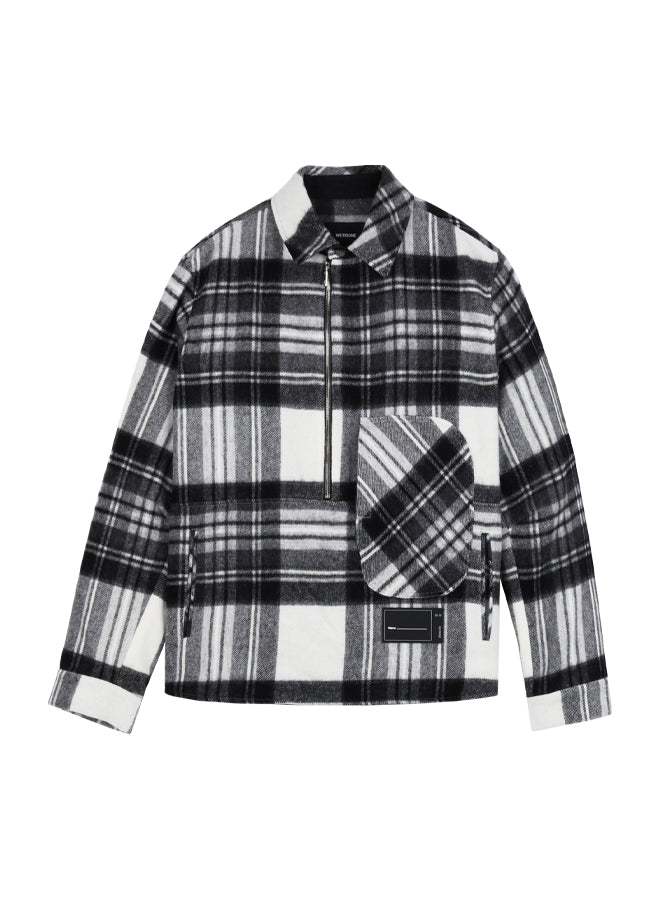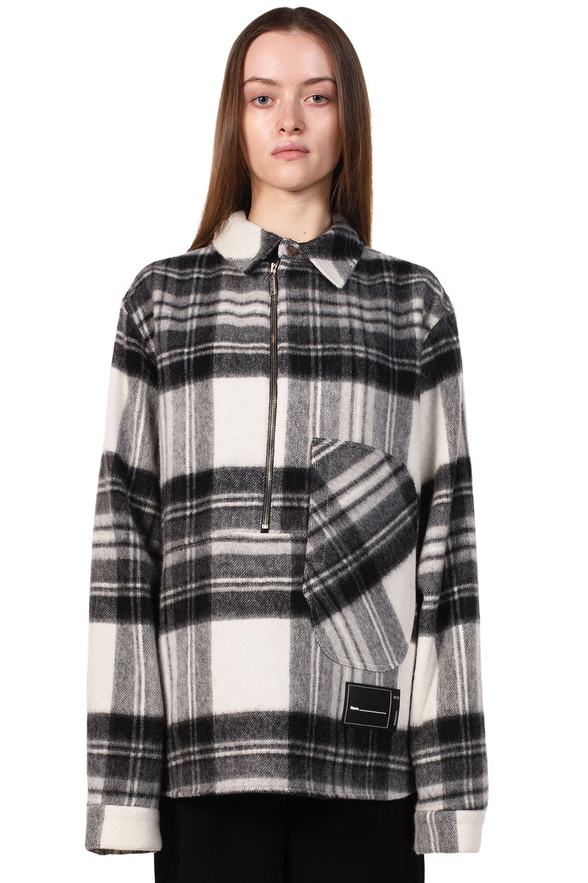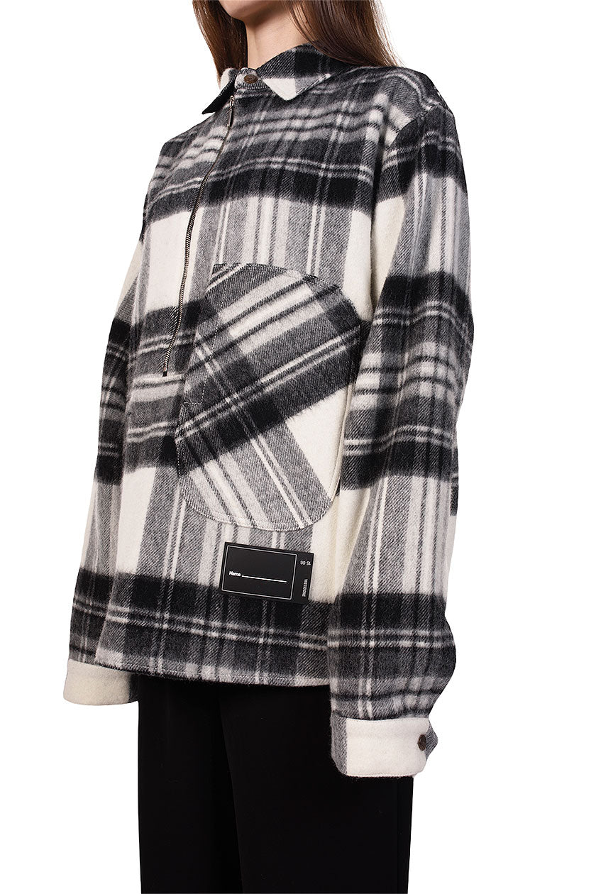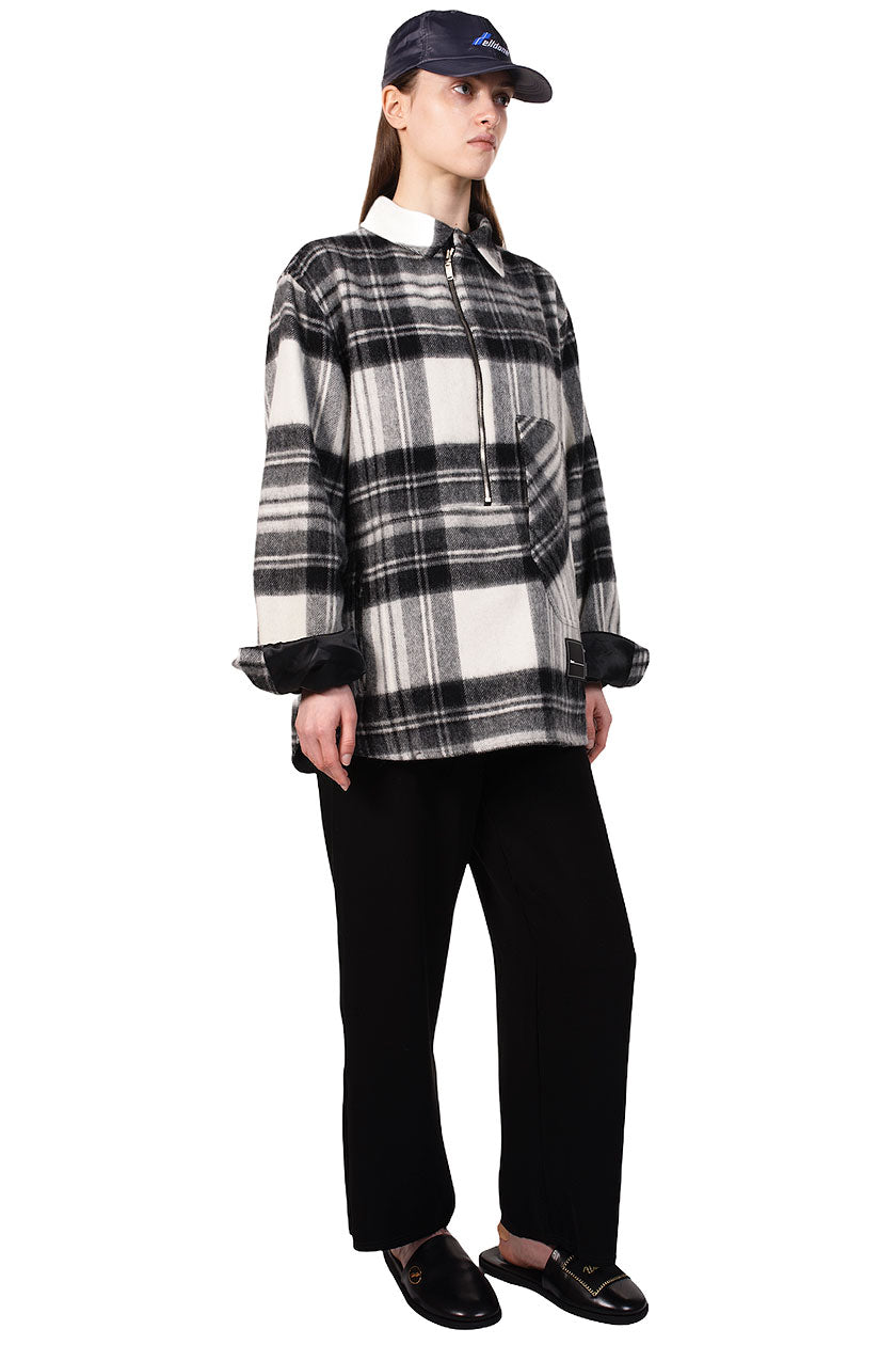 Long sleeve wool jacket featuring check pattern in grey, white, and black. Button fastening at spread collar. Half-zip closure at front. Welt pockets at waist. Rubberized logo patch in black at front hem. Vented side-seams. Two-button barrel cuffs. Fully lined. Silver-tone hardware.