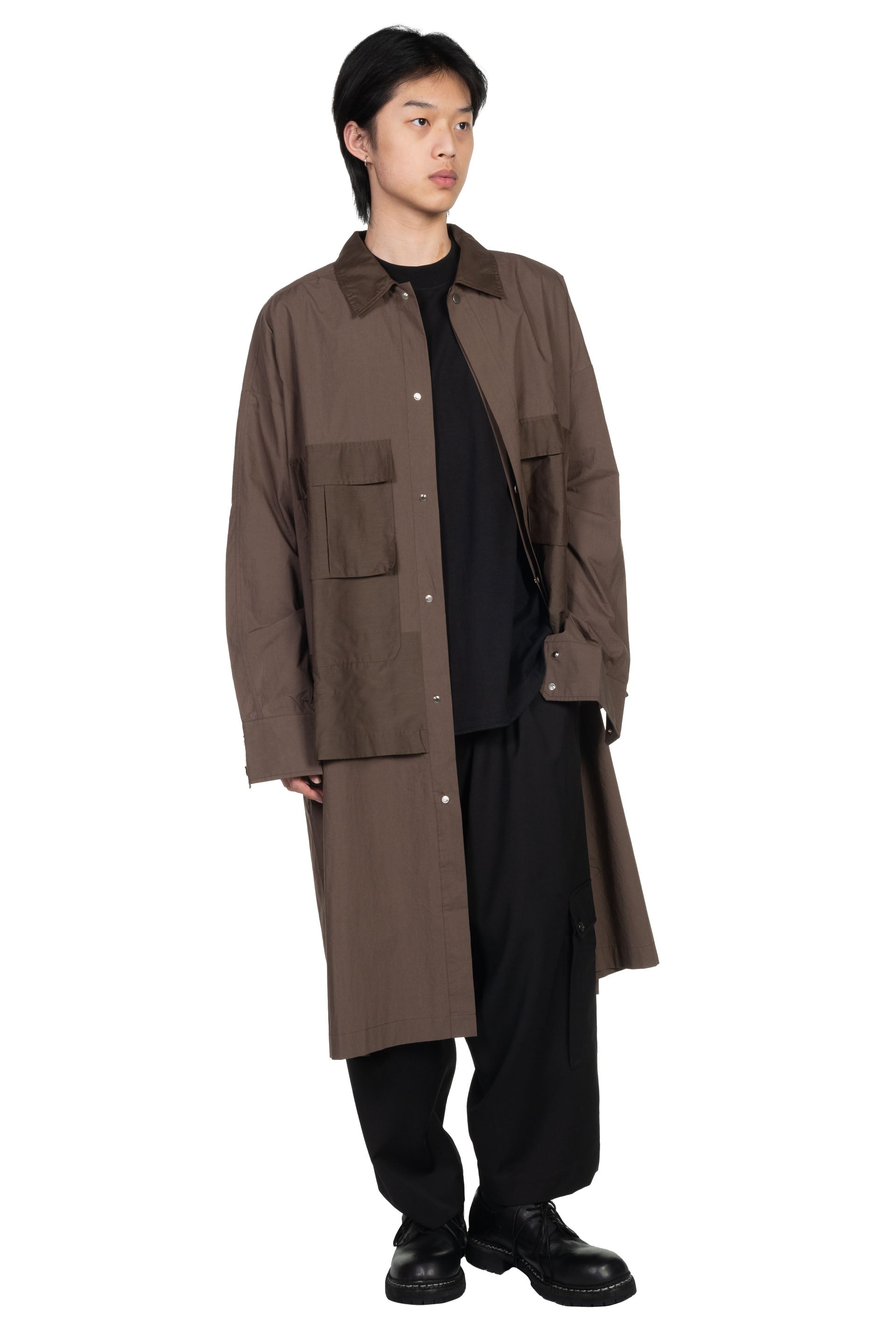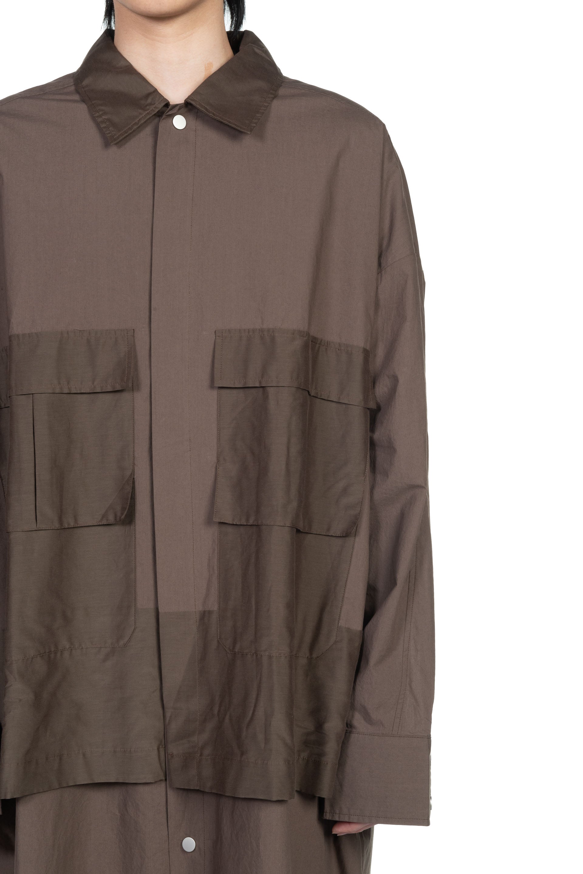 Oversized layered outer with a concealed snap button closure. Shirt collar and two sets of stack pockets at the chest. The pocket bag of the upper pocket doubles as the pocket flap of the one below it. Tonal elasticised drawstrings with matte silver fastenings at side seams. Box pleat and a single vent at the back bodice with two concealed snap button fastenings.