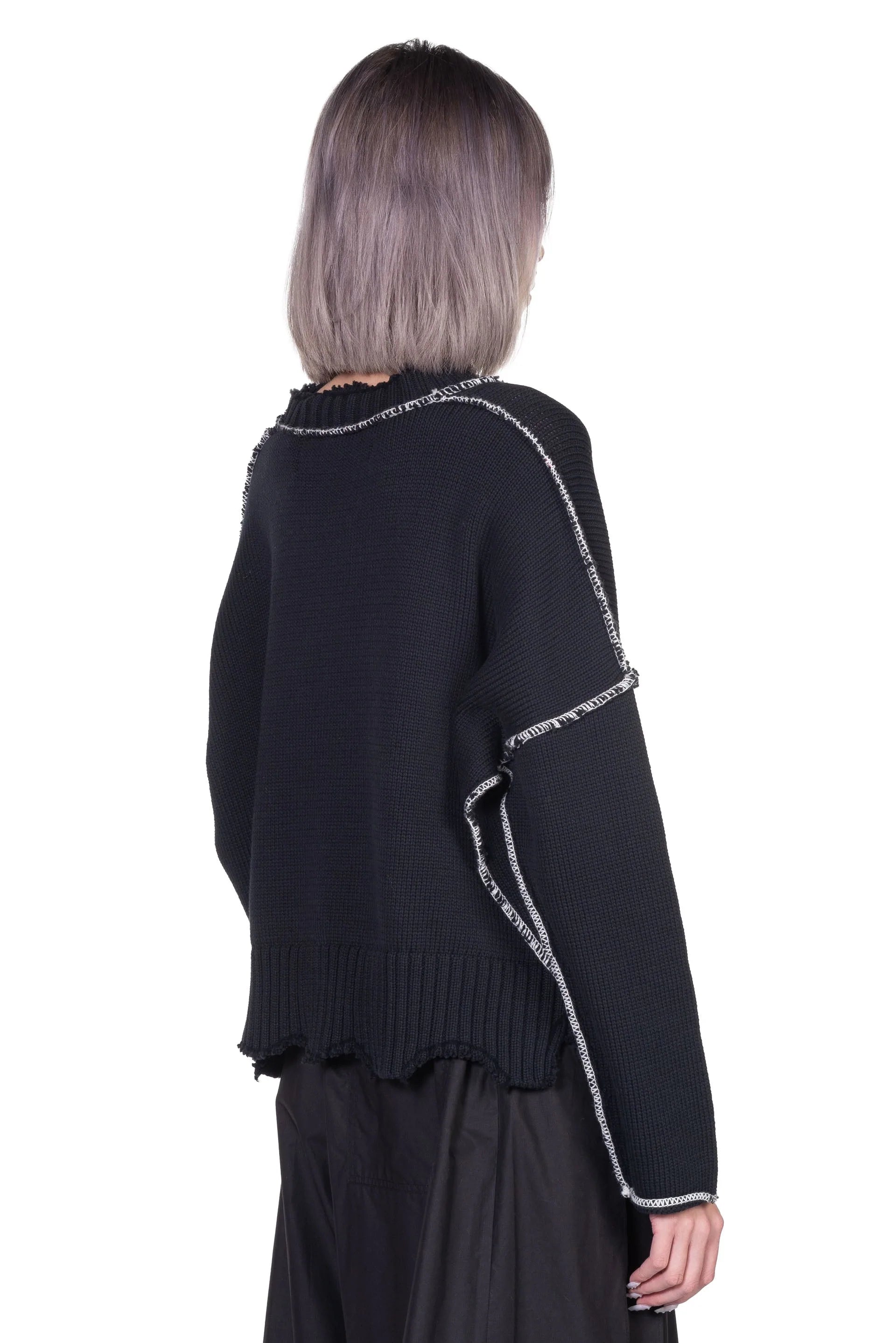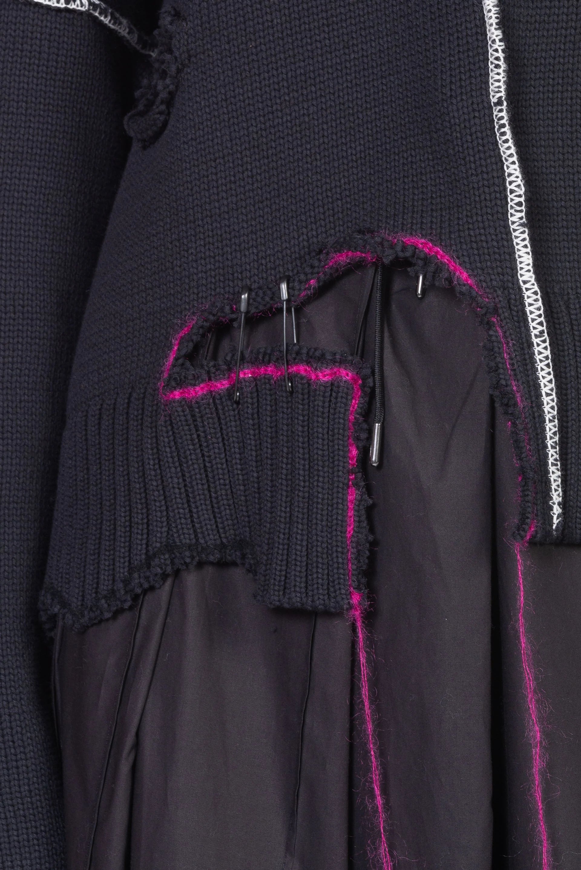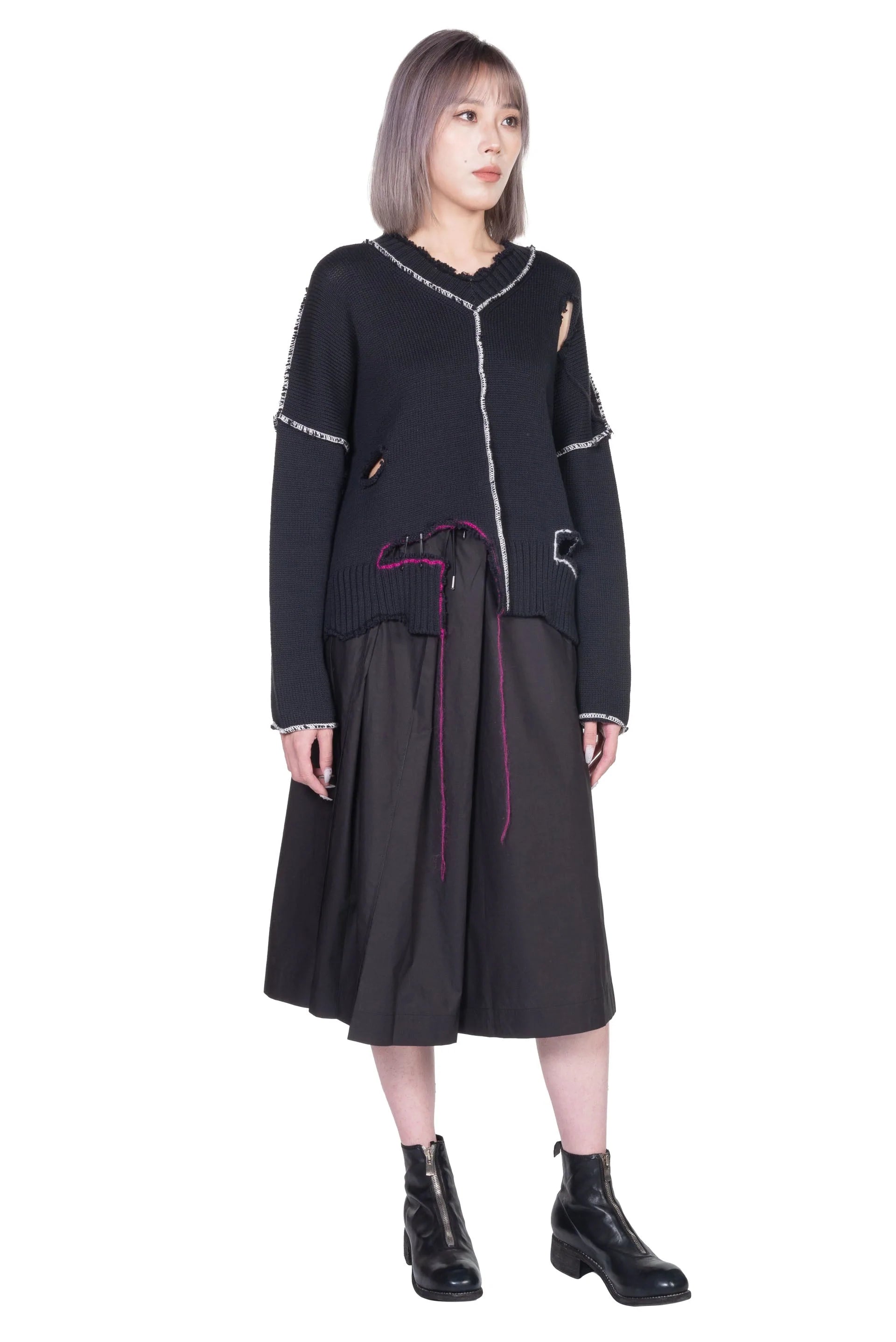 V-neck cotton jumper with ripped and cut out hand made details. External coloured seams and floating threads. Regular fit.