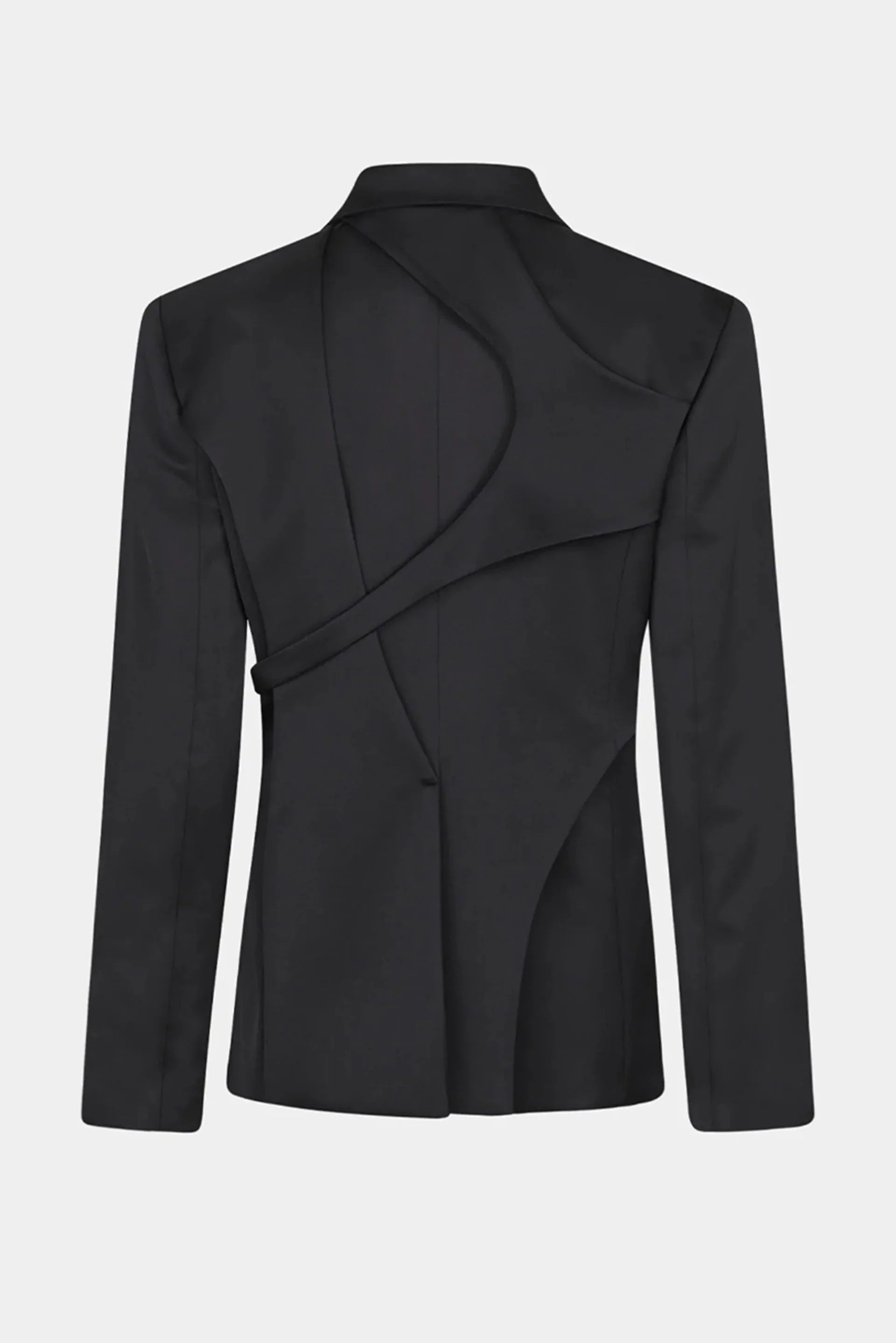 Shaped seams details and curved back panels. Cut out opening on the right side of the body. Harness shaped layer with g-hook closure. Asymmetric curved hem at left side. HE metal plate logo on the lapel. Centre front closure with concealed HE press button. Heliot Emil TM recycled polyester jacquard lining.