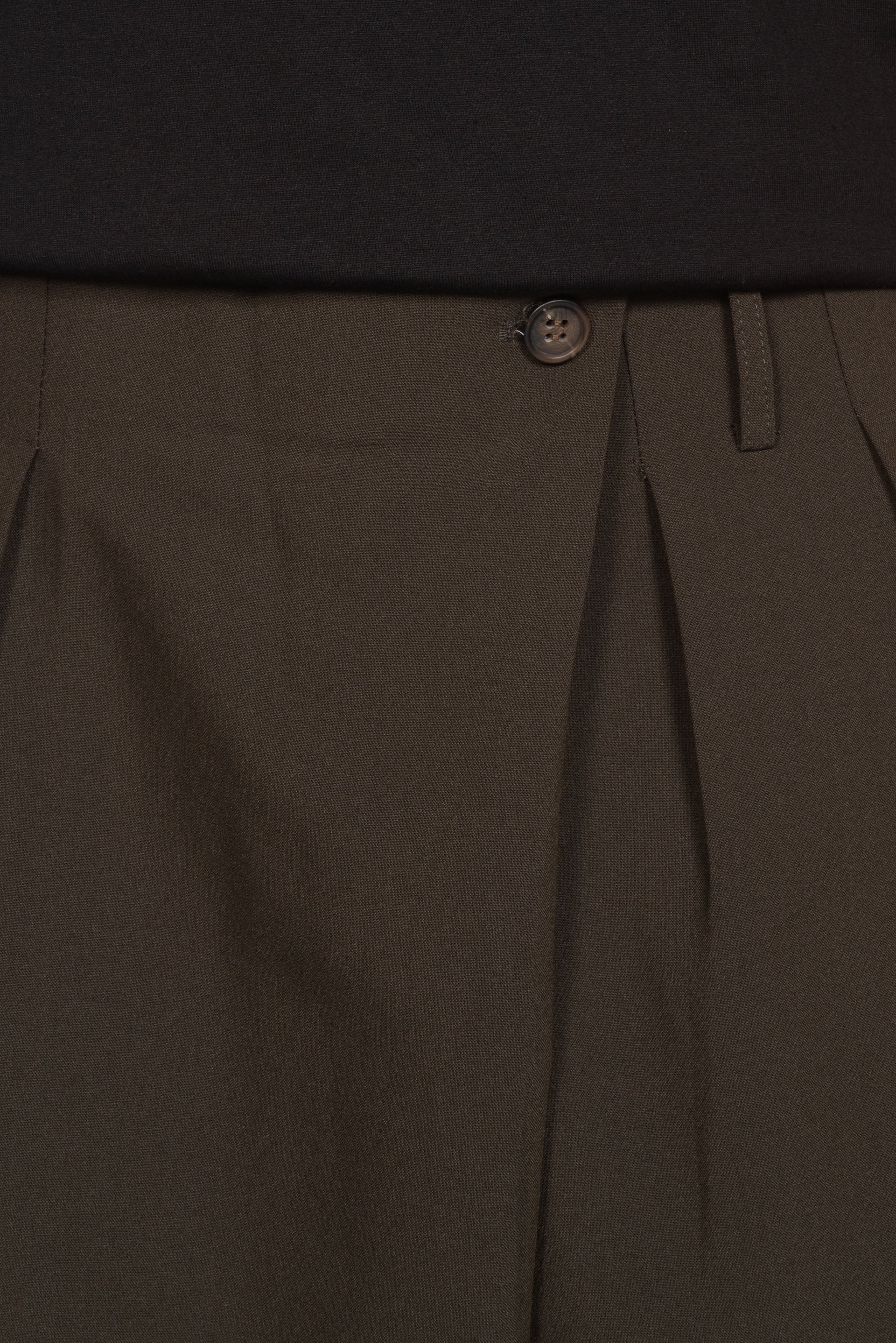 Kar High Waist Trouser Black Olive. Button and zip closure at waist. Two side pockets. Pleat at front. Stretchy wool.
