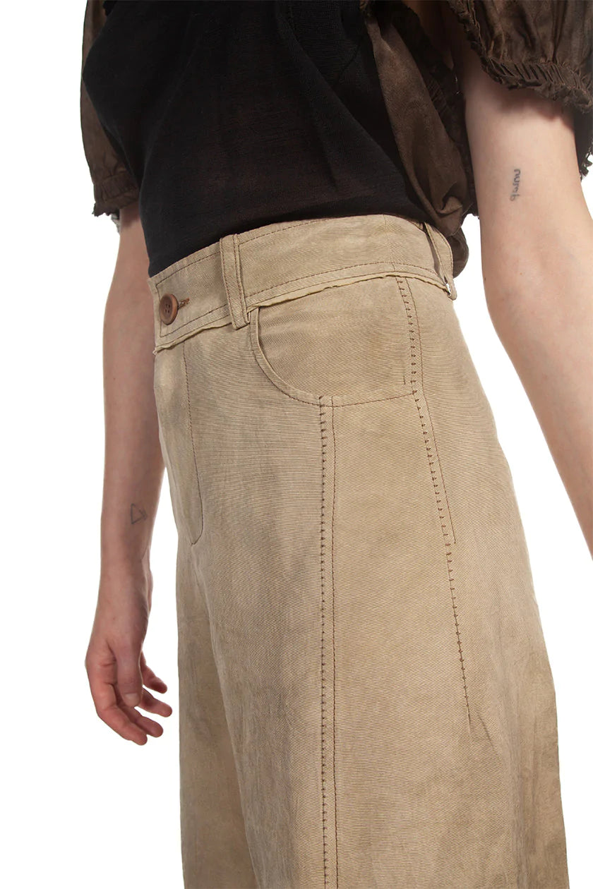 Regular fit, straight leg pants. Zip fly closure with single button fastening. Belt loops on waistband. Curved front pockets. Vertical seam stitch details. Raw edge finish.