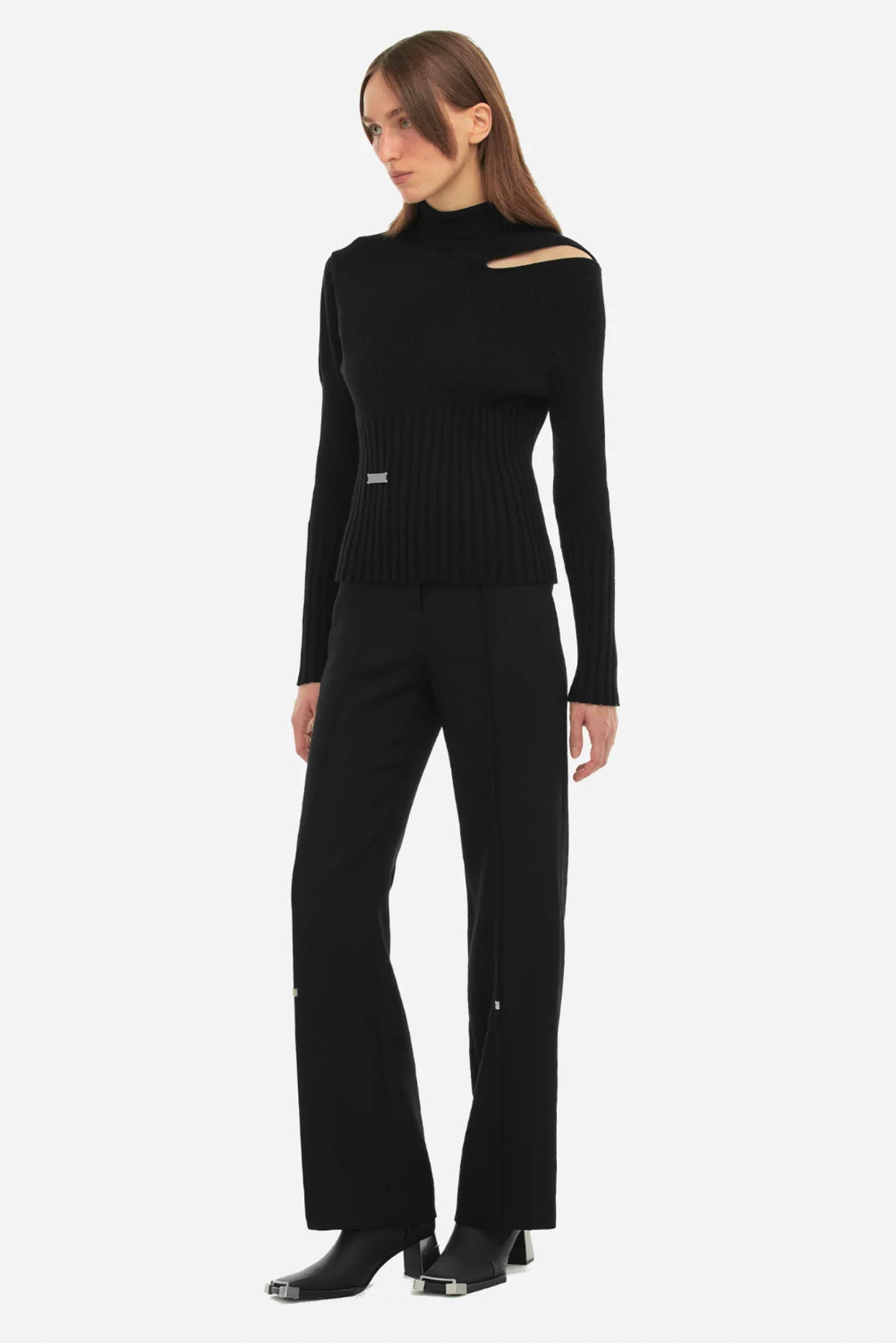 Turtleneck Collar. Panelled Knits Pattern Throughout. Hollow-Out Detail At Shoulder. Hand Stitched Logo Engraved Metal Tag At Front.