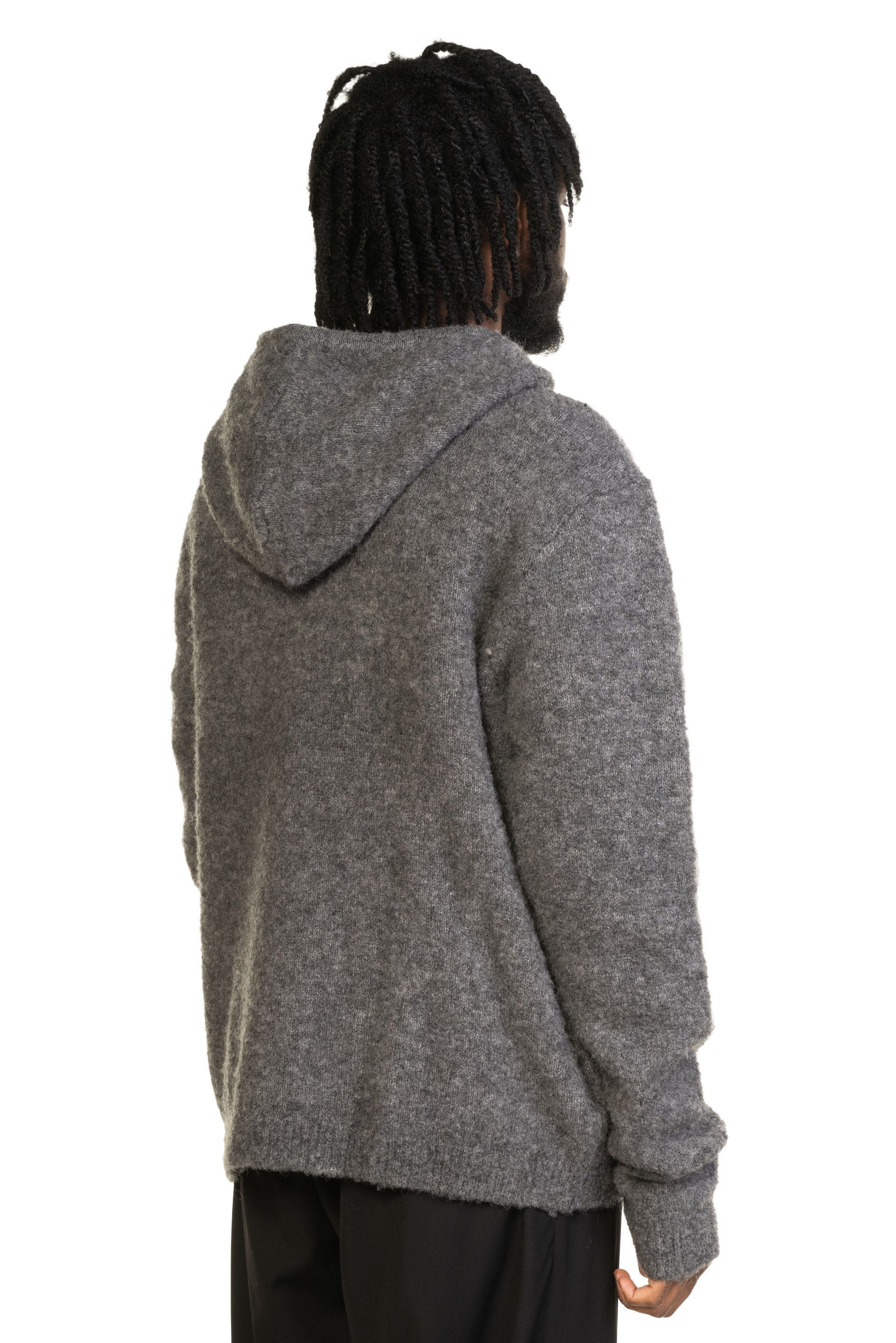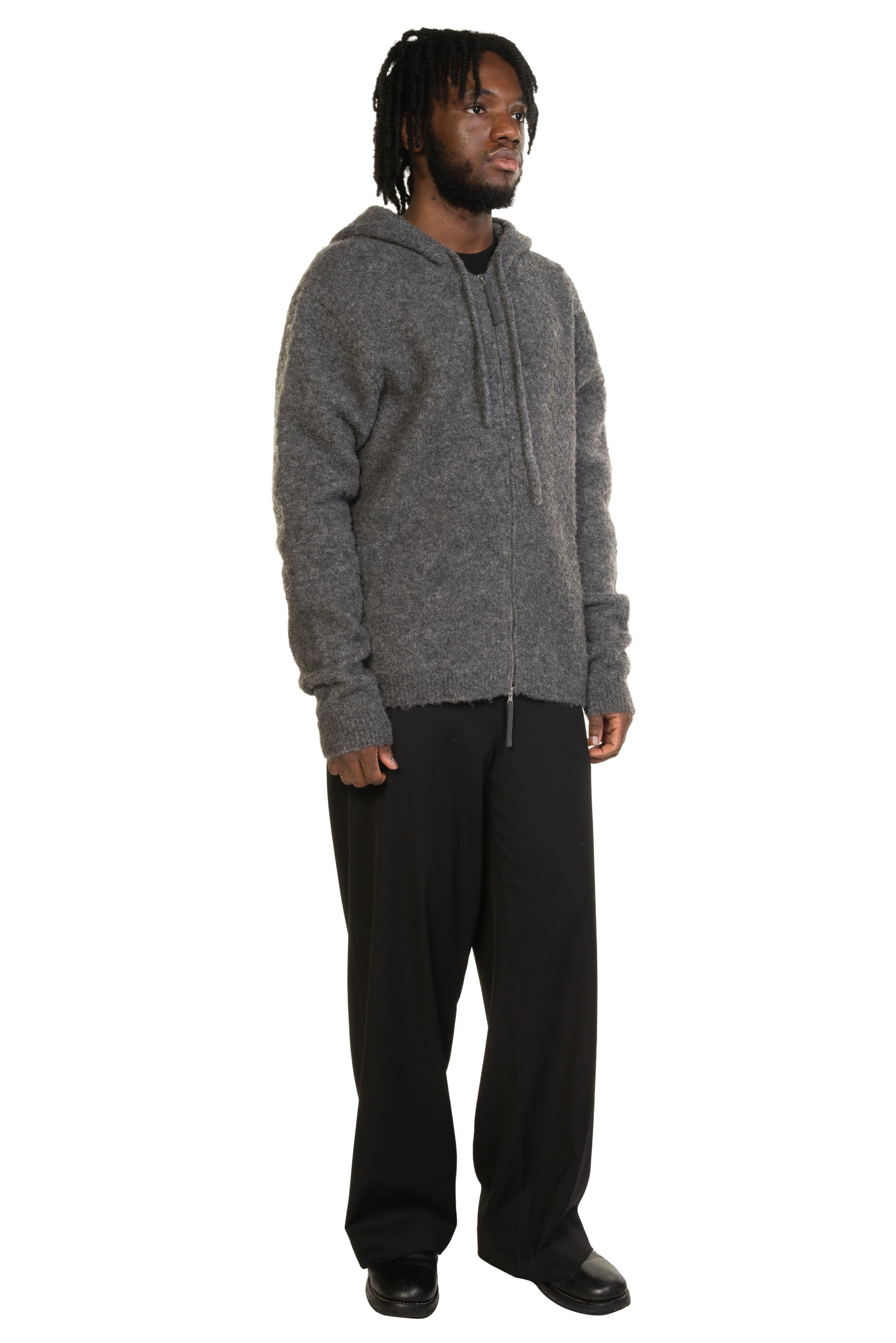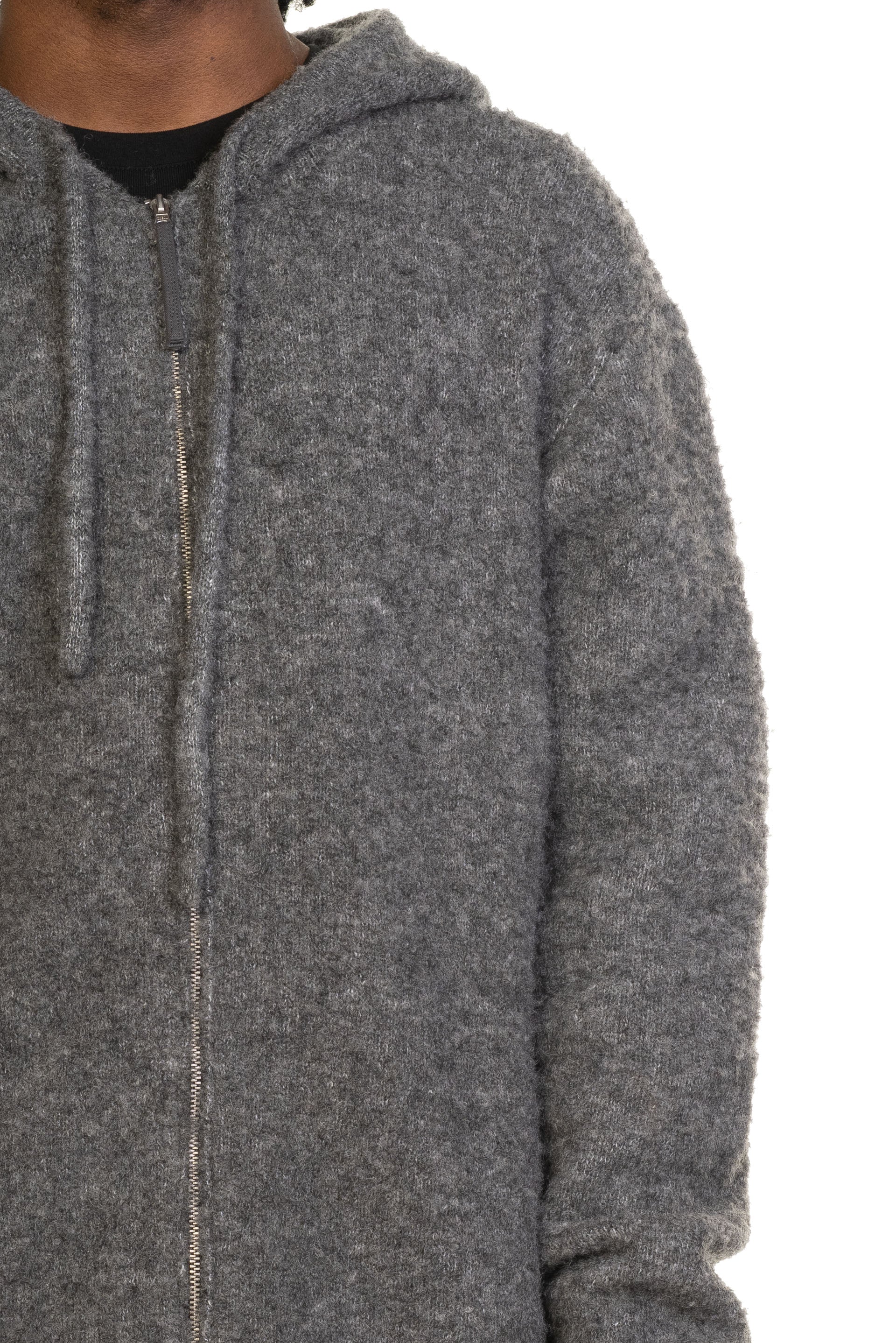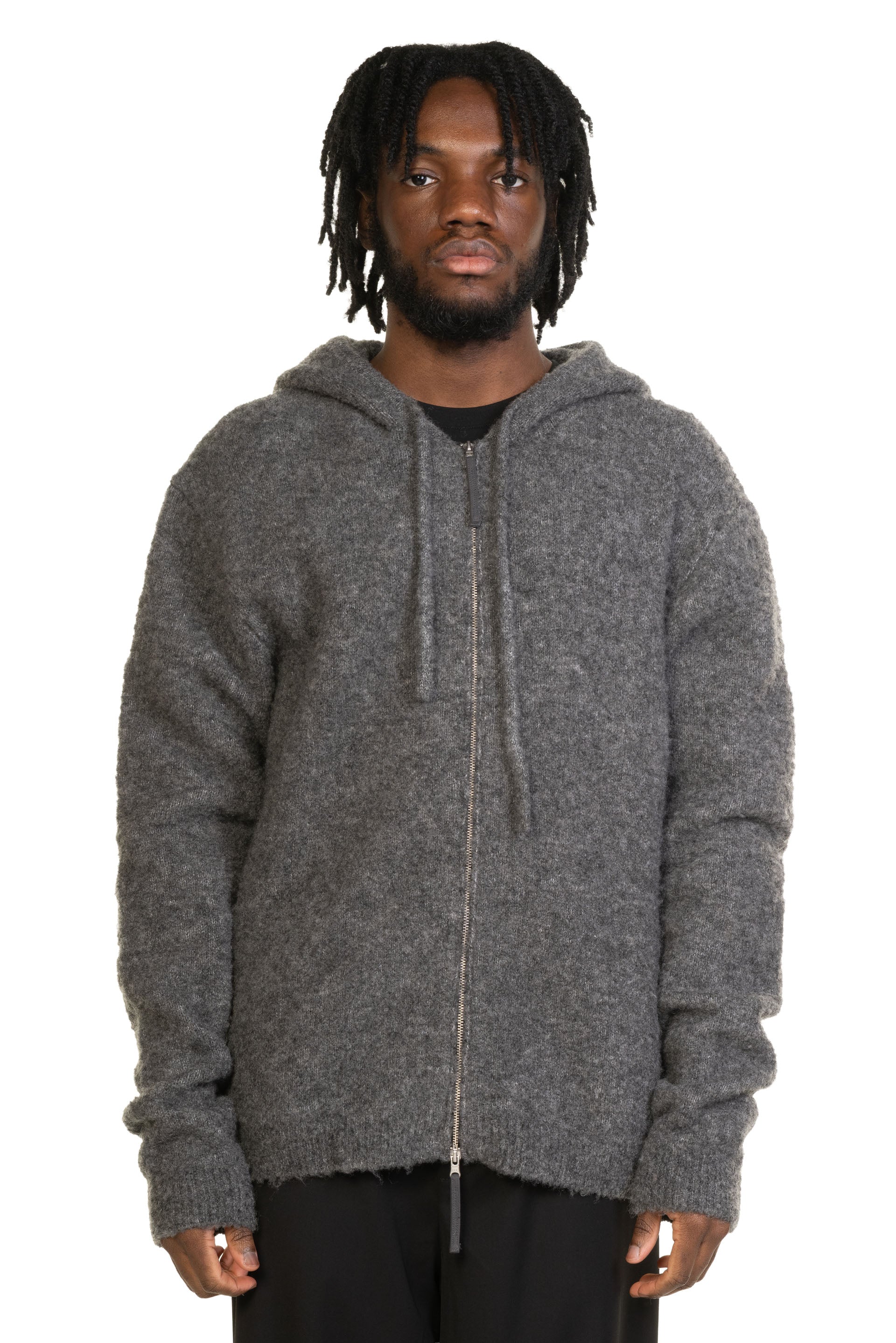 Attempt knitted hoodie in Dark Grey. Long sleeves. Double zip closure at front. Soft textural fabric. Two side pockets. Drawstrings at hood.