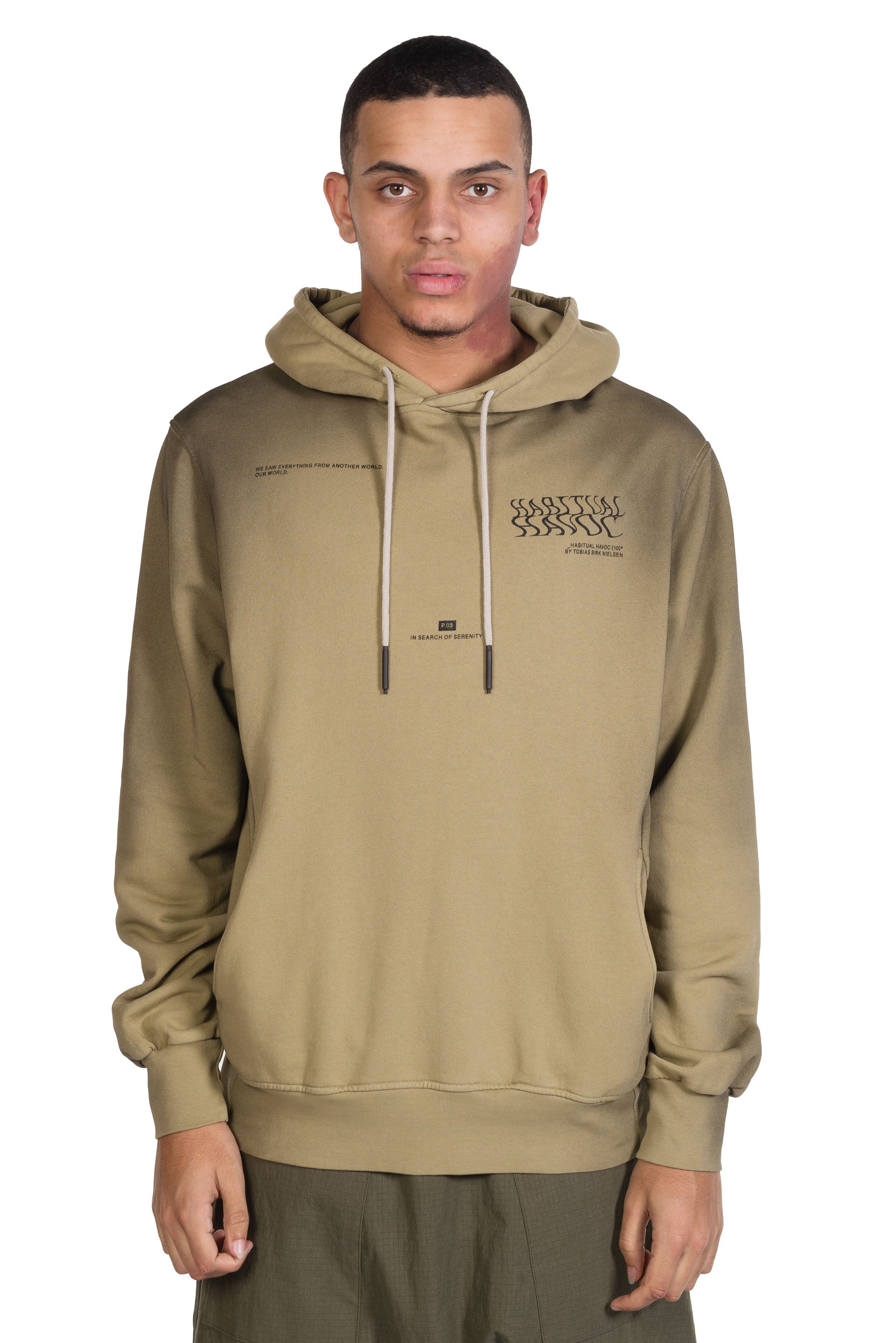 Tobias Birk Nielsen Hoodie with Print. Drawstring at hood. Iso Poetism print at front and back. Green dye colour throughout. Two side pockets.
