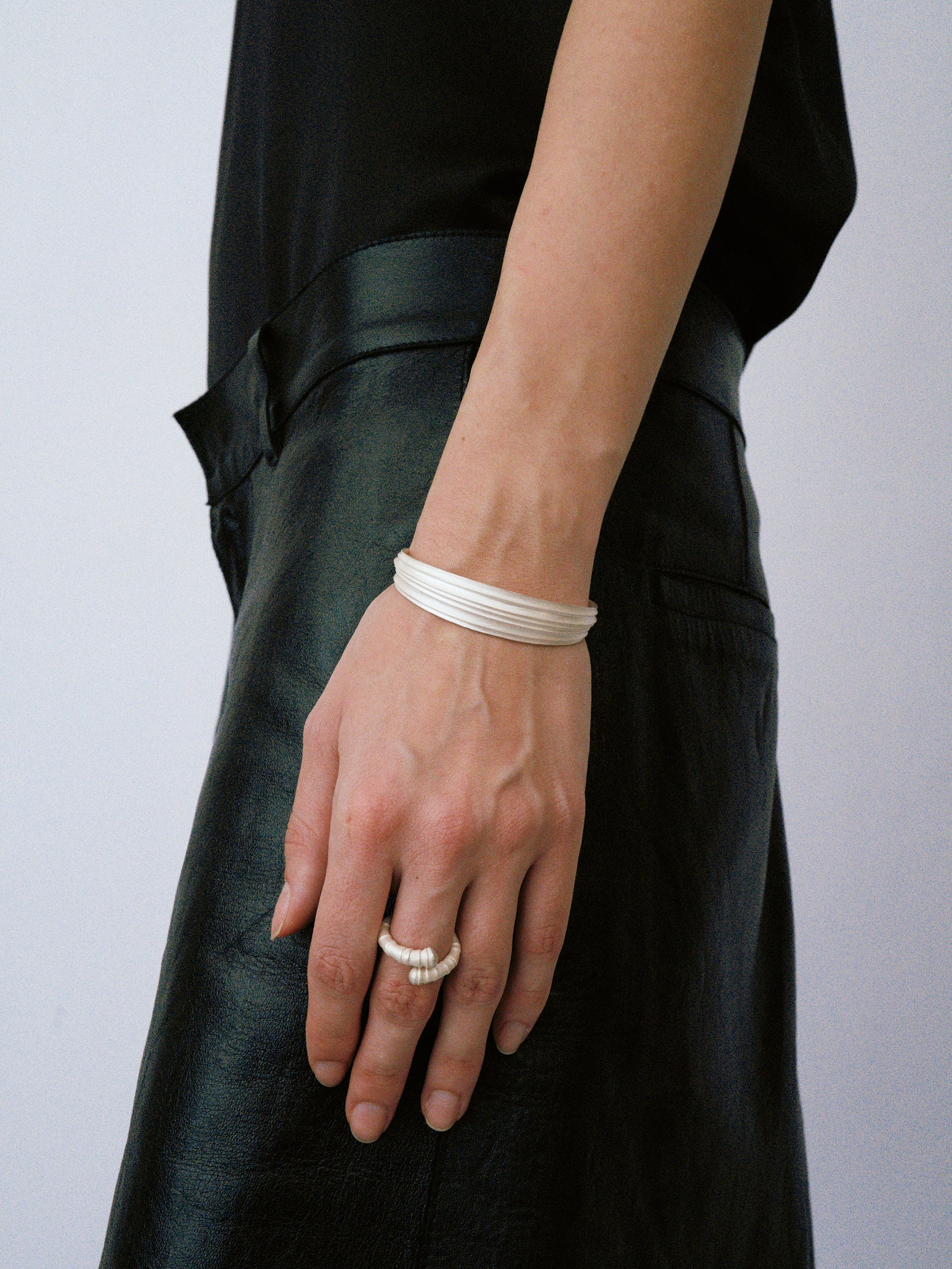 OLIO E ACETO is raw and authentic. It is about the companionship between people, and objects like the matte white surface becoming a blank canvas to be filled by the wearer as seen with the Horn Ring.