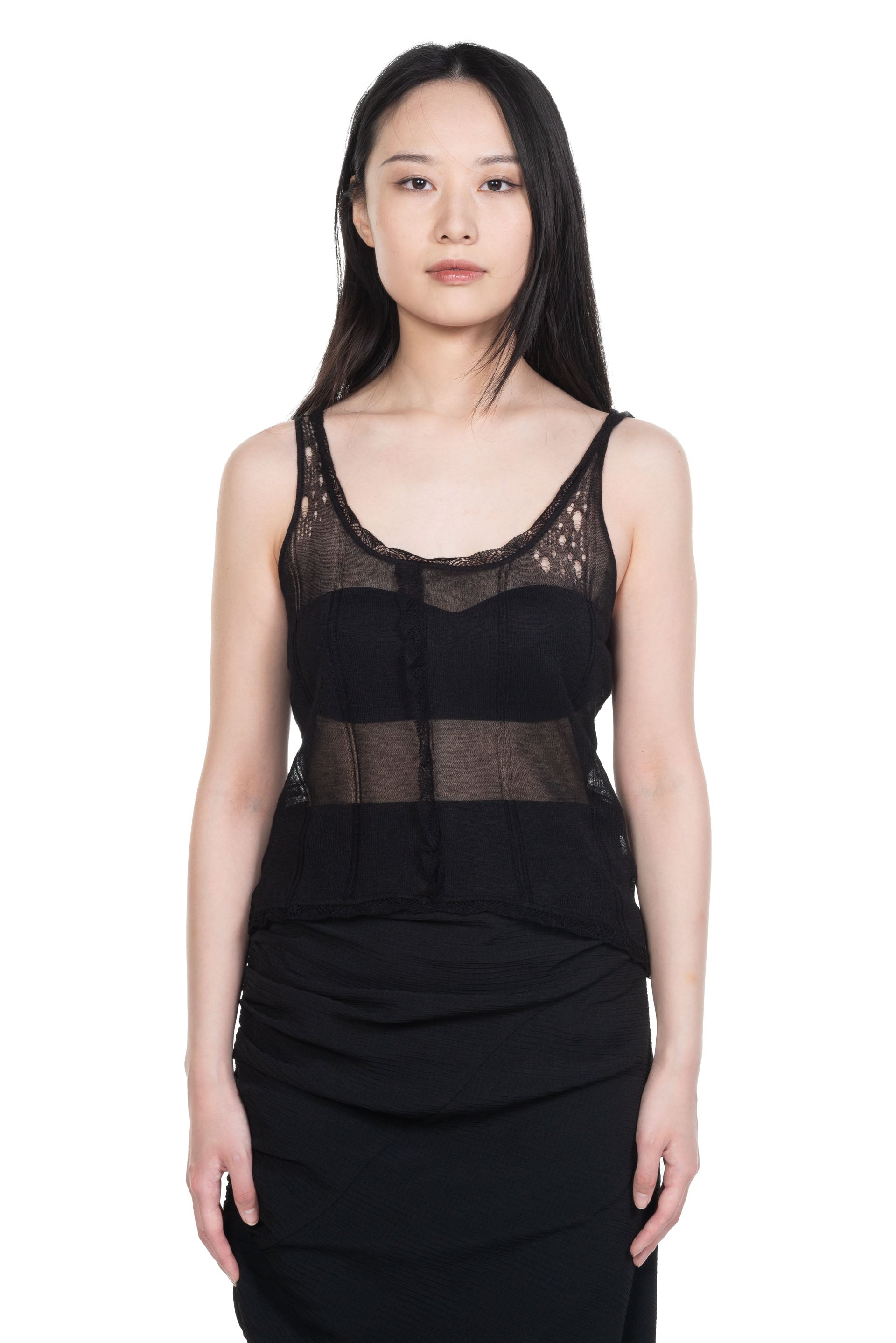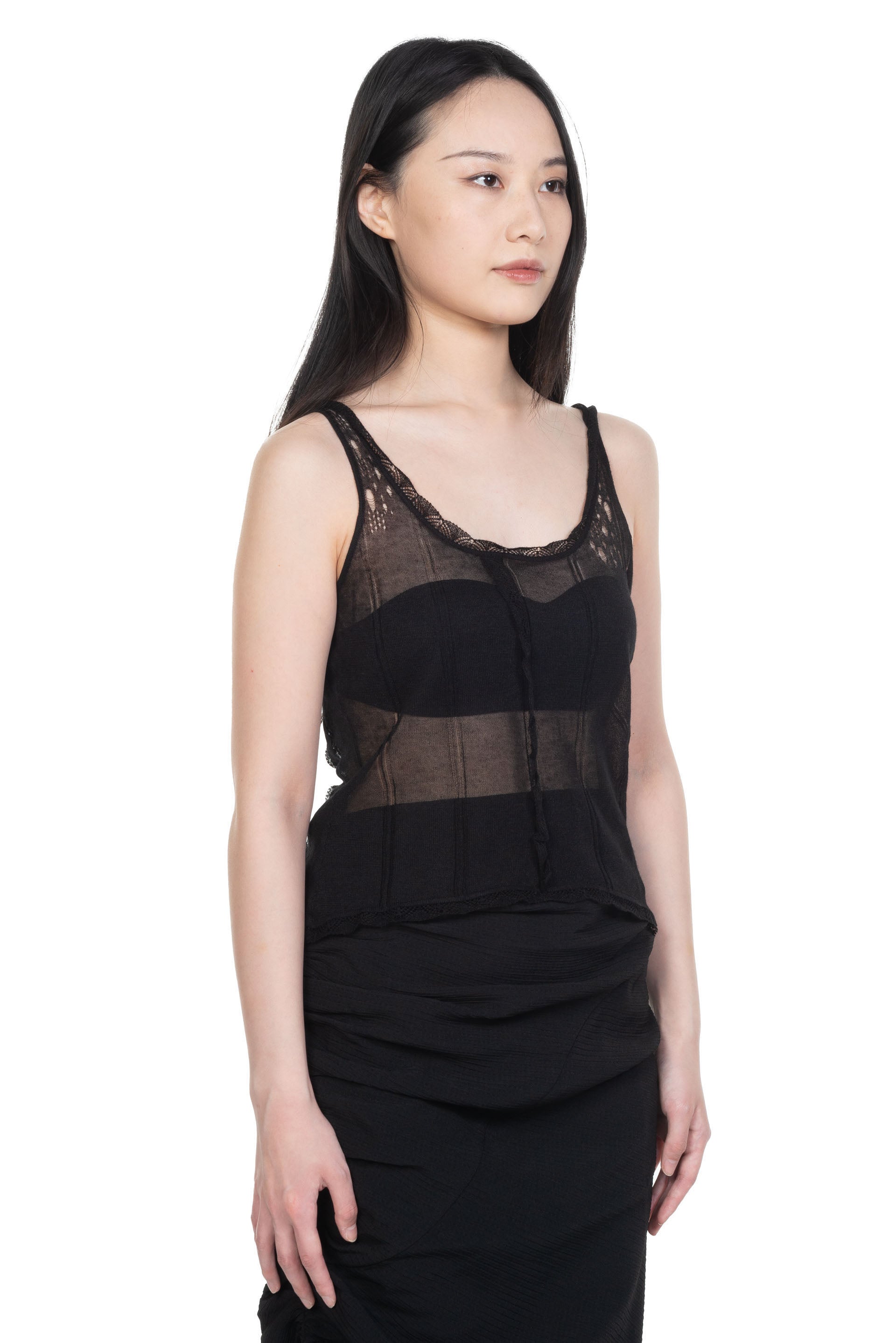 Sleeveless. Lace details on edges. Distressed details. Contrast fabric throughout. Slightly see through.