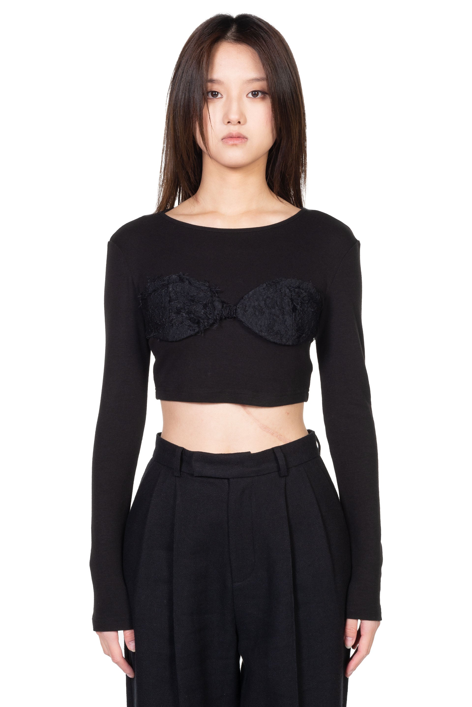 Long-sleeved knit top. Textured jacquard corset overlayed design. This crop gives a modern touch to a everyday look. Long-sleeved. Corset overlay silhouette. Slim-fit. Crop Top.