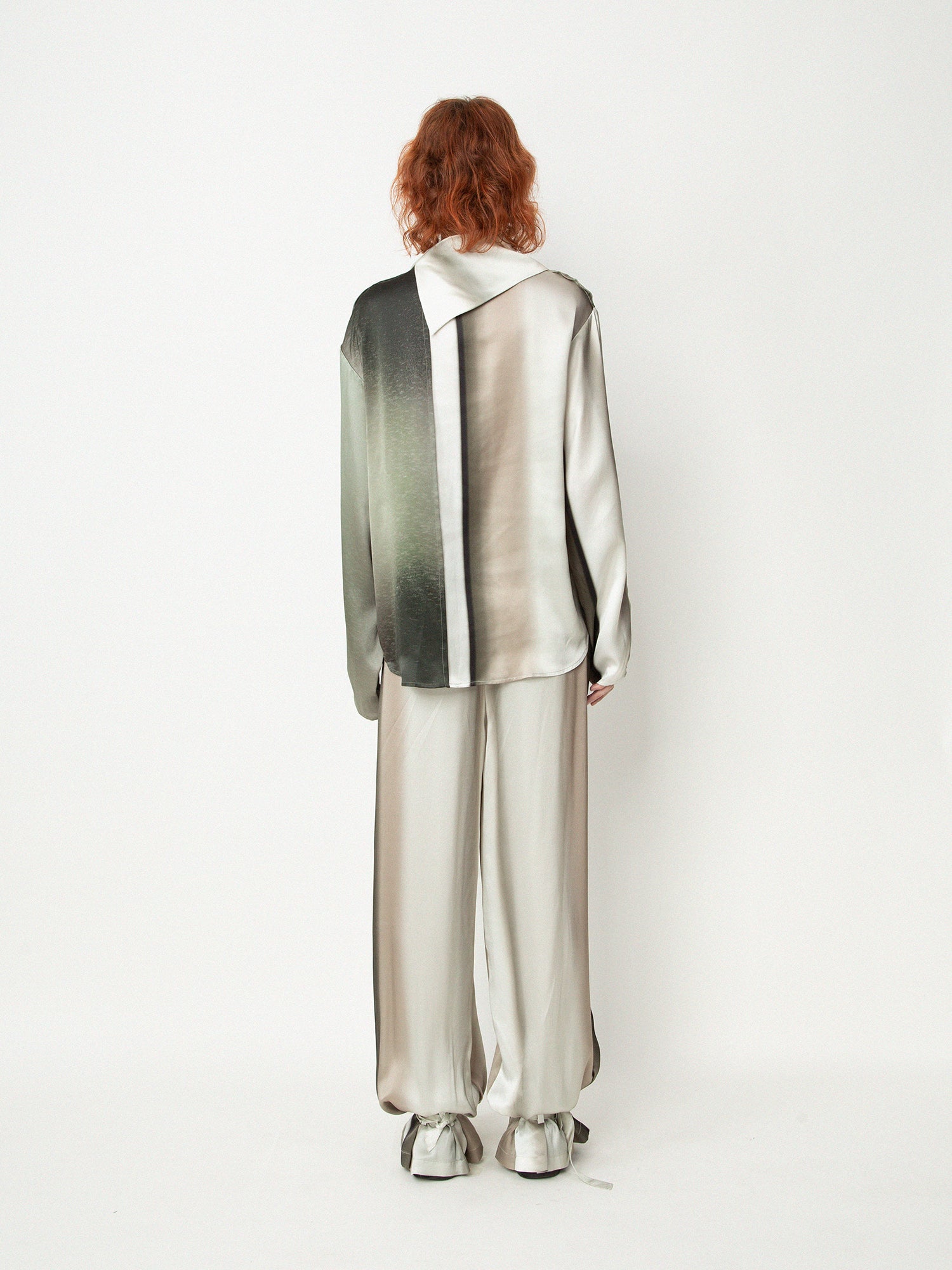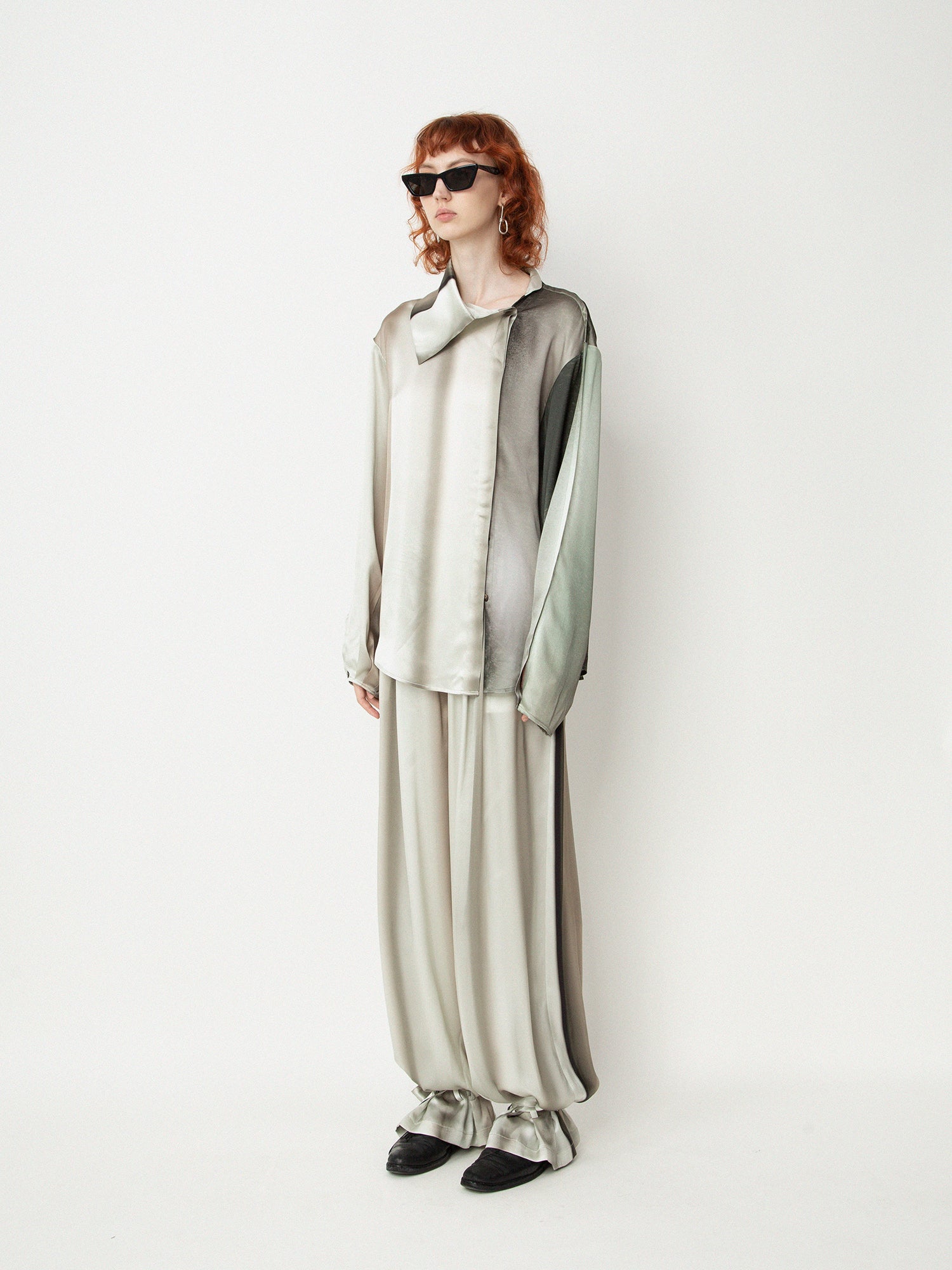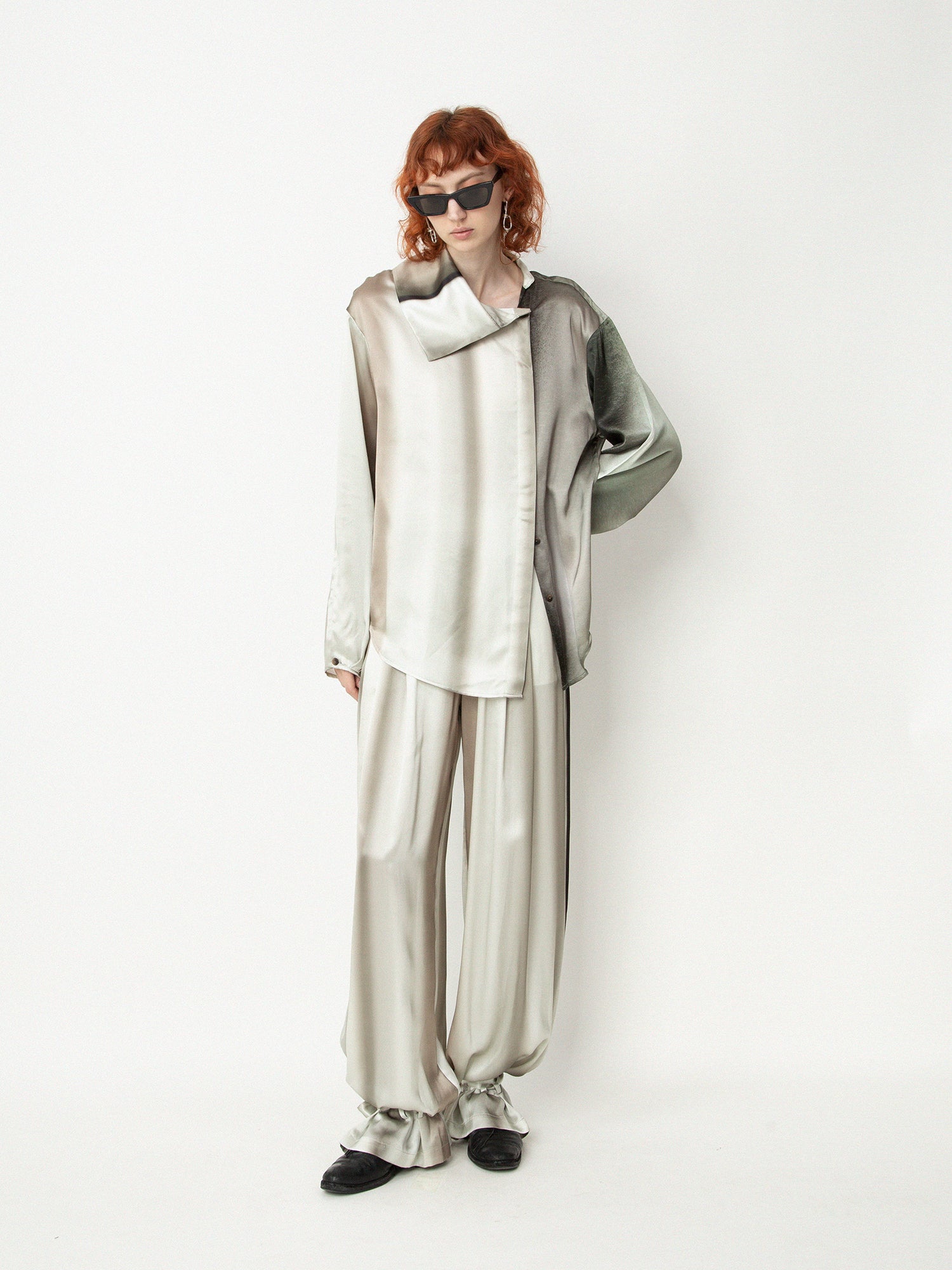 ii delivers a sense of originality, simplicity, spontaneity and a hint of childlike innocence pushing boundaries among ages to present qualitative collections with timeless touches designed for independent individuals as seen with the Ink Moss Prints-Silk Asymmetric Shirt from ii sense.
