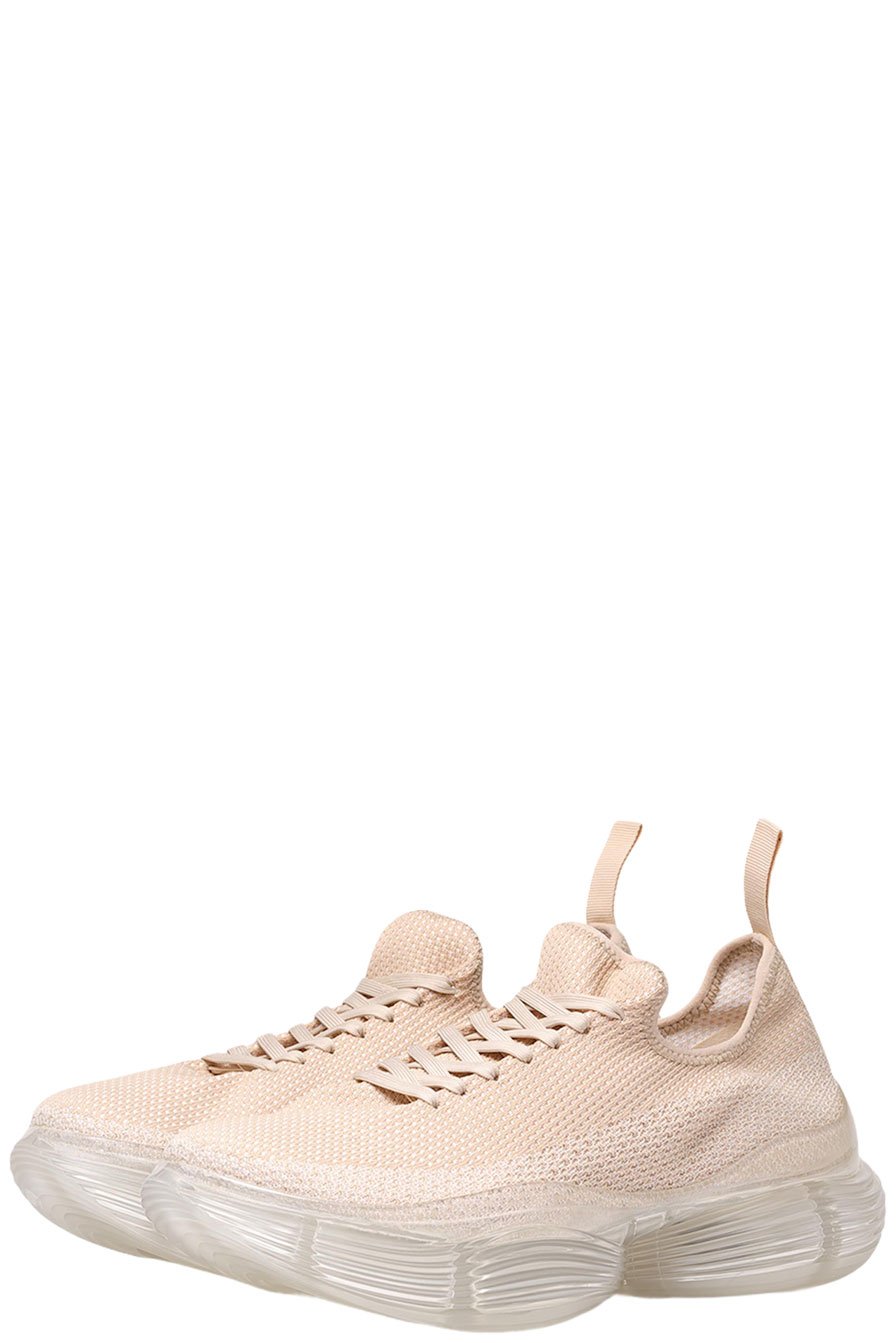 The distinctive shape of these shoes will make you feel as if your feet effortlessly glide in front of each other once you put them on. By putting on a pair of these shoes, you will feel as though you could walk anywhere. Thick-soled clear soles made of transparent spheres reminiscent of interstellar jelly fish draw the wearer's and viewer's attention to wearer's feet. In addition, the flexibility of the material is controlled to provide optimal cushioning when worn, creating a fluffy, floating sensation that you can't feel when you touch them with your hands. The knit upper, which is simple in contrast to the distinctive shape of the outsole, is deliberately minimalist in order to match with a wide range of fashion. The height of the heel is about 4 cm for all sizes, and while the heel is voluminous, it is transparent to reduce the appearance of weight.