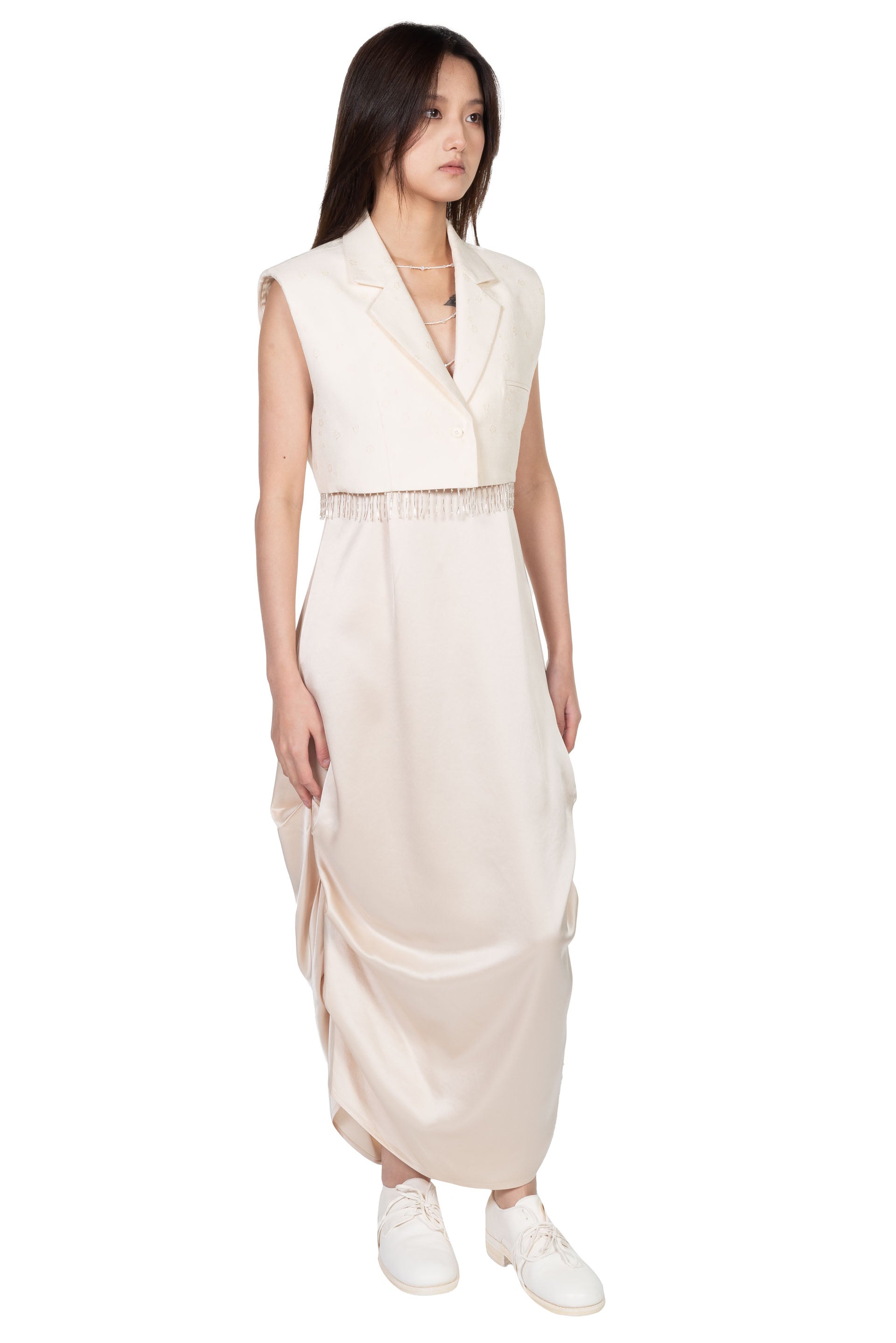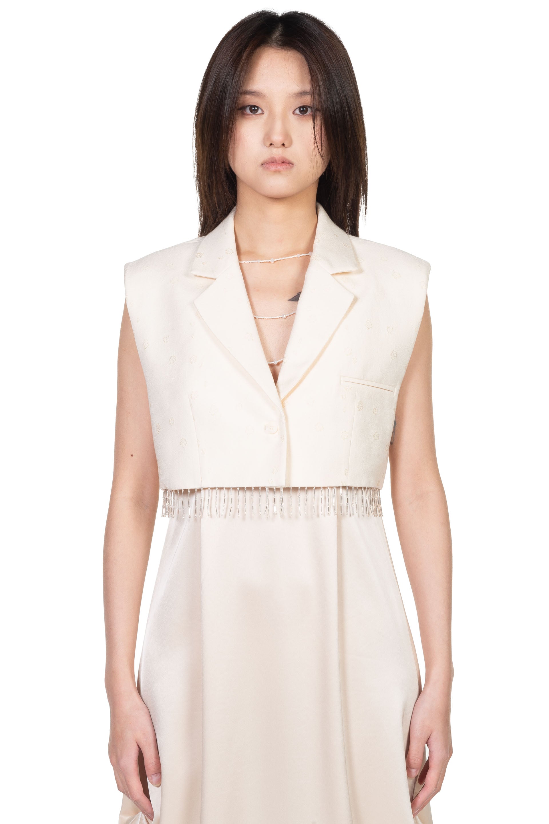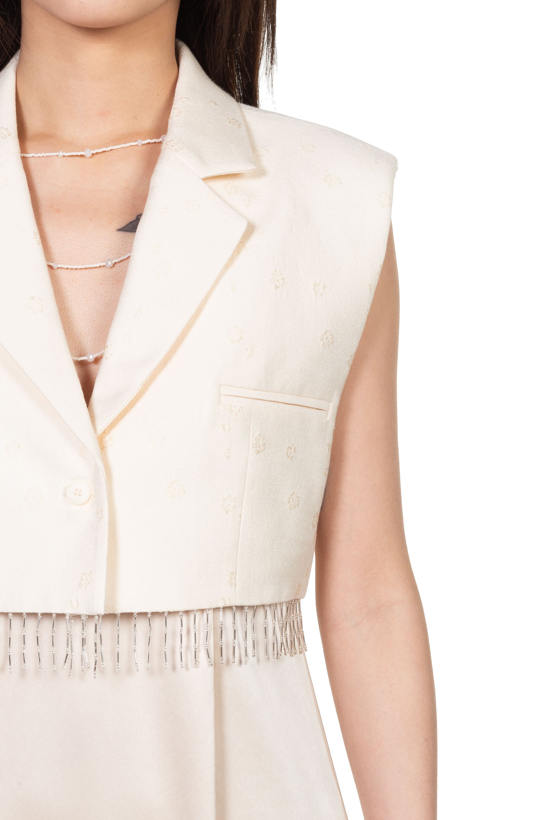Two in one Cropped Jacket. Classic lapel design. Hem embellished by light beaded tassels. High-waist. Long sleeves. Multiple ways of wearing.