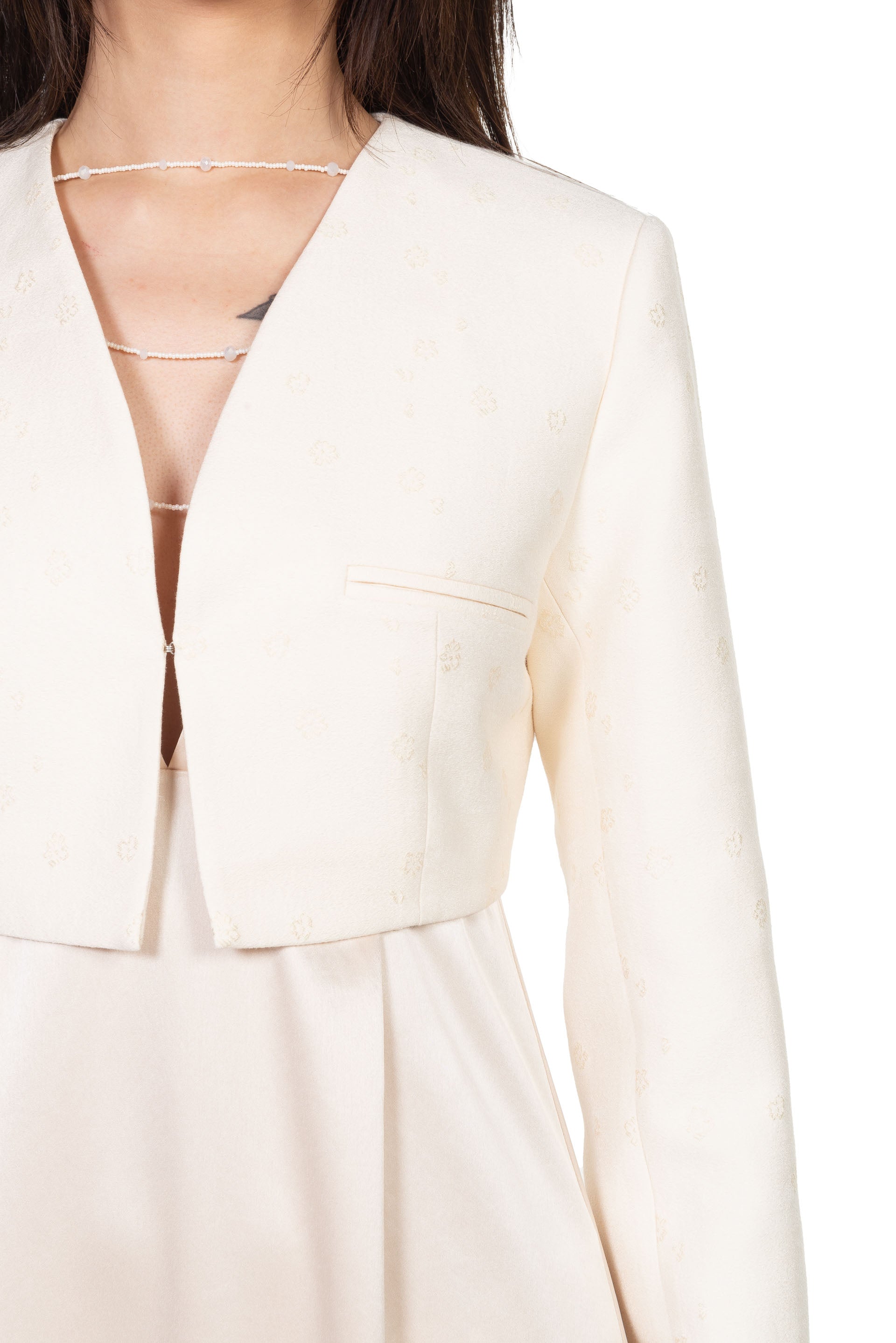 ii delivers a sense of originality, simplicity, spontaneity and a hint of childlike innocence pushing boundaries among ages to present qualitative collections with timeless touches designed for independent individuals as seen with the Ivory Beading Crop Jacket.