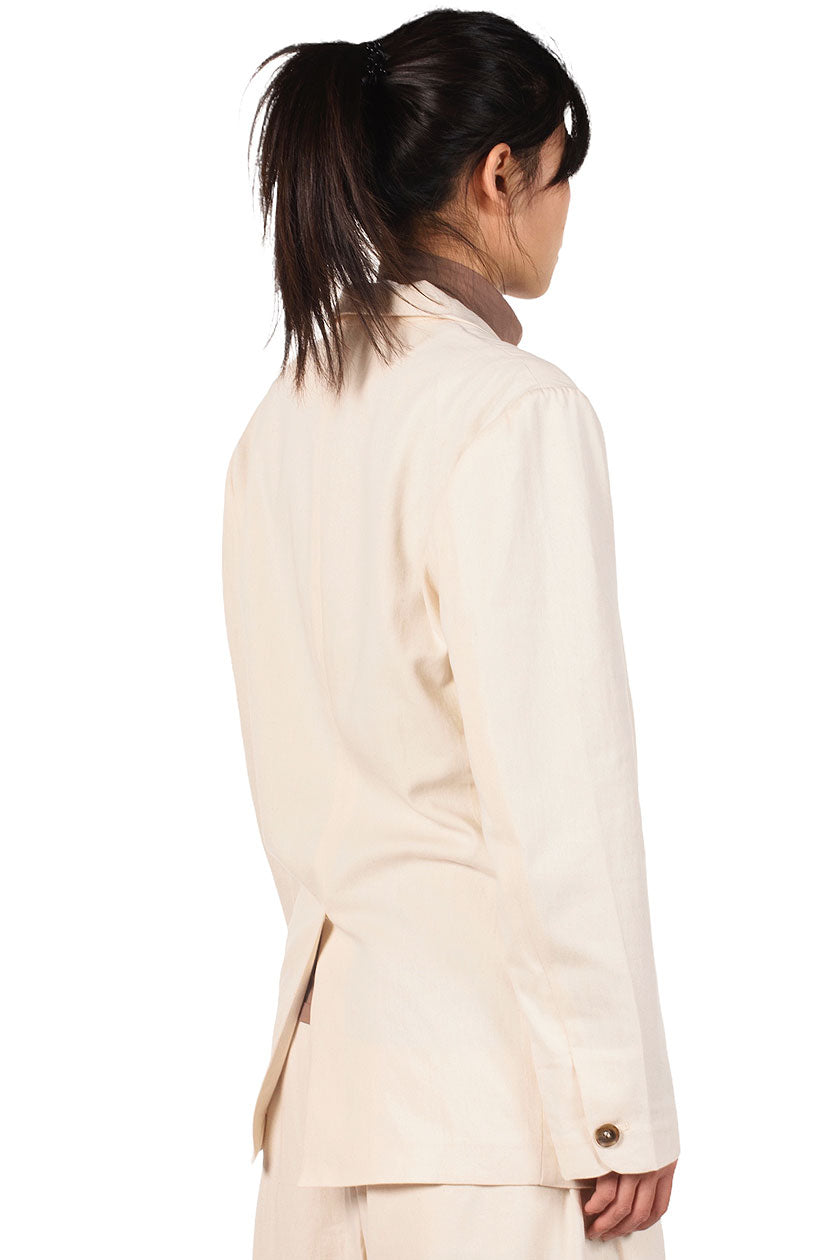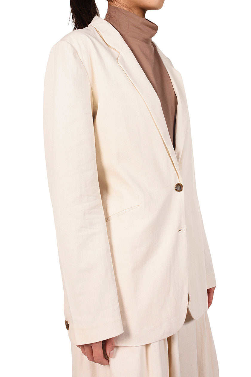 Two buttons blazer. Cotton blazer. Two pockets at front. One pocket at chest.