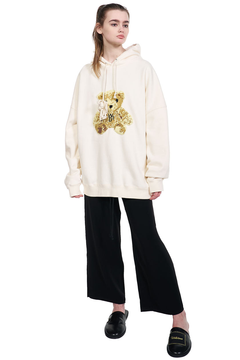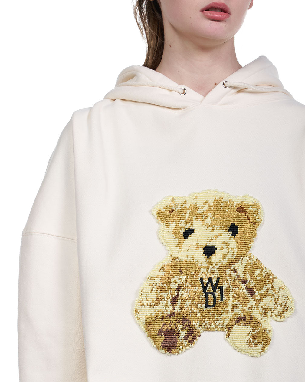We11done merges late 1990s and early 2000s aesthetics creating a feeling of futurity. Functional, sportive, and sleek, We11done’s versatile designs refine classic elements into contemporary lifestyle pieces as seen with the Ivory cotton hoodie with elongated drawstrings. Features a multicoloured teddy bear embroidery centred on the front face. Rubber logo patch along back hem. Finished with rib knit cuffs, hem, and tonal stitching. Relaxed Fit.
