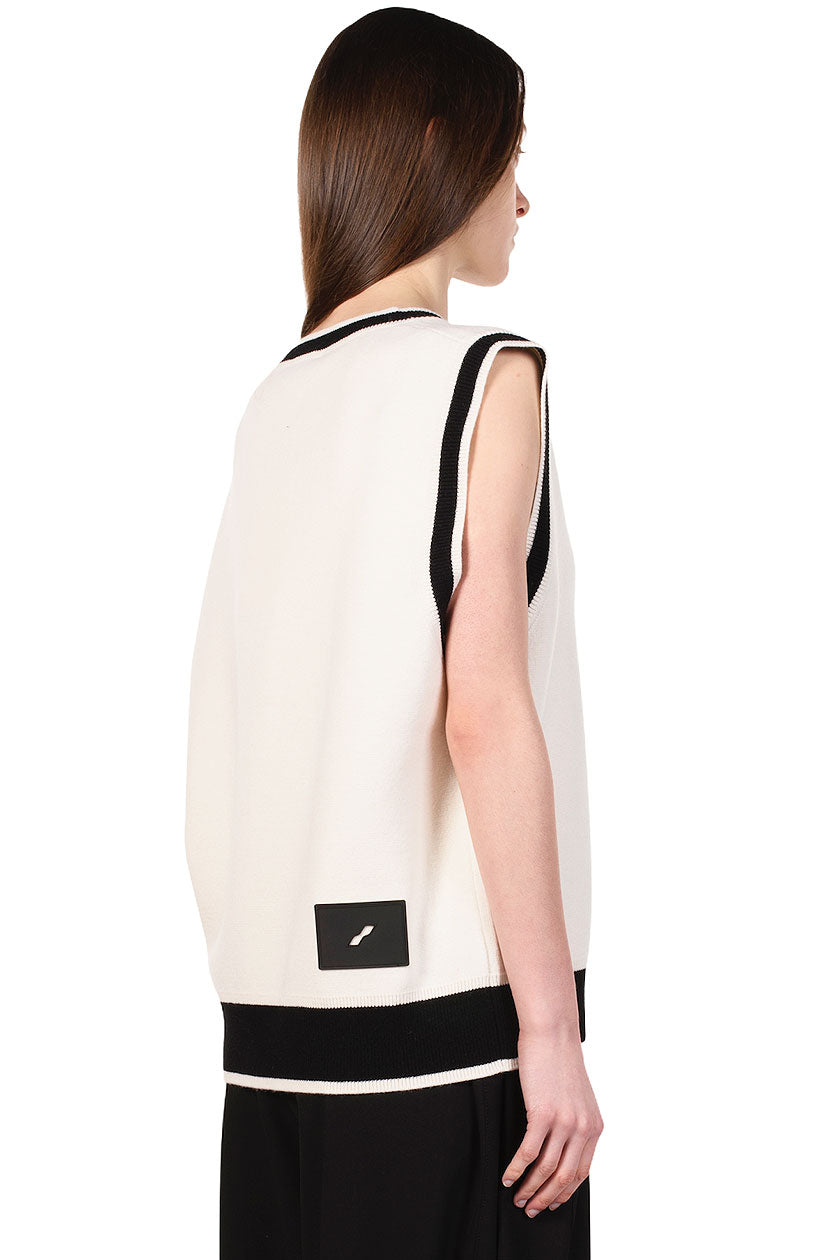 We11done merges late 1990s and early 2000s aesthetics creating a feeling of futurity. Functional, sportive, and sleek, We11done’s versatile designs refine classic elements into contemporary lifestyle pieces as seen with the Ivory Knit Vest.