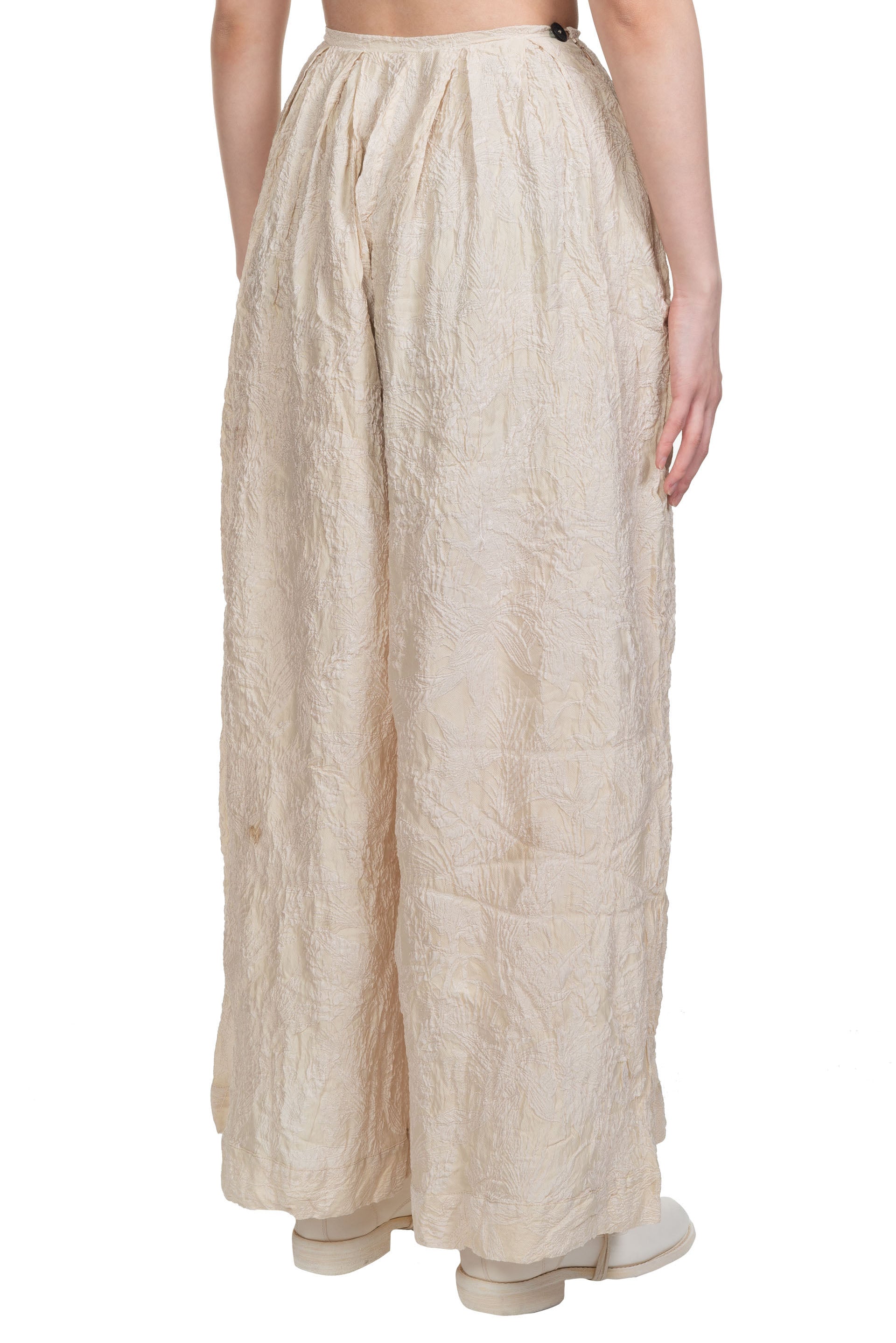 Yu Qun believes that everyone's character is multi-faceted and expressing spiritual independence. Fine hand-stitched threads, old mottled colours and patterns, and unconventional cuts are what Mute Dance has been exploring. The leaves and stems of fresh plants and berries, dried medicinal materials, old metals and so on are combined with the ancient and traditional dyeing technology to dye fabrics and paper as seen with the Jacquard Pants Celadon.