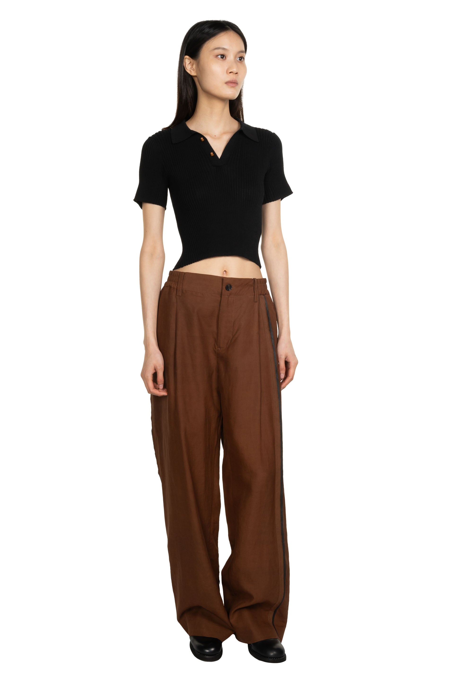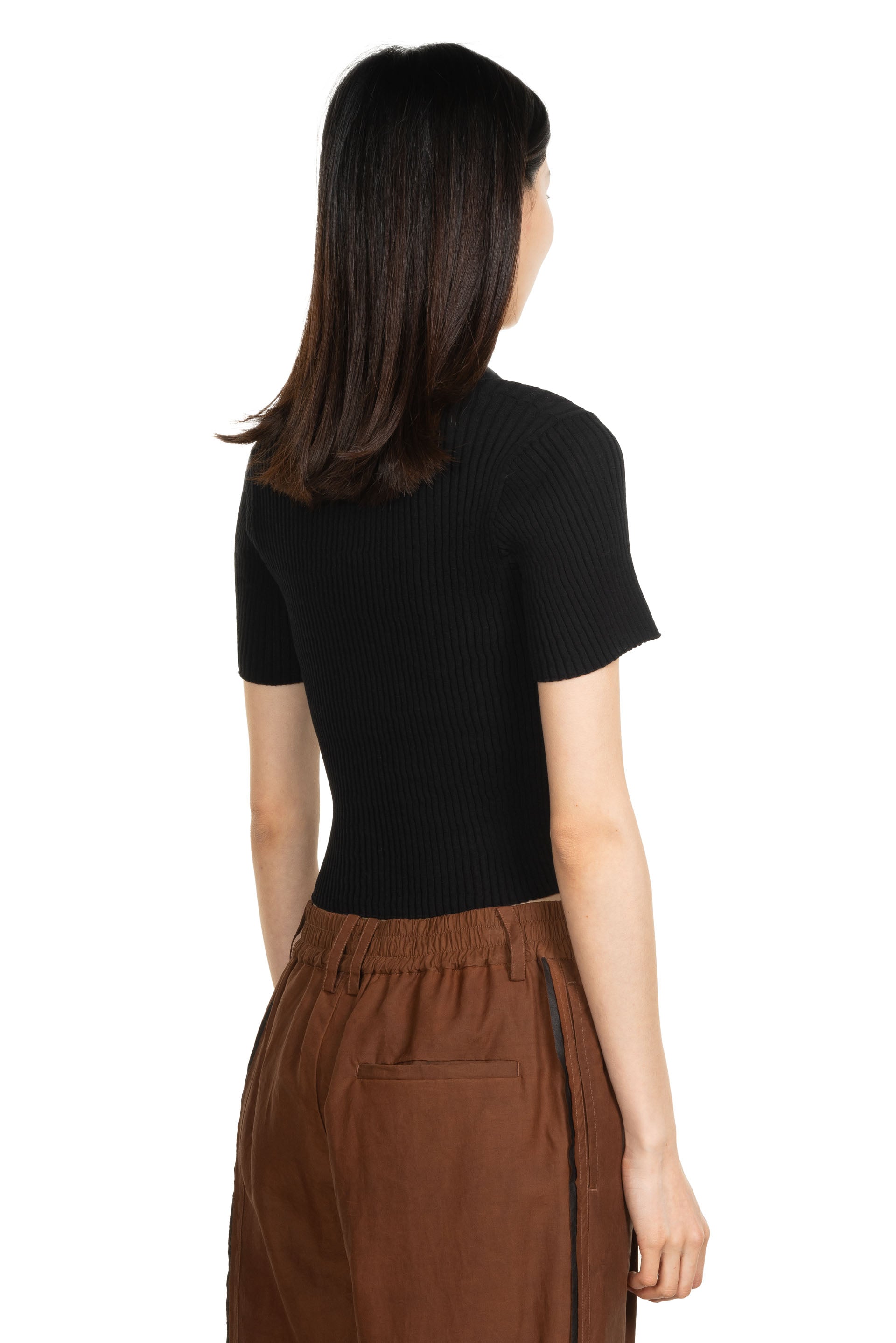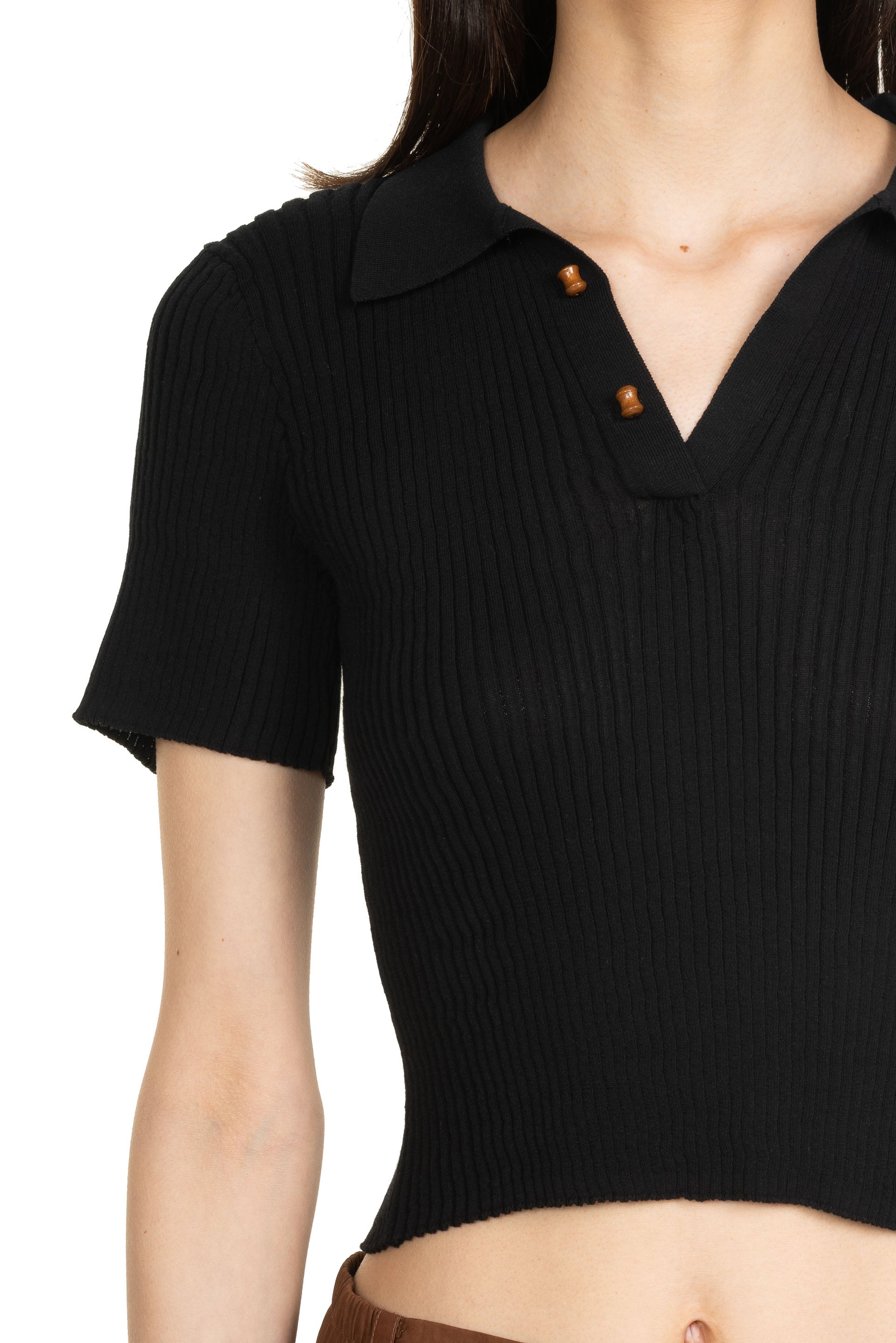 Feng Chen Wang Jacquard Patterned Knit Polo. Short sleeves. Bamboo detail buttons. Jacquard pattern throughout. Cropped.
