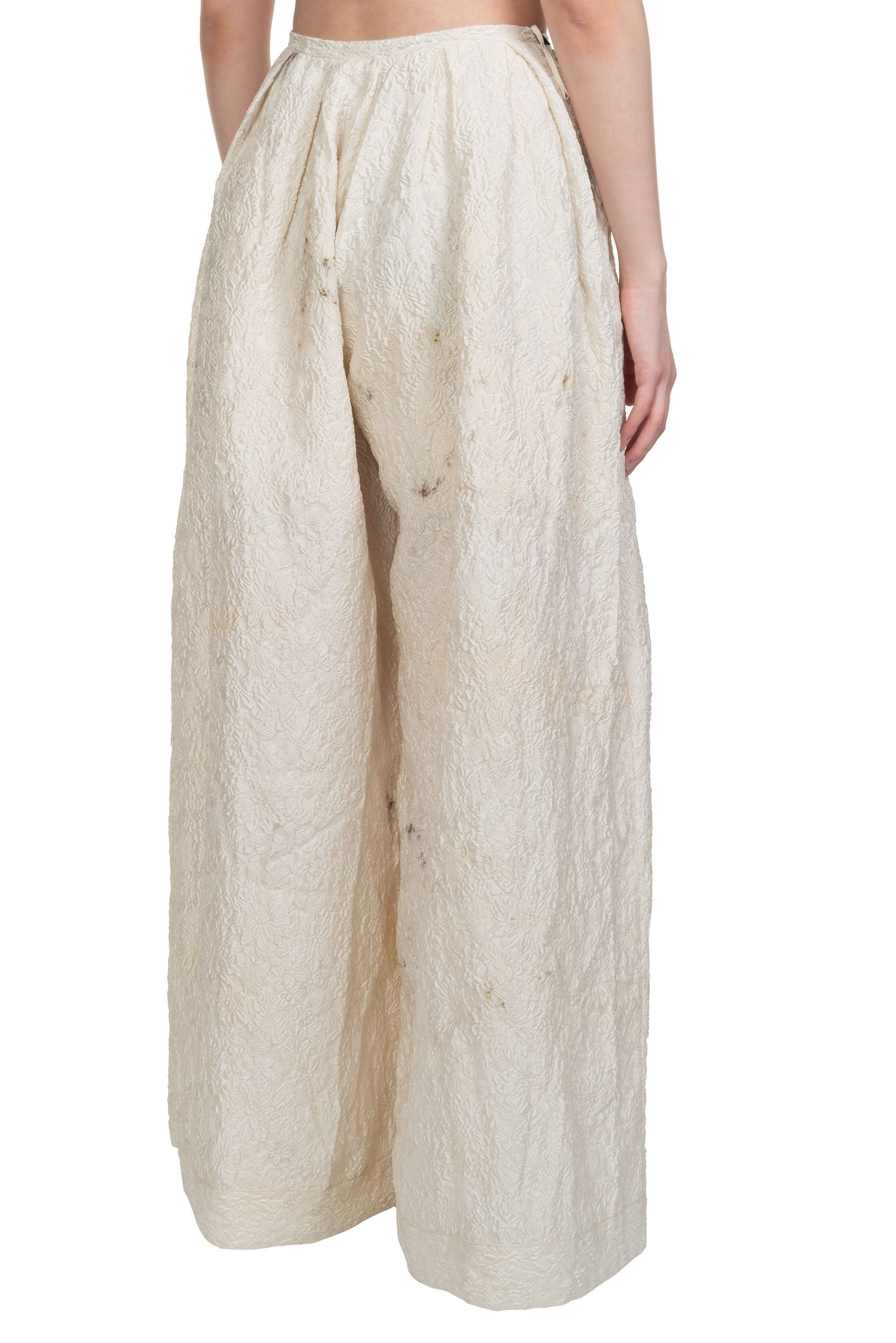 Yu Qun believes that everyone's character is multi-faceted and expressing spiritual independence. Fine hand-stitched threads, old mottled colours and patterns, and unconventional cuts are what Mute Dance has been exploring. The leaves and stems of fresh plants and berries, dried medicinal materials, old metals and so on are combined with the ancient and traditional dyeing technology to dye fabrics and paper as seen with the Jacquard Trousers.