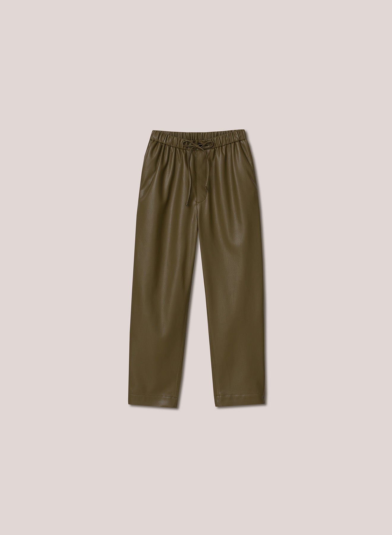 This easy-to-wear casual pant has a relaxed shape and a wide leg. Dynamic and versatile, the Jain features a drawstring waist and is crafted from our classic vegan leather.