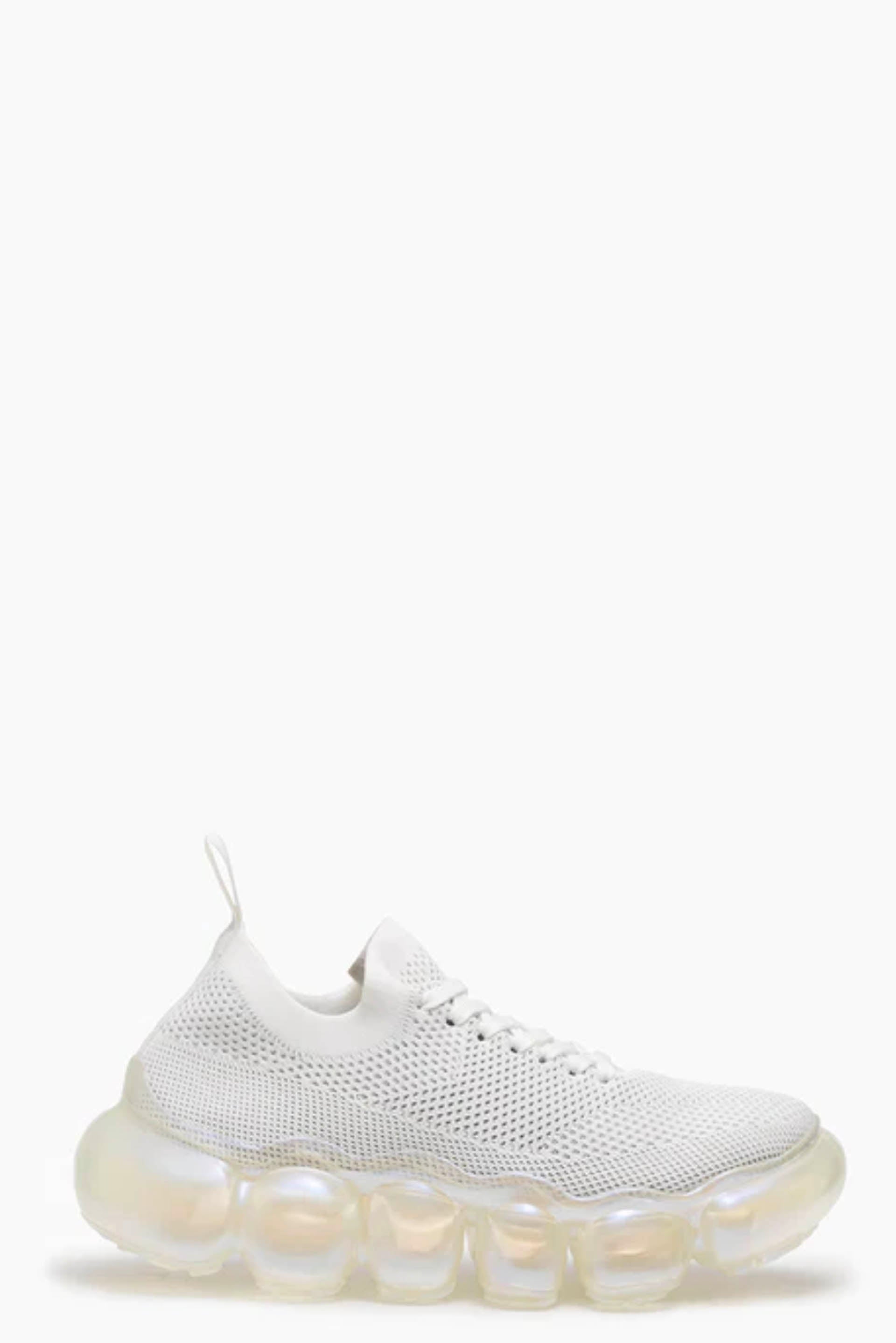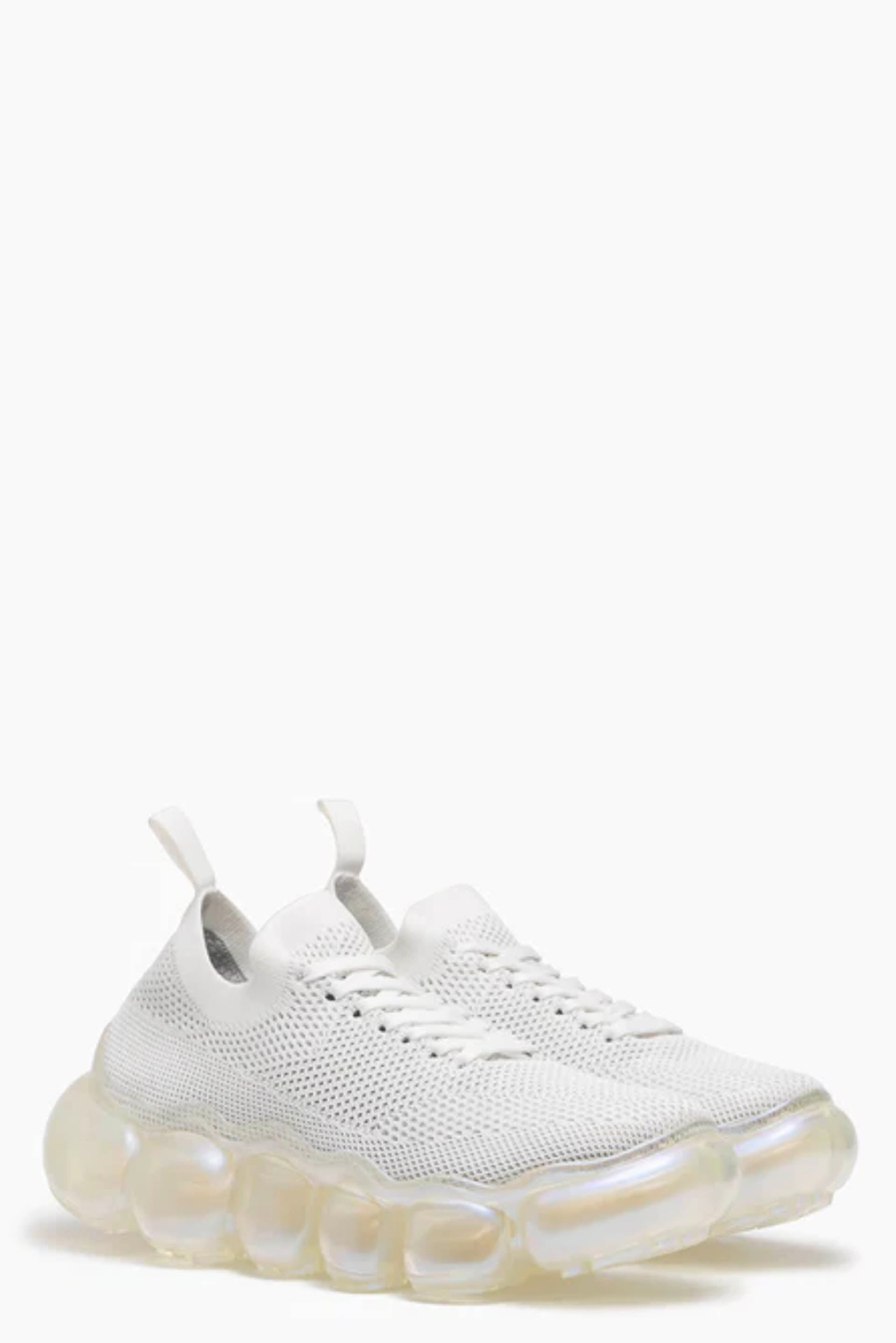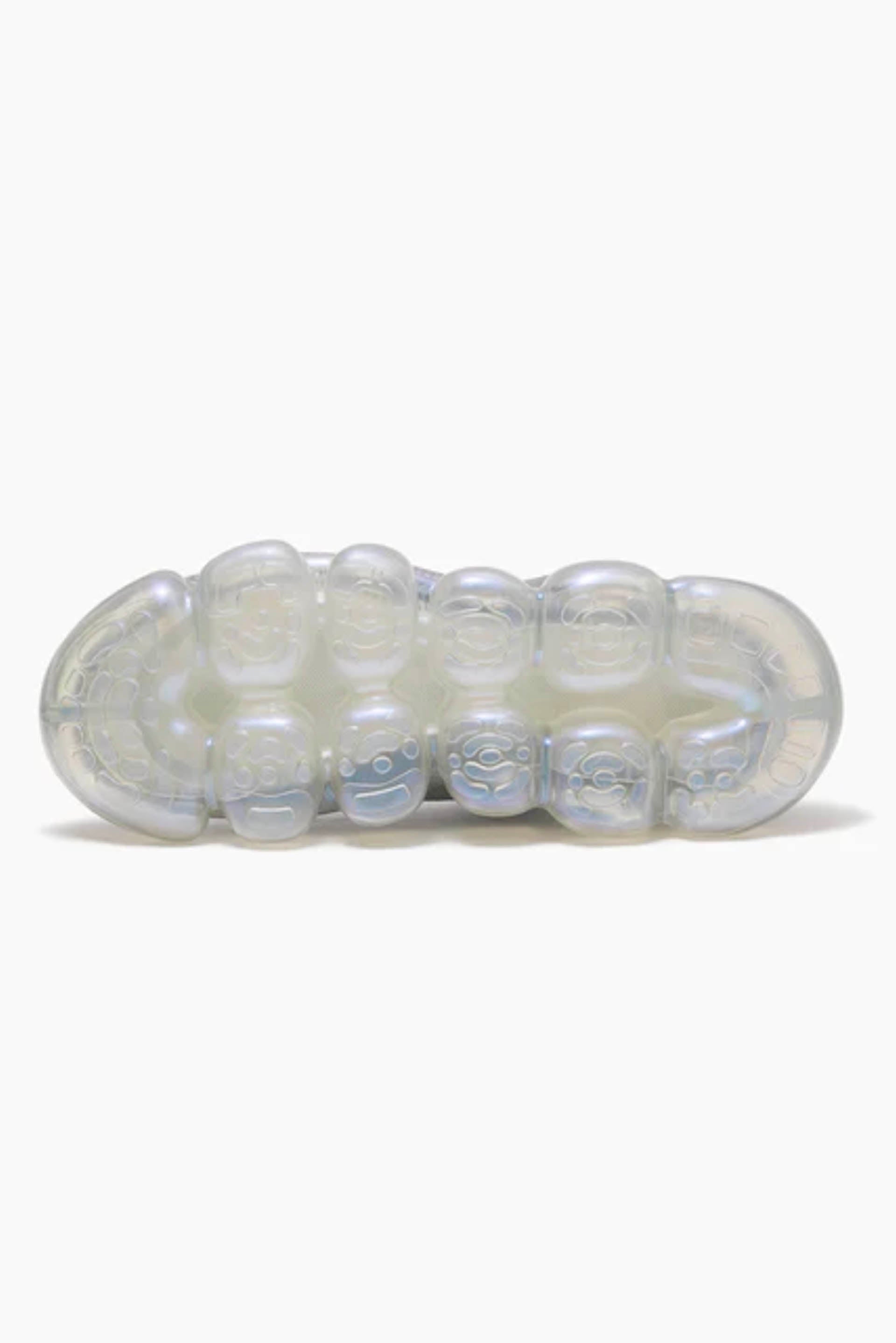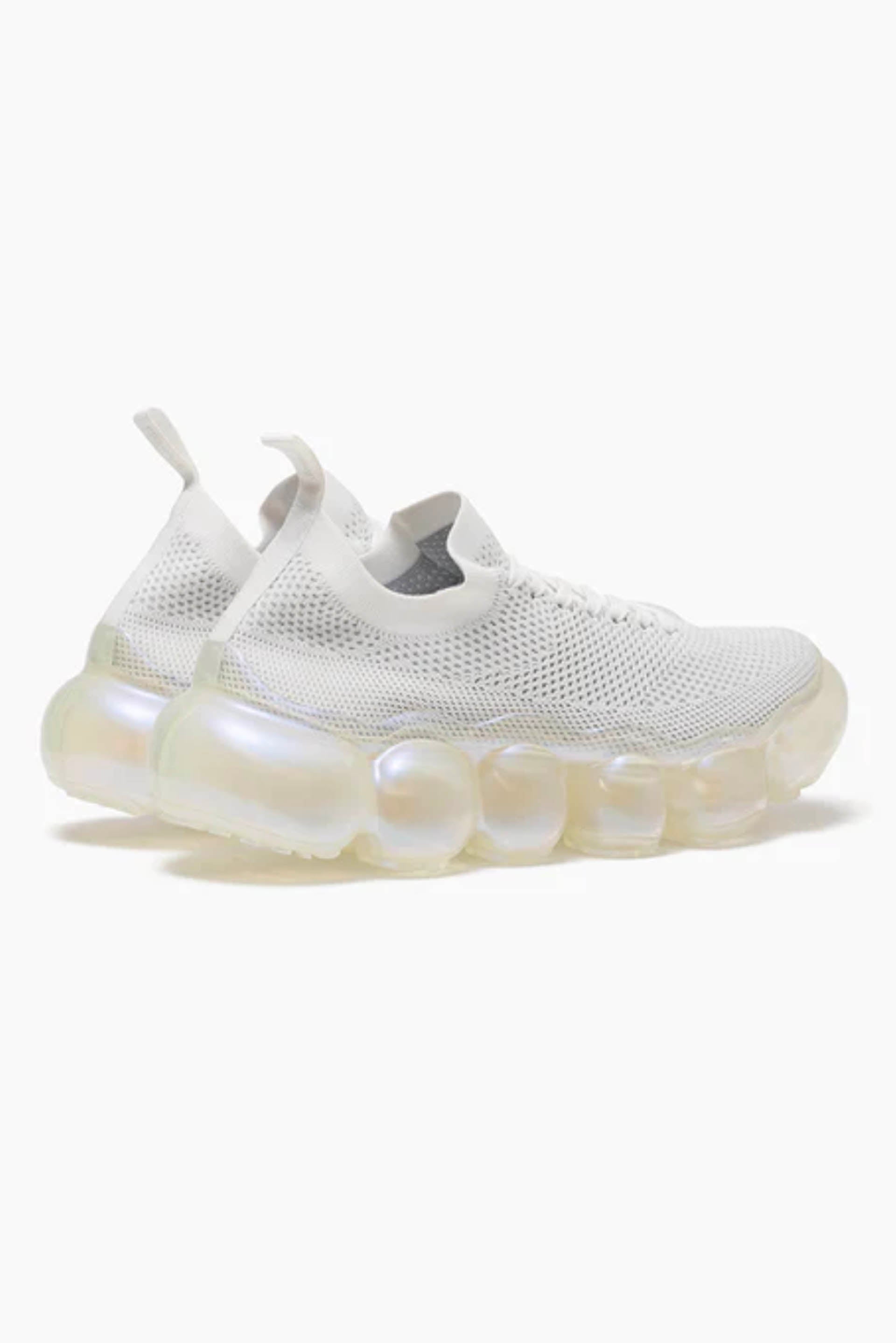 Grounds translates the pulse of Japanese youth into bold shoe design as seen with the Jewelry Aurora White Gray Clear. Shoes that are wearable jewelry. Thick-soled clear soles made of transparent spheres reminiscent of jewelry draw the wearer's and viewer's attention to wearer's feet. The sole has a lamé finish, giving it an aurora-like glittery sole. Each sphere is designed to move softly with the movement of your foot, giving you a unique walking and gripping experience. In addition, the flexibility of the material is controlled to provide optimal cushioning when worn, creating a fluffy, floating sensation that you can't feel when you touch them with your hands. The knit upper, which is simple in contrast to the distinctive shape of the outsole, is deliberately minimalist in order to match with a wide range of fashion. The height of the heel is about 5 cm for all sizes, and while the heel is voluminous, it is transparent to reduce the appearance of weight.