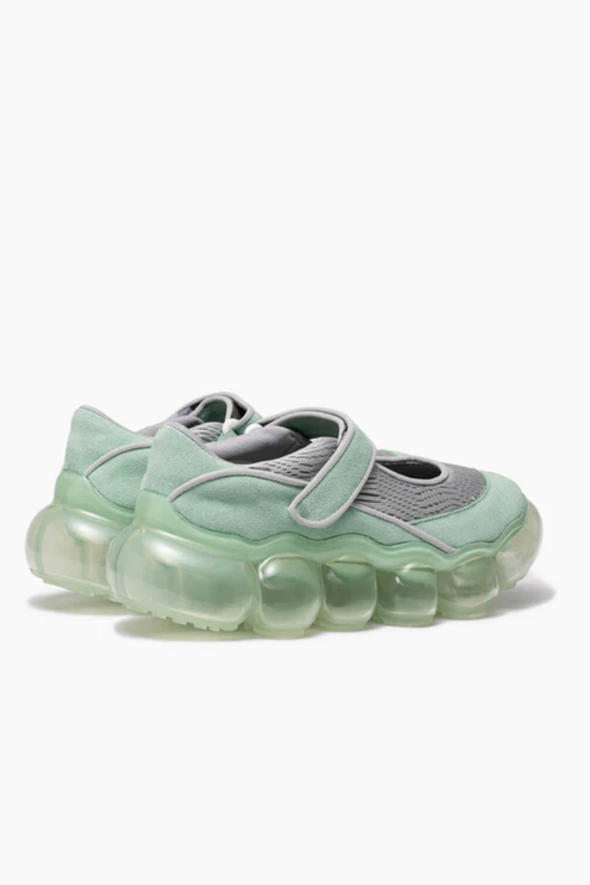 Thick-soled clear soles made of transparent spheres reminiscent of jewelry draw the wearer's and viewer's attention to wearer's feet. Each sphere is designed to move softly with the movement of your foot, giving you a unique walking and gripping experience. In addition, the flexibility of the material is controlled to provide optimal cushioning when worn, creating a fluffy, floating sensation that you can't feel when you touch them with your hands. The upper is a Mary Jane made of a combination of different materials: wetsuit-like fabric and suede. The suede strap has a Velcro closure. Colour: Mesh Gray Mint. The height of the heel is about 5 cm for all sizes, and while the heel is voluminous, it is transparent to reduce the appearance of weight.