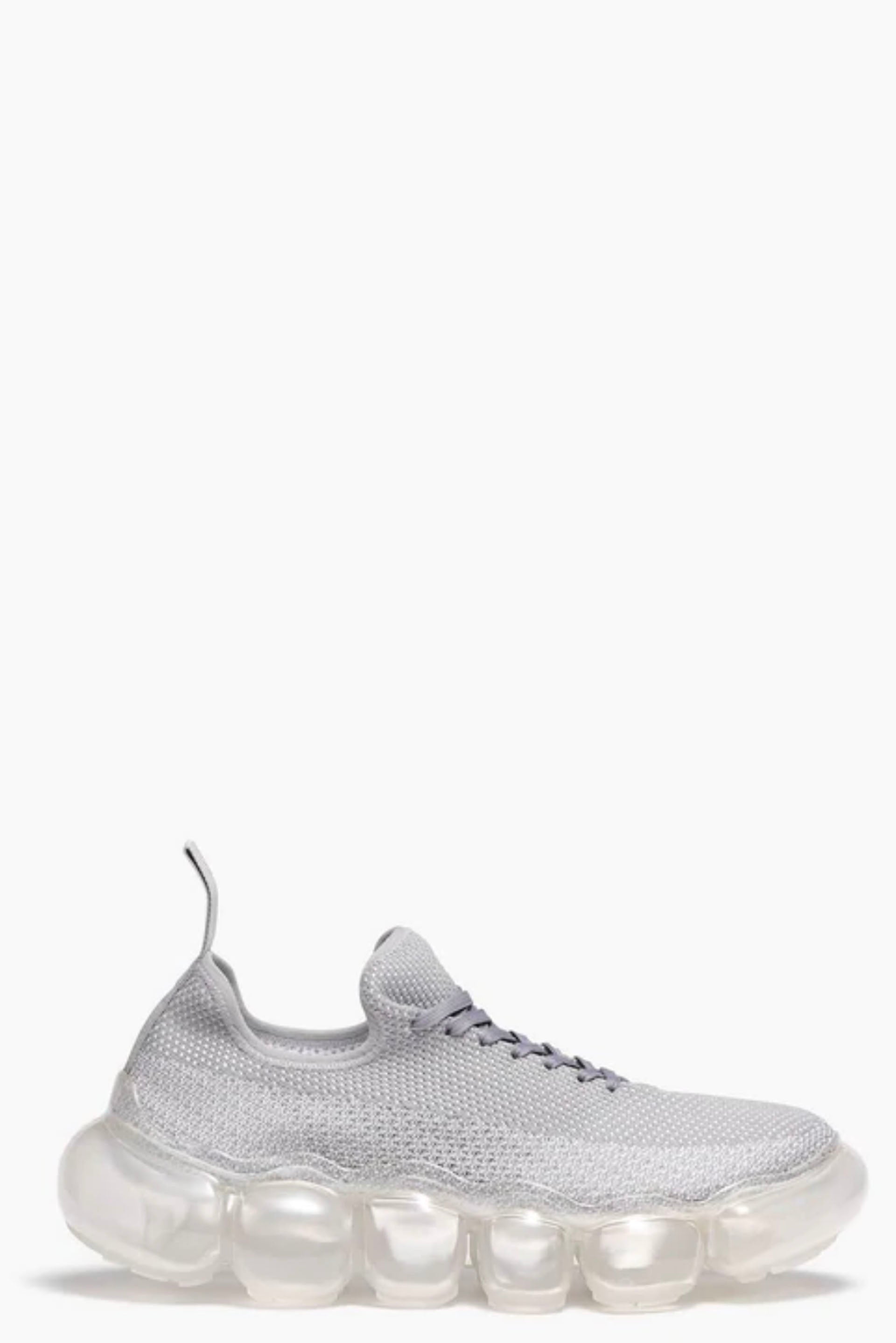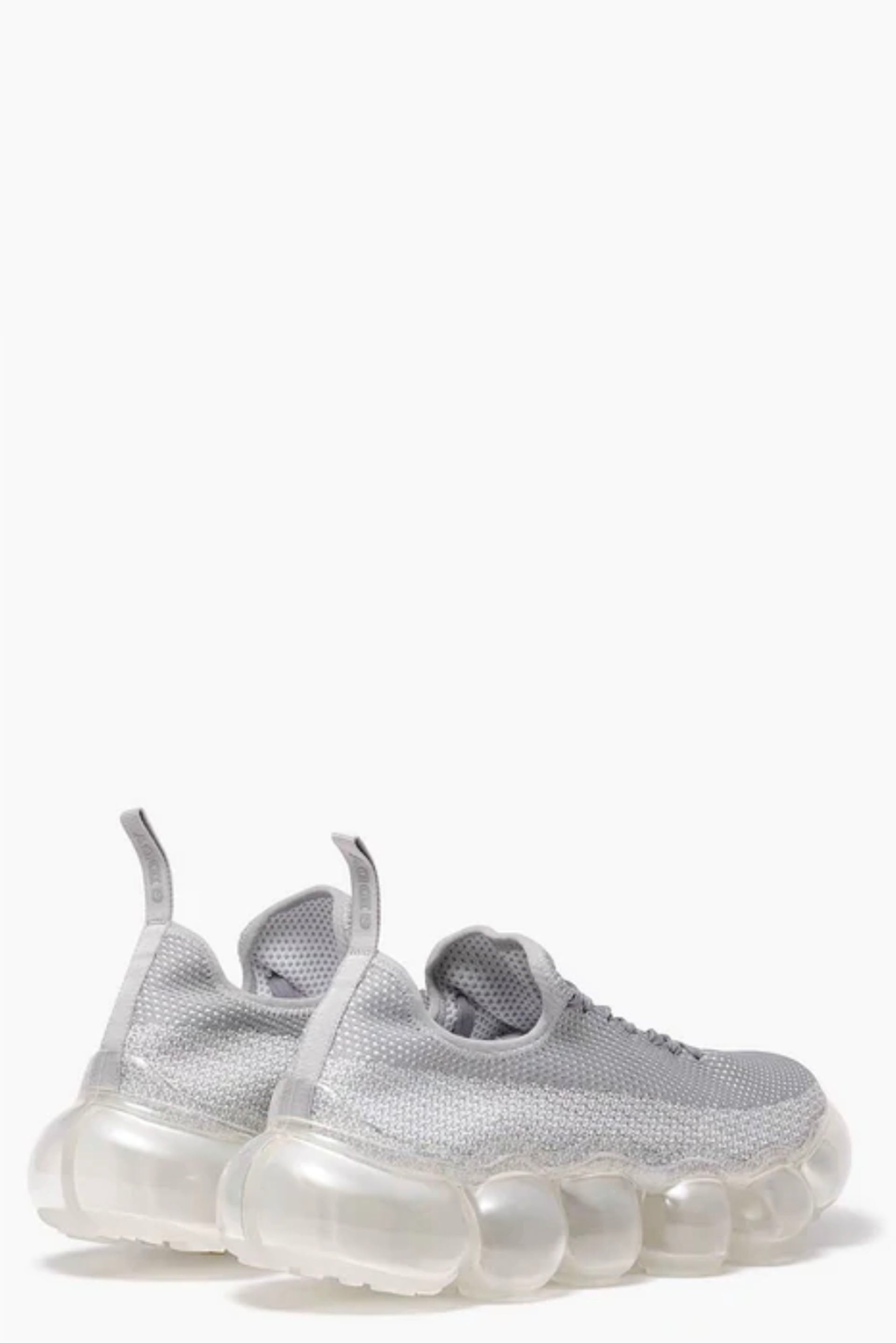 Thick Black clear soles made of transparent spheres reminiscent of jewelry draw the wearer's and viewer's attention to wearer's feet. Each sphere is designed to move softly with the movement of your foot, giving you a unique walking and gripping experience. In addition, the flexibility of the material is controlled to provide optimal cushioning when worn, creating a fluffy, floating sensation that you can't feel when you touch them with your hands.The Black knit upper, which is simple in contrast to the distinctive shape of the outsole, is deliberately minimalist in order to match with a wide range of fashion. The heel is voluminous, it is transparent to reduce the appearance of weight.