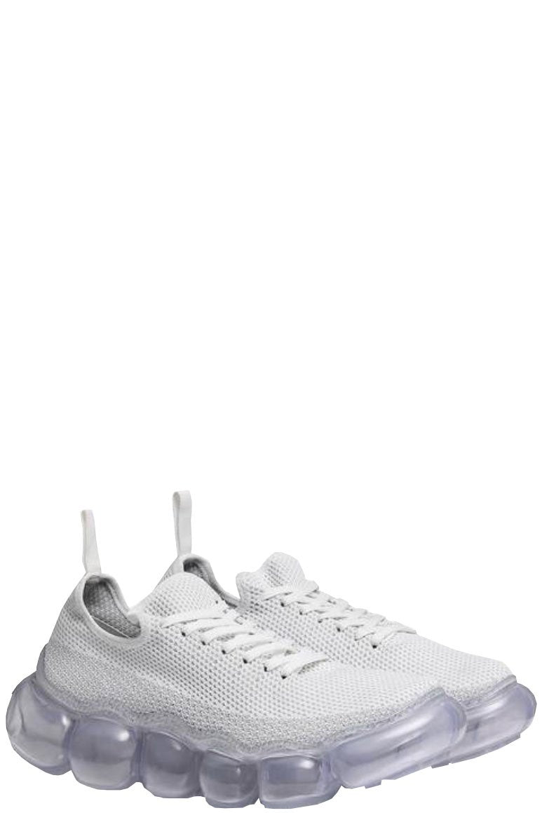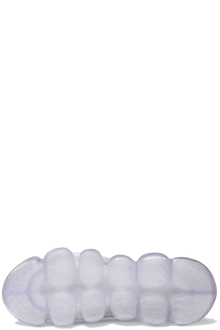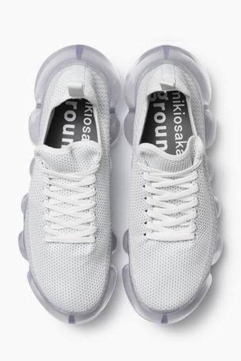 Thick-soled clear soles made of transparent spheres reminiscent of jewelry draw the wearer's and viewer's attention to wearer's feet. Each sphere is designed to move softly with the movement of your foot, giving you a unique walking and gripping experience. In addition, the flexibility of the material is controlled to provide optimal cushioning when worn, creating a fluffy, floating sensation that you can't feel when you touch them with your hands. The knit upper, which is simple in contrast to the distinctive shape of the outsole, is deliberately minimalist in order to match with a wide range of fashion. The height of the heel is about 5 cm for all sizes, and while the heel is voluminous, it is transparent to reduce the appearance of weight.