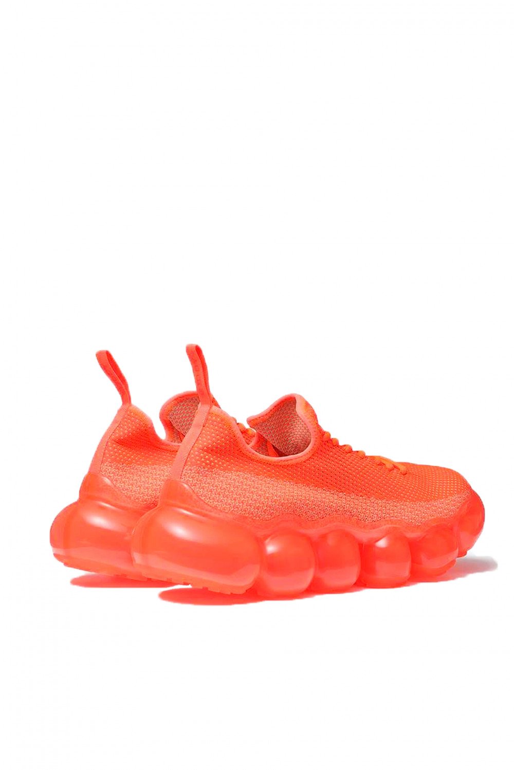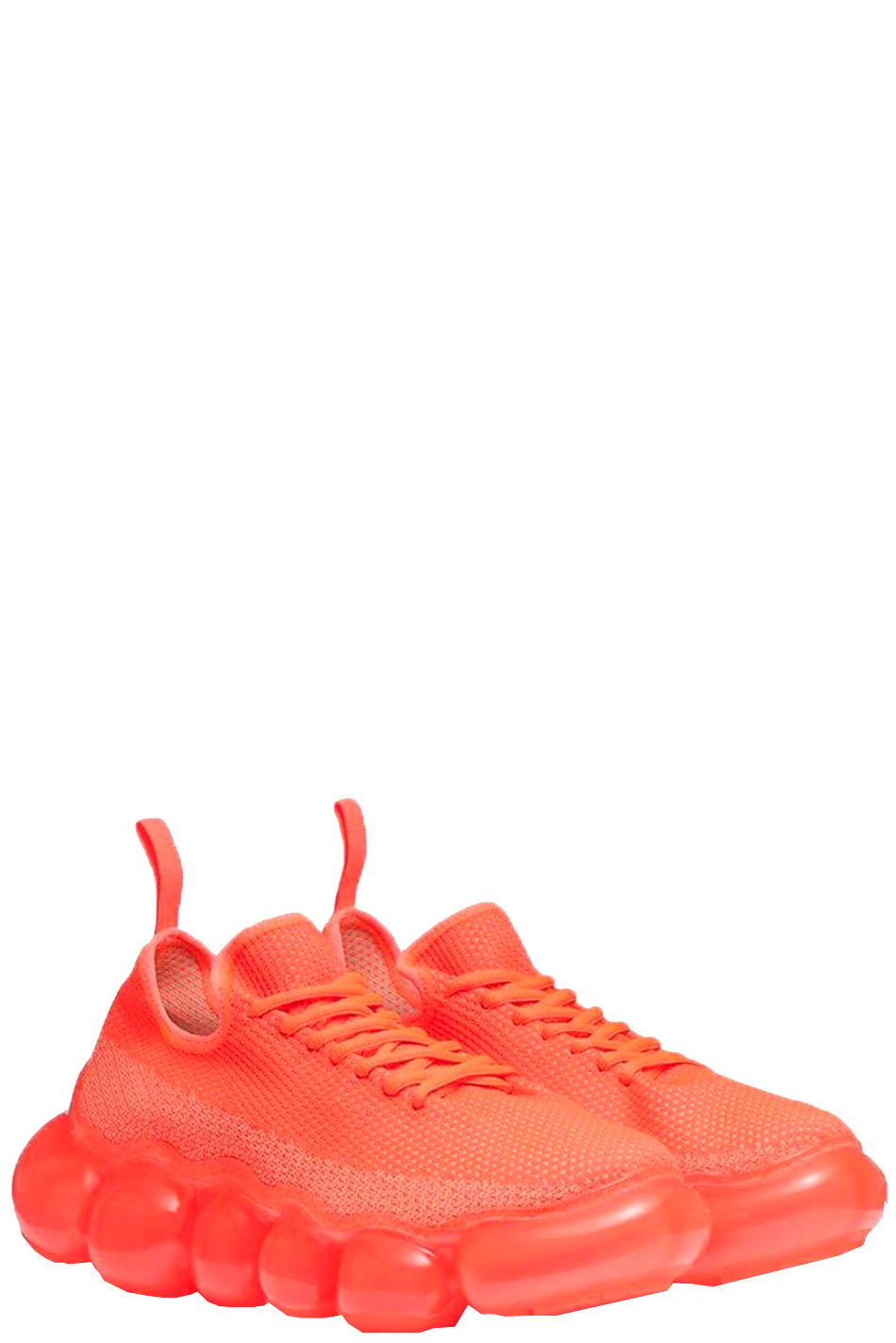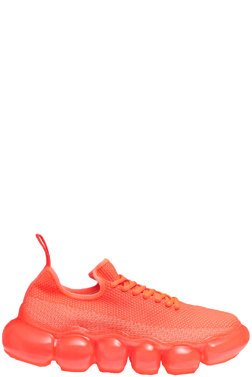 Grounds translates the pulse of Japanese youth into bold shoe design as seen with the Jewelry Neon Orange. City collection, a collection of vivid colours inspired by wearing in the city. Shoes that are wearable jewelry designed by MIkio Sakabe. Thick-soled clear soles made of transparent spheres reminiscent of jewelry draw the wearer's and viewer's attention to wearer's feet. The sole has a matte finish, giving it a clean sole. Each sphere is designed to move softly with the movement of your foot, giving you a unique walking and gripping experience. In addition, the flexibility of the material is controlled to provide optimal cushioning when worn, creating a fluffy, floating sensation that you can't feel when you touch them with your hands. The knit upper, which is simple in contrast to the distinctive shape of the outsole, is deliberately minimalist in order to match with a wide range of fashion. The height of the heel is about 5 cm for all sizes, and while the heel is voluminous, it is transparent to reduce the appearance of weight.