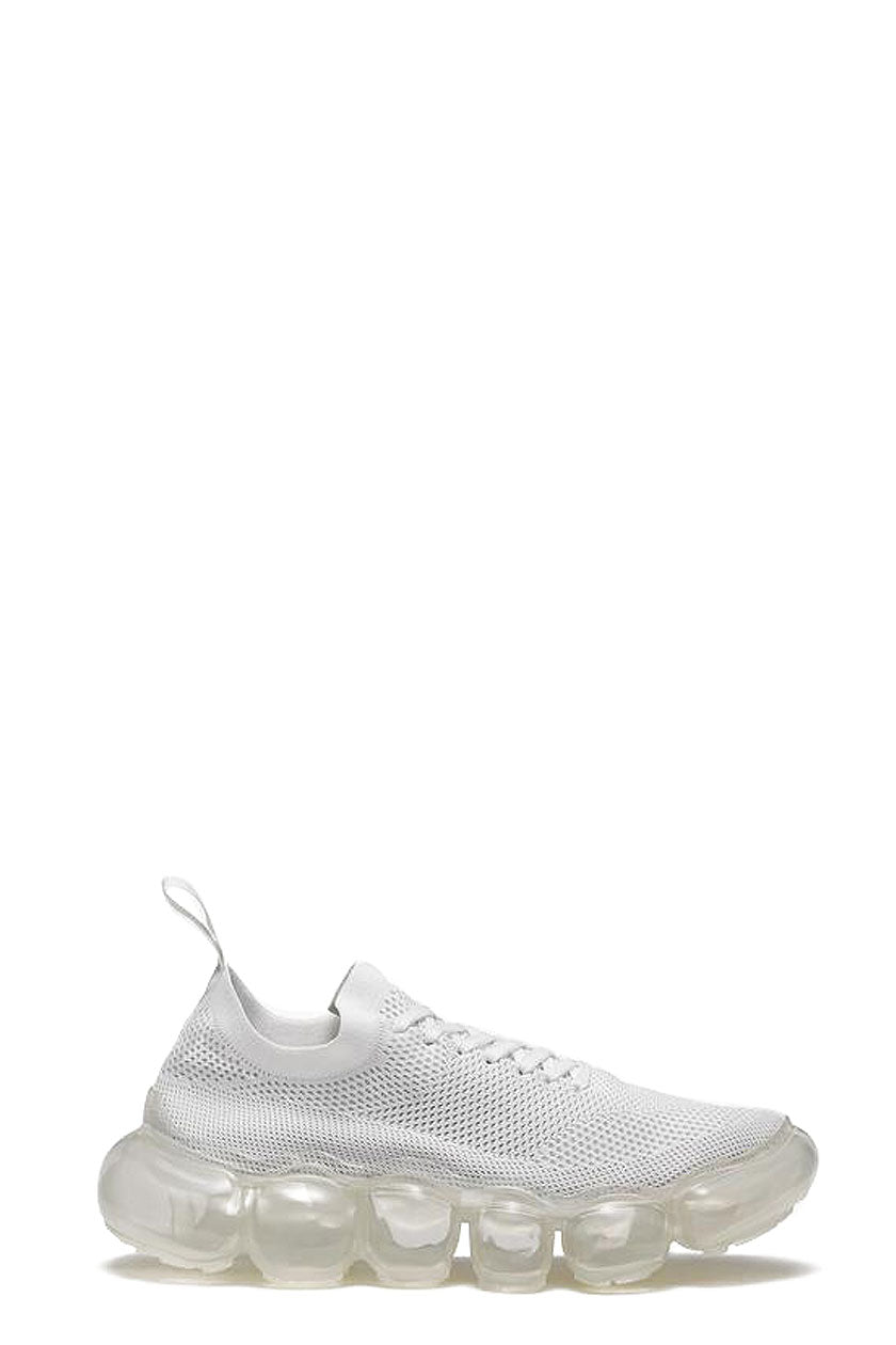 Thick Black clear soles made of transparent spheres reminiscent of jewelry draw the wearer's and viewer's attention to wearer's feet. Each sphere is designed to move softly with the movement of your foot, giving you a unique walking and gripping experience. In addition, the flexibility of the material is controlled to provide optimal cushioning when worn, creating a fluffy, floating sensation that you can't feel when you touch them with your hands.The Black knit upper, which is simple in contrast to the distinctive shape of the outsole, is deliberately minimalist in order to match with a wide range of fashion. The heel is voluminous, it is transparent to reduce the appearance of weight.