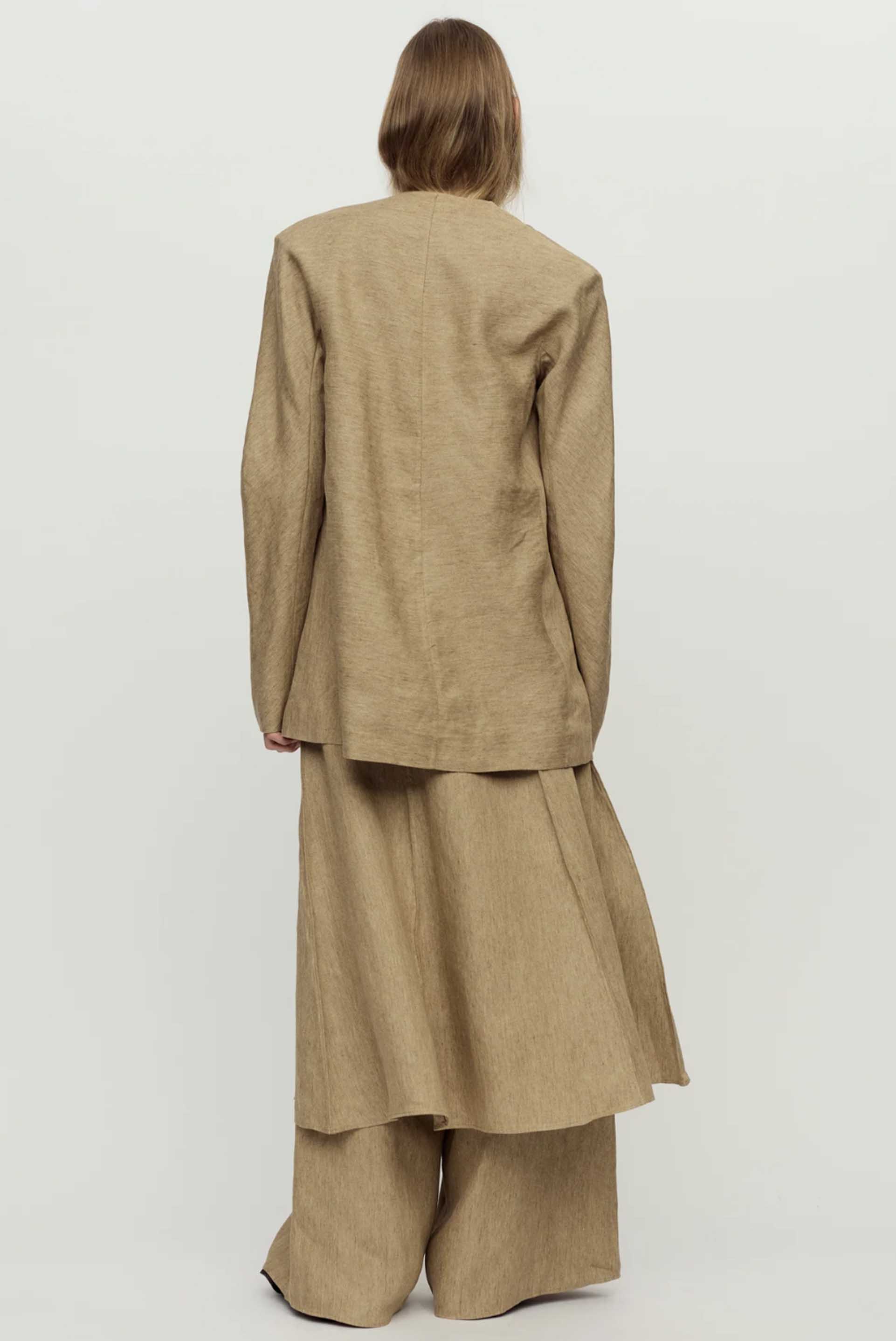 Ruohan linen Jacket. Long sleeves. Lined with silk. The fabric features an irregular grainy texture with prominent linen characteristics and surface nubs, while the front and back panels as well as sleeves are each constructed from a single piece of fabric forming a cross structure with pieced underarm seams, creating a naturally rounded shoulder silhouette without shoulder padding.
