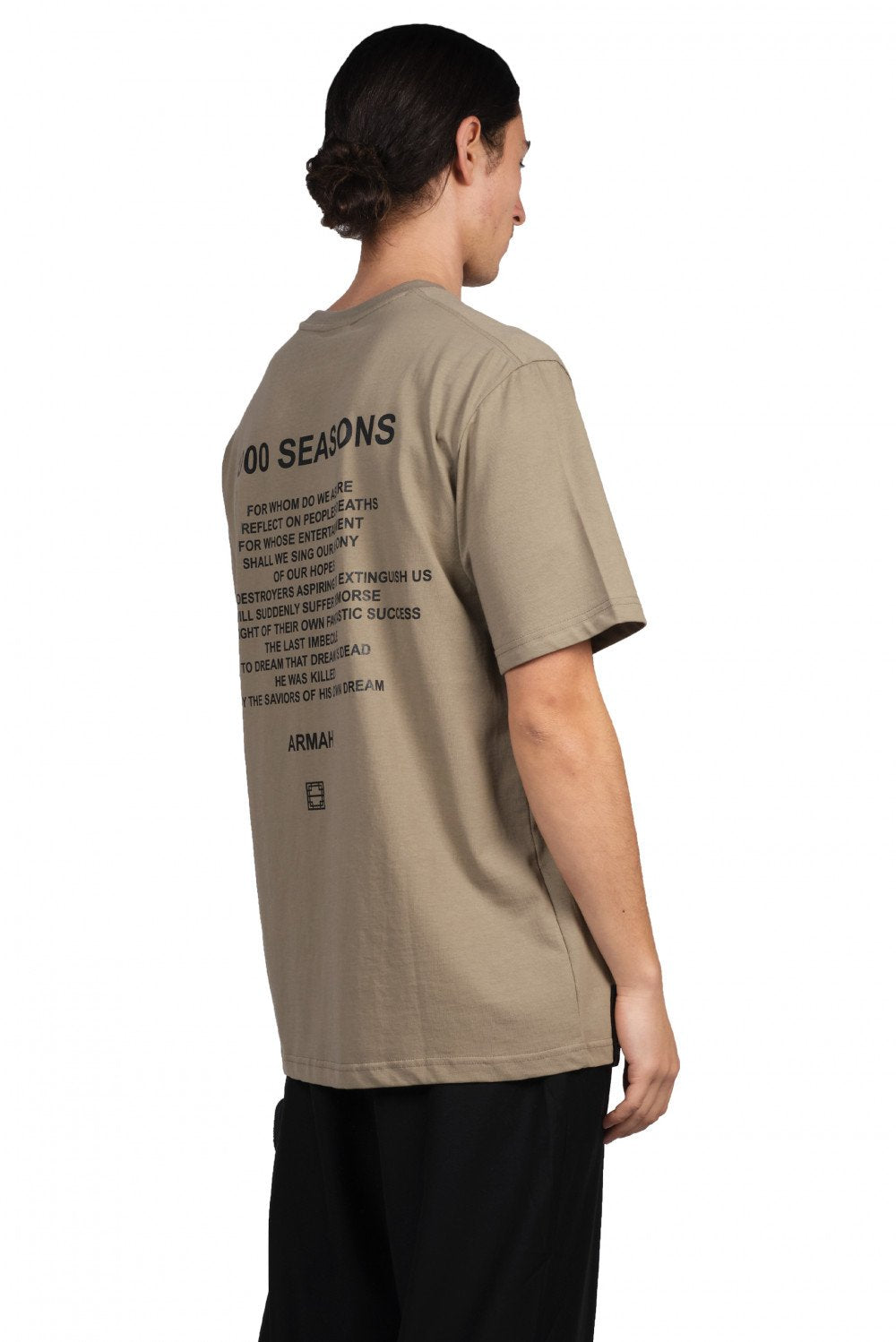 Ribbed crewneck collar. Print on chest. Printed text on back. Tonal stitching