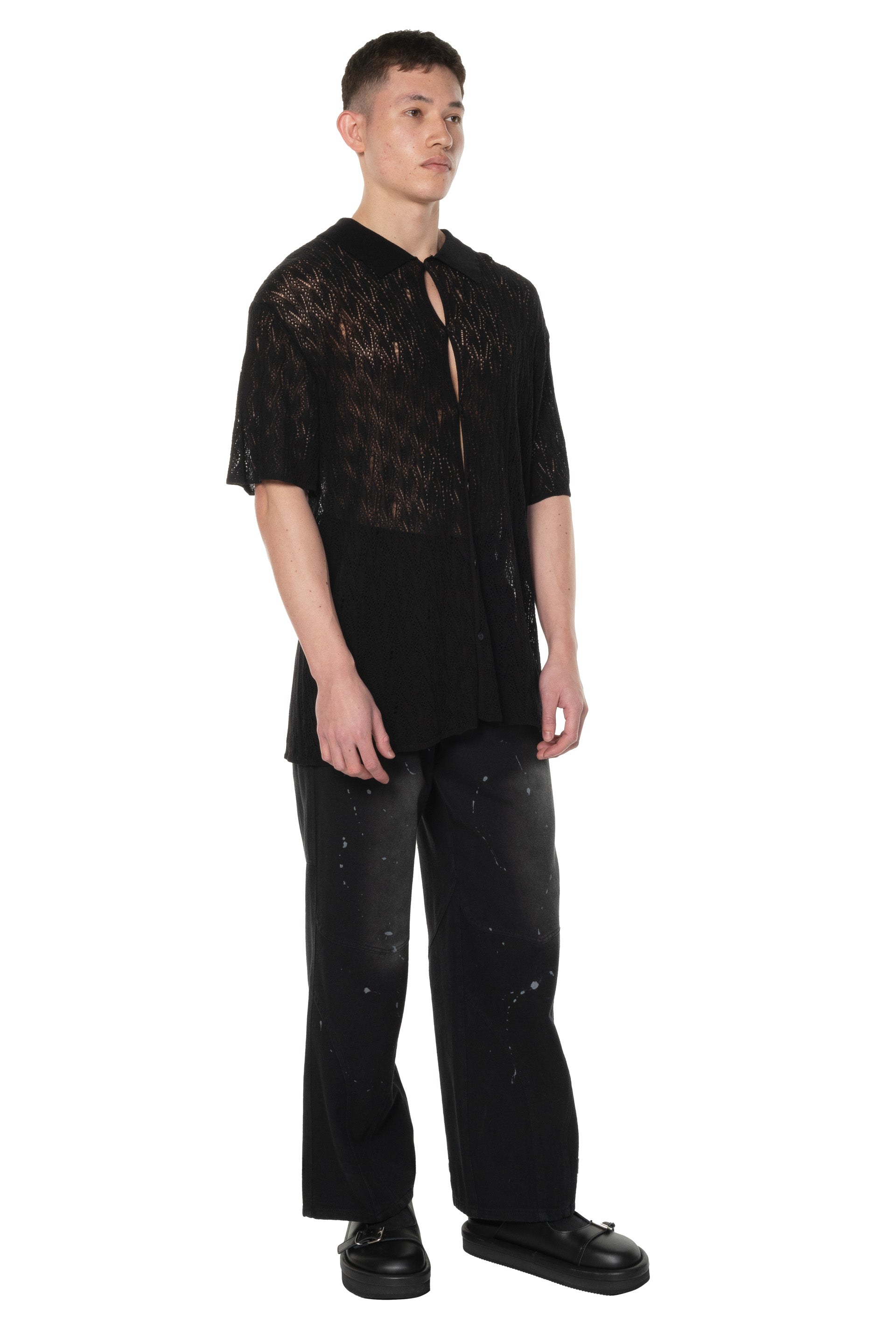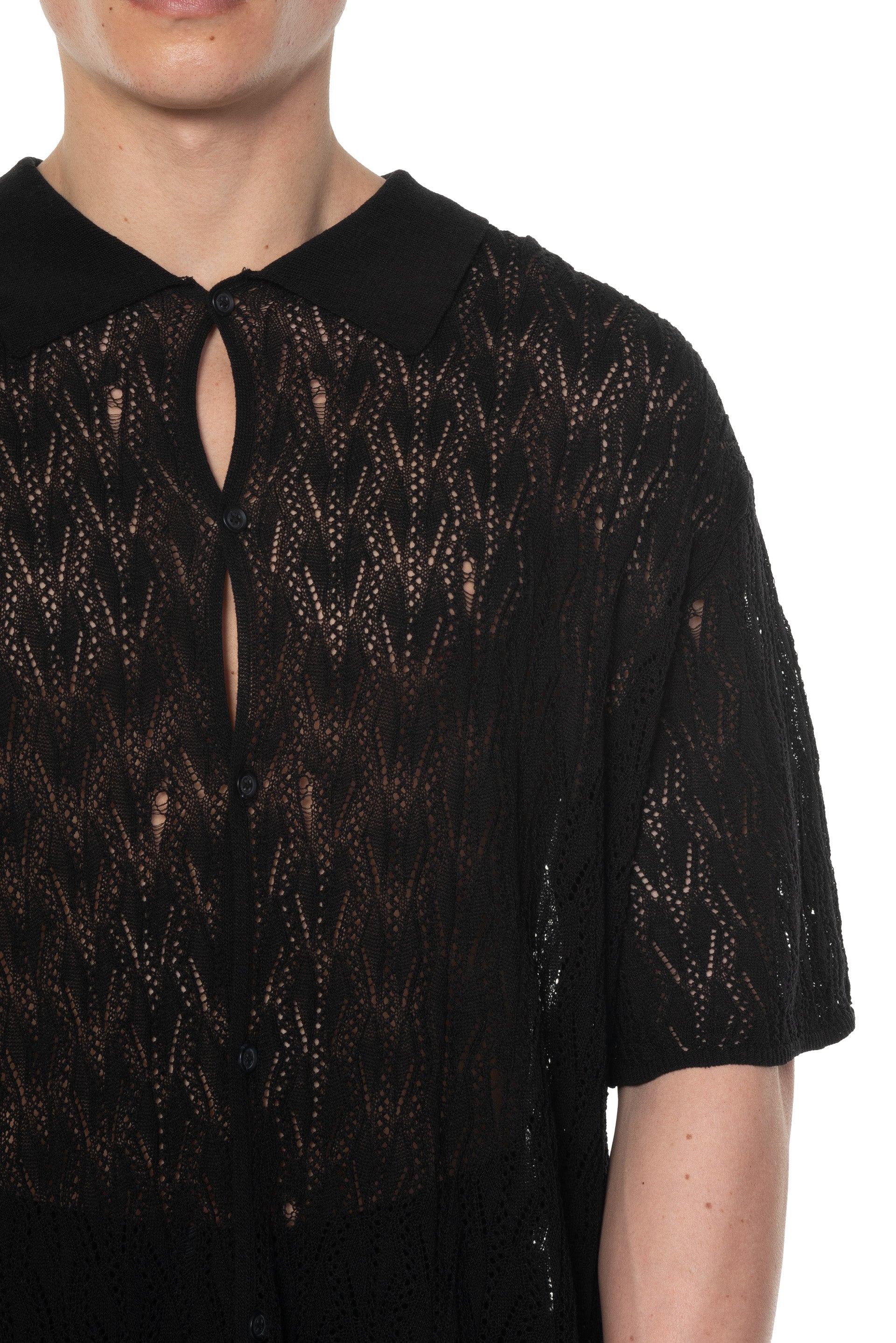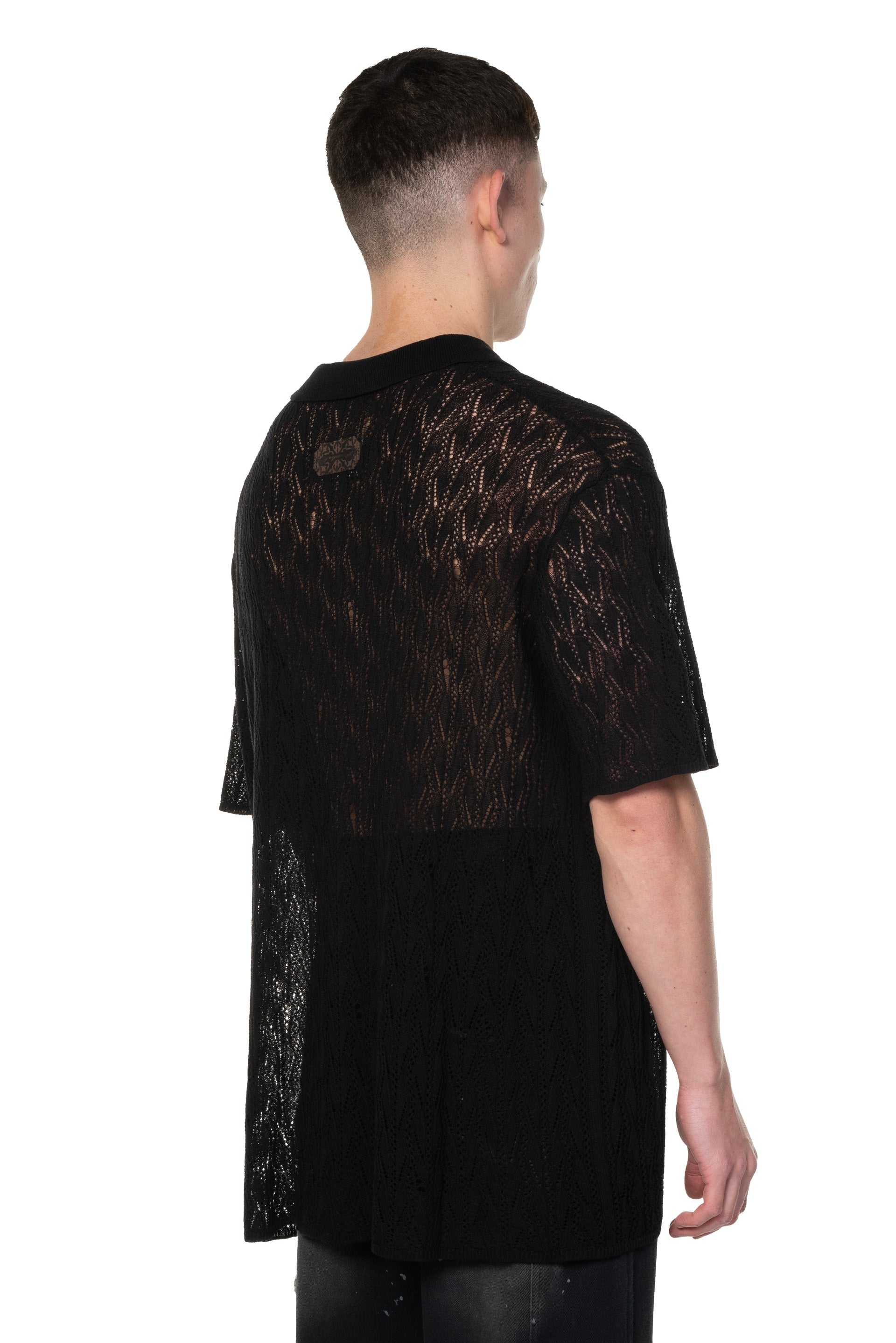Professor. E Knit Shirt Black. Knitted polo shirt in black. Short sleeves. Button closure at front. Regular polo collar. Lace knit details throughout. Boxy fit. Leather detailing at back.