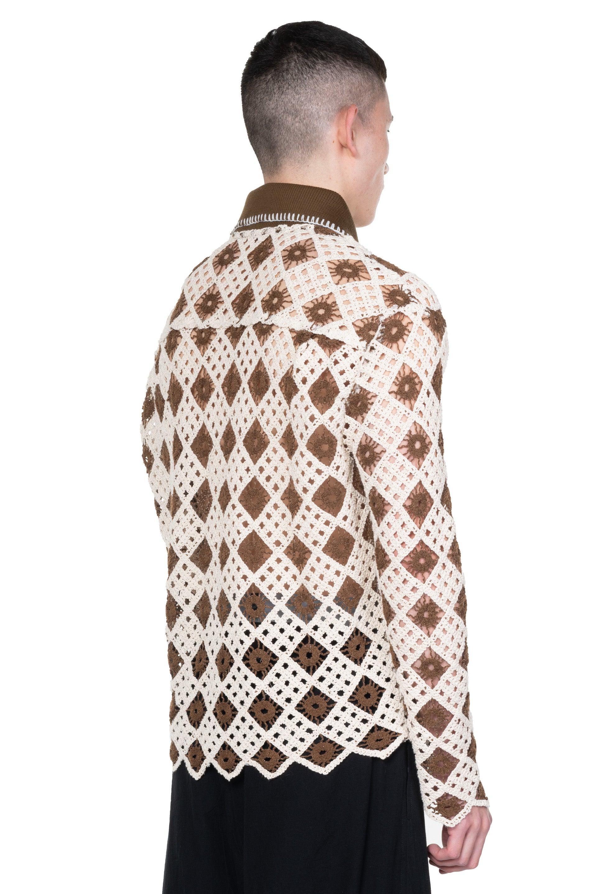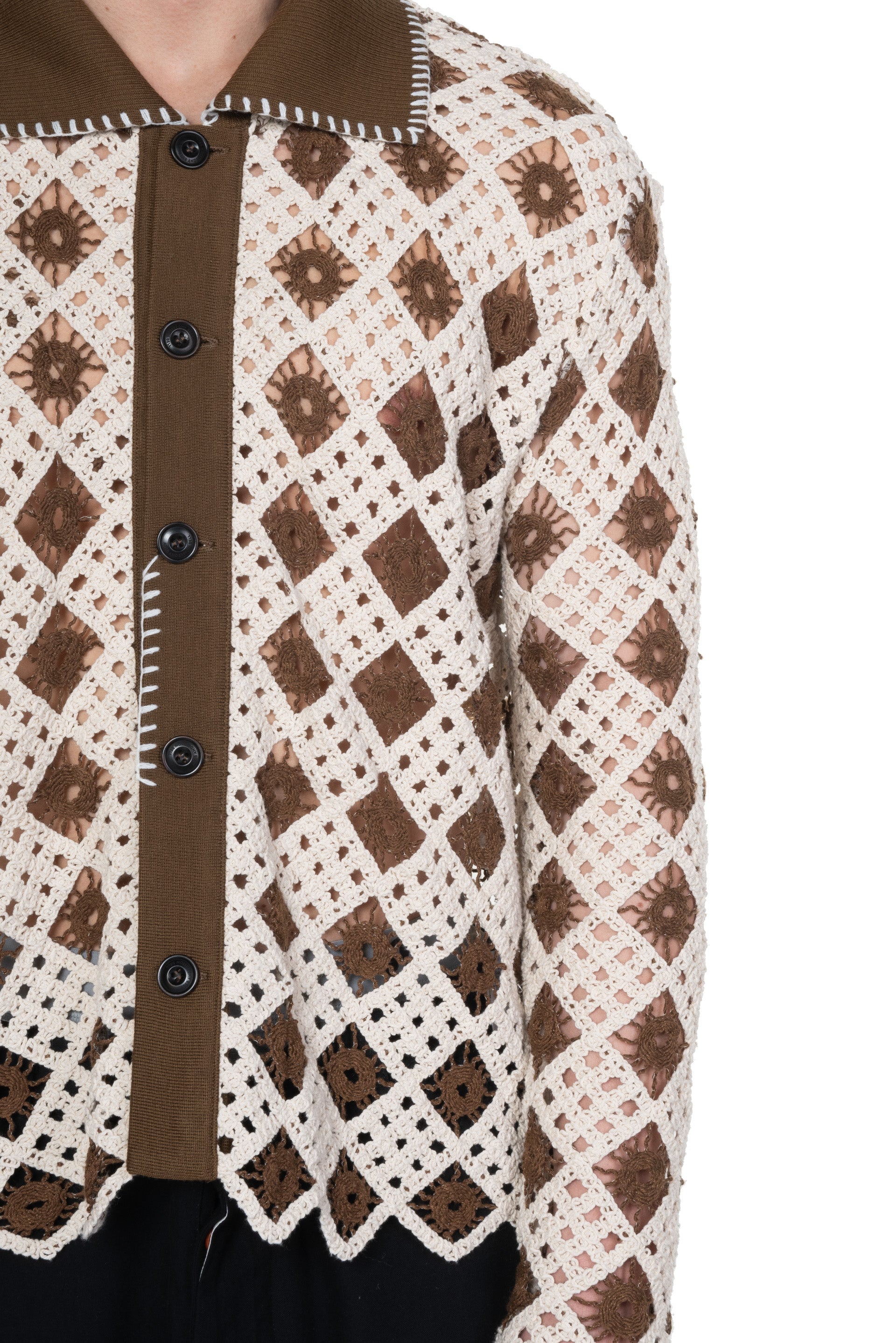 Long sleeves. Button closure at front. Boxy fit. Crochet knit throughout. Polo style collar cardigan.