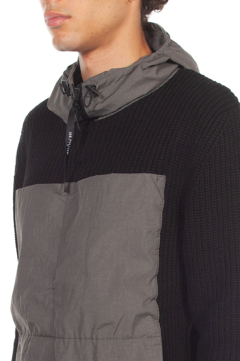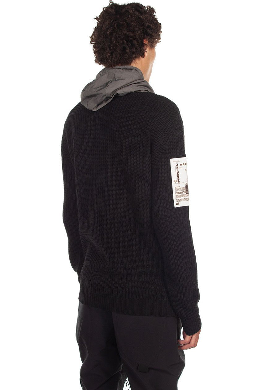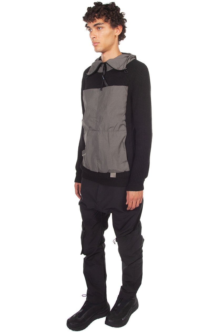 KN5_UHURU knitted hoodie with hood in contrast fabric and front pocket detail.