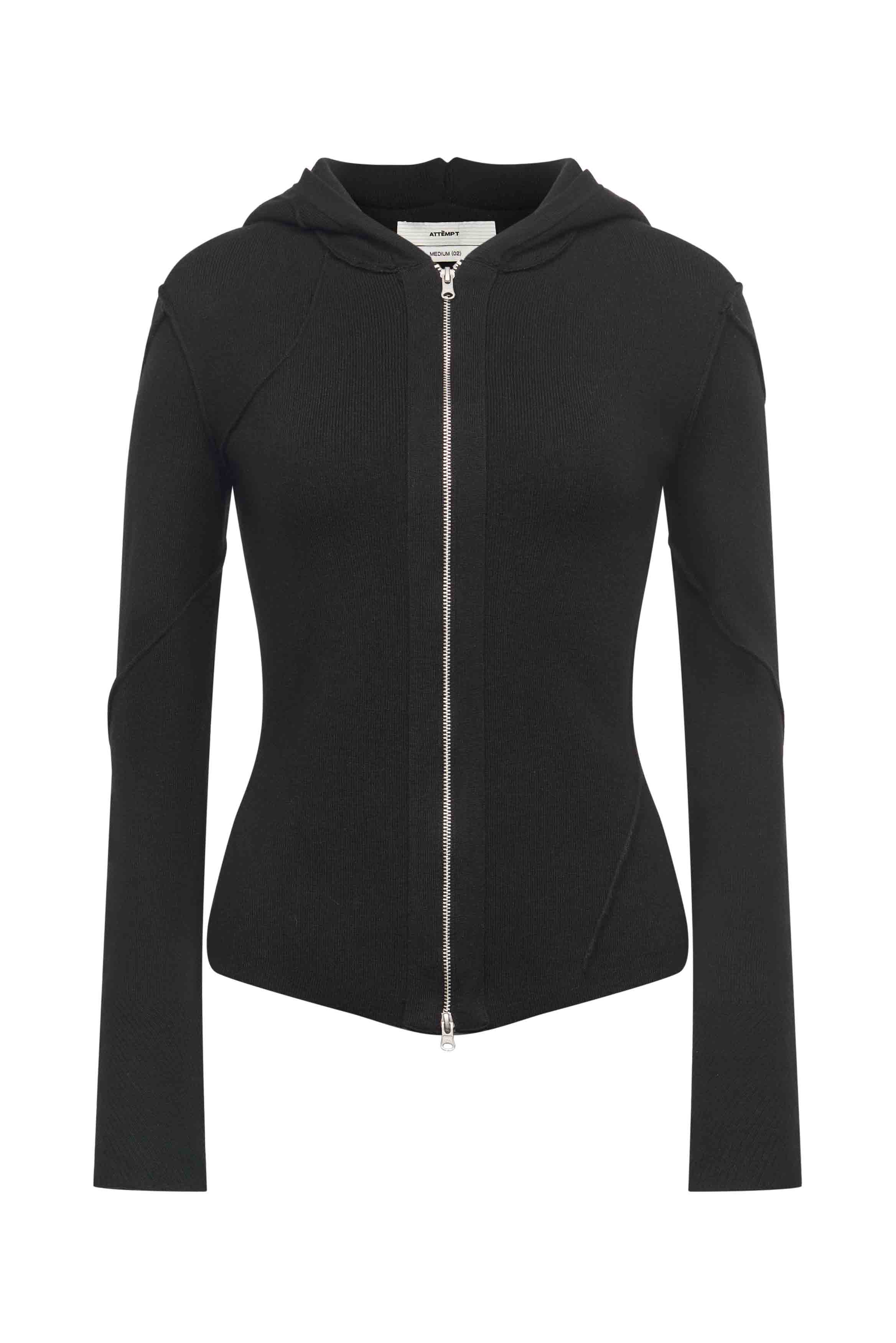 Attempt black knitted hoodie. Long sleeves. Double zip closure at front. Thumbholes details at cuffs. Two side pockets.