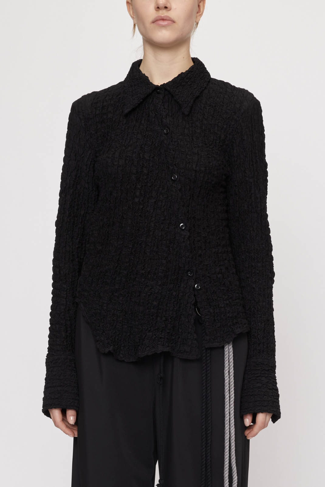 Song for the Mute shirt. Long sleeves. Button closure at front. Button closure at cuffs. Spread collar. Beautiful textural fabric. Twisted design throughout.