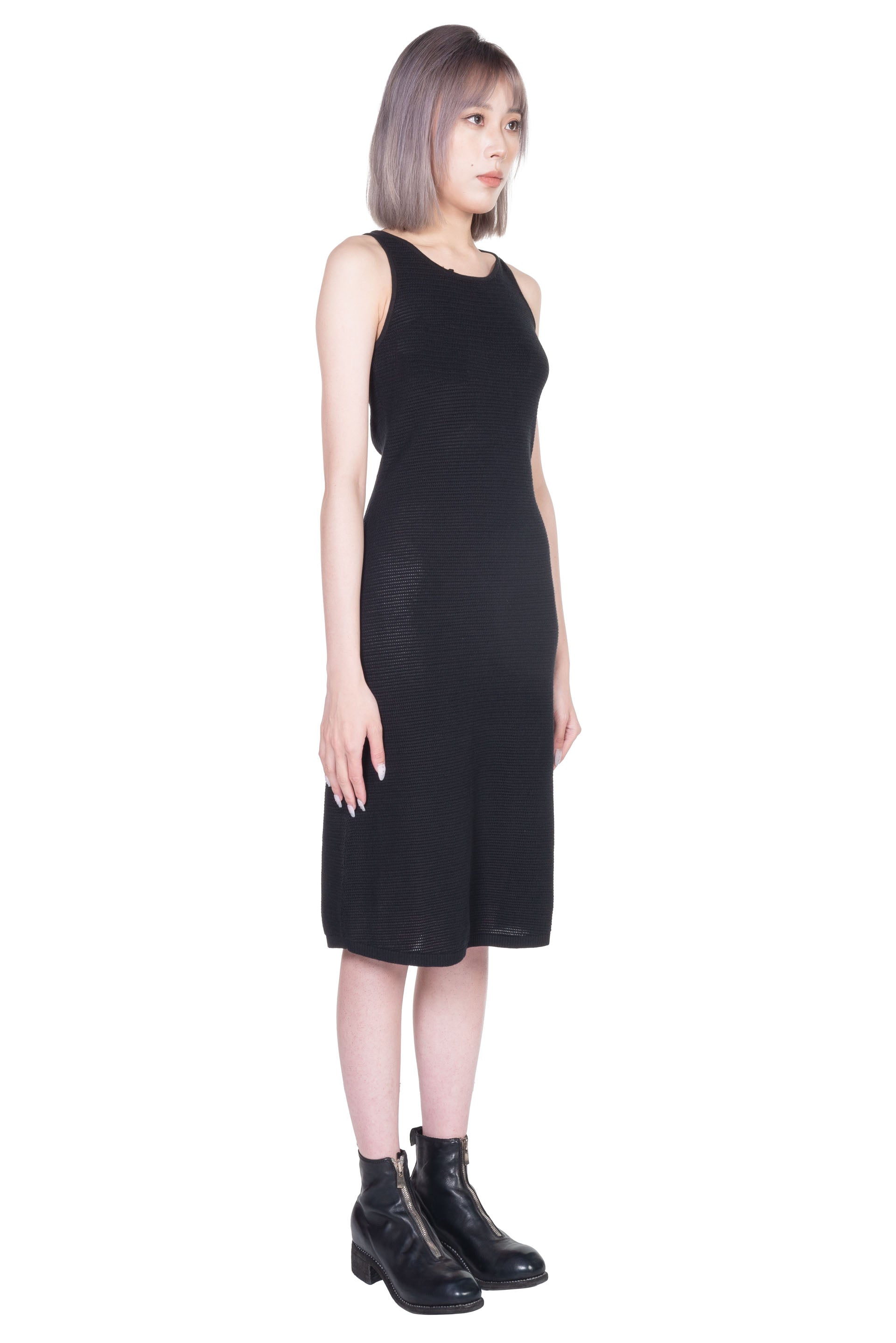 Black Lace Knit Dress.Slim fit. Sleeveless. Hollow back with back ties. Round neck. Back logo detail. Stretchable fabric.