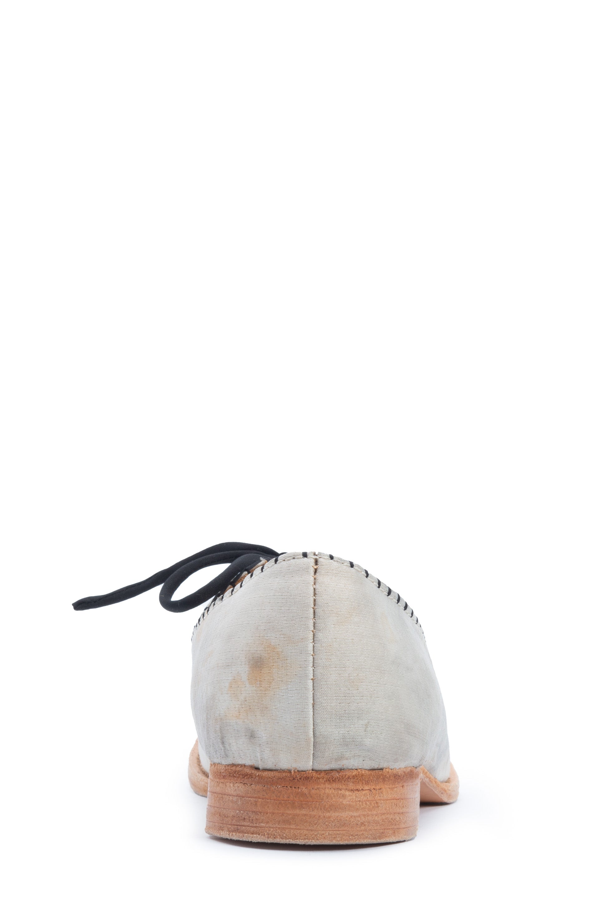 Yu Qun believes that everyone's character is multi-faceted and expressing spiritual independence. Fine hand-stitched threads, old mottled colours and patterns, and unconventional cuts are what Mute Dance has been exploring. The leaves and stems of fresh plants and berries, dried medicinal materials, old metals and so on are combined with the ancient and traditional dyeing technology to dye fabrics and paper as seen with the Lace Up Derby.