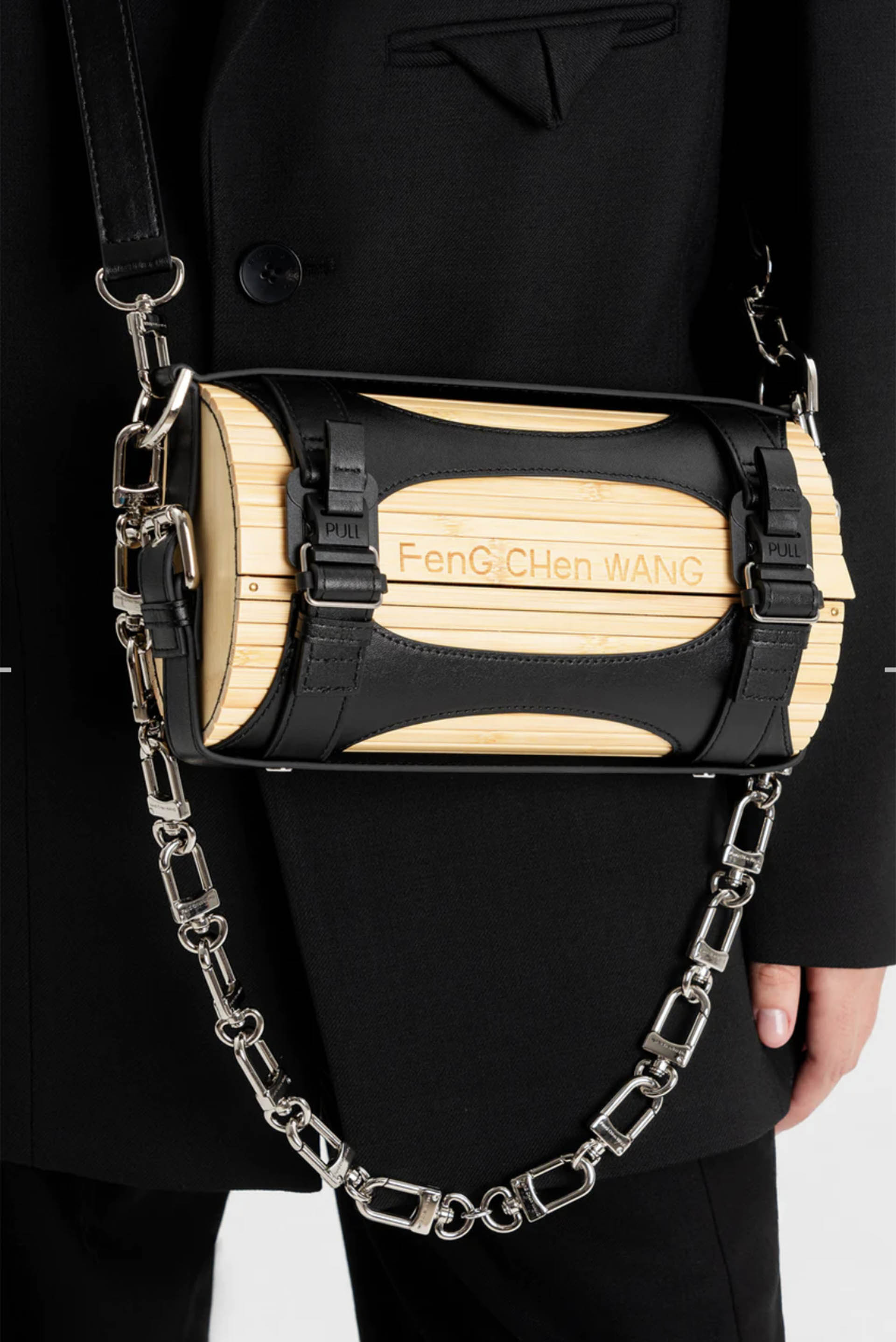 Signature Bamboo bag. Cylinder black bamboo bag. Buckle closure. Feng Chen Wang Logo. Comes with one detachable leather strap and a detachable metallic chain. Magnetic closure.