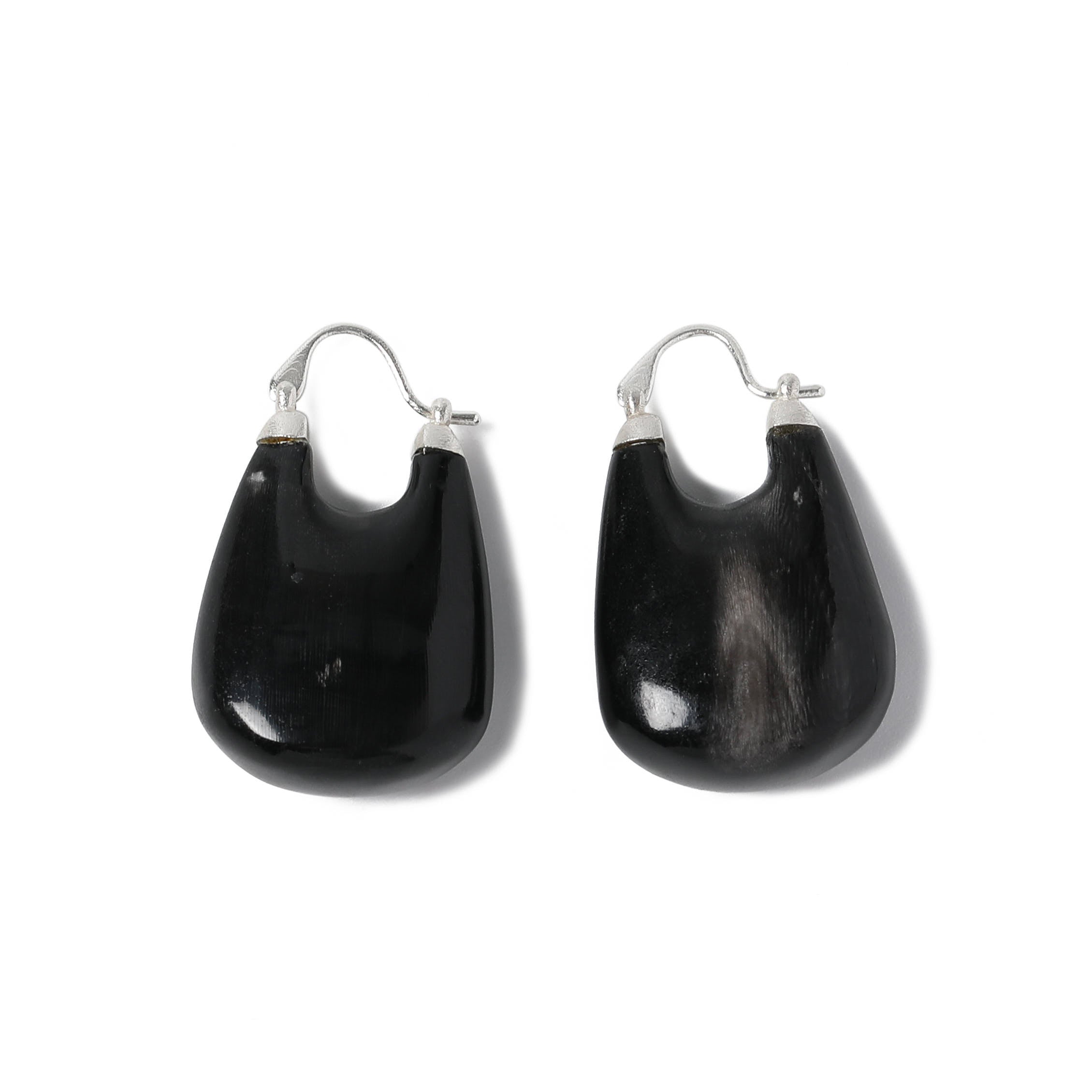 These earrings are crafted from 925 sterling silver, panelled with natural black/white horn. Each piece of horn is hand-polished for a smooth, warm finish with delicate details. Naturally occurring patterns make every pair unique, while the fluid lines and sculptural form make a statement, perfect for adding focus and depth to any look.