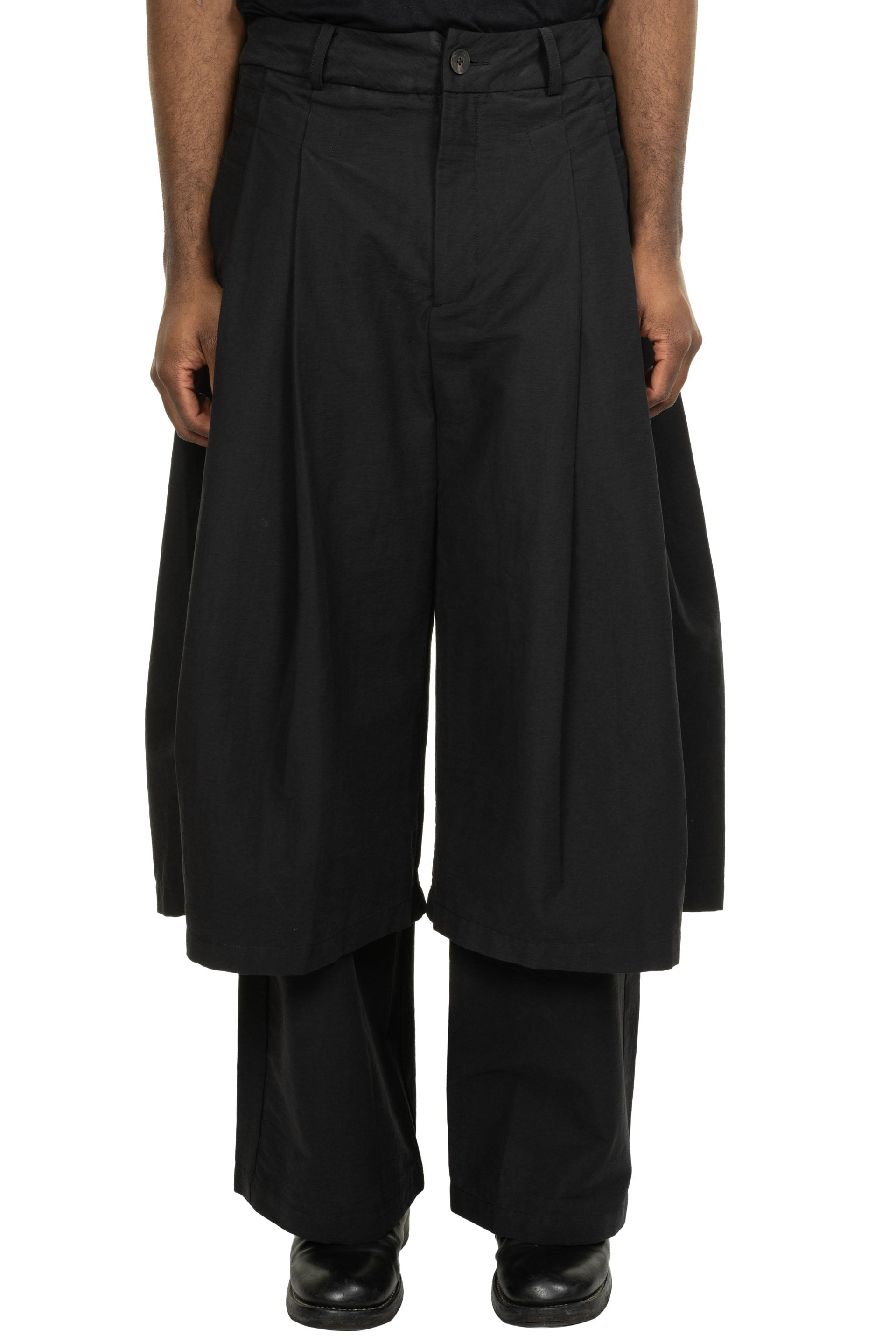 Attempt Attempt Layered Panel Pants in Black. two side pockets. Button closure at waist. Layered. Soft light cotton fabric.