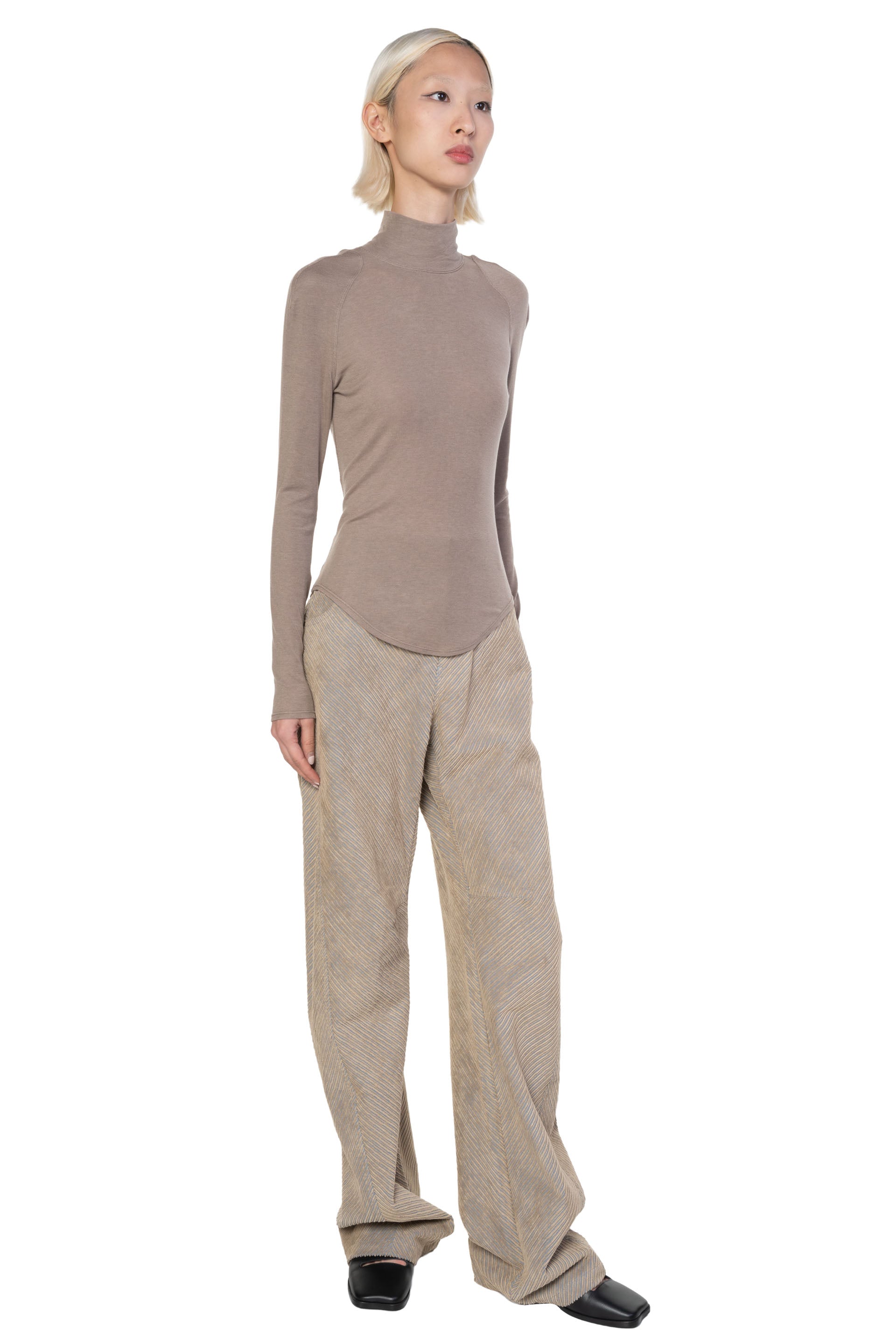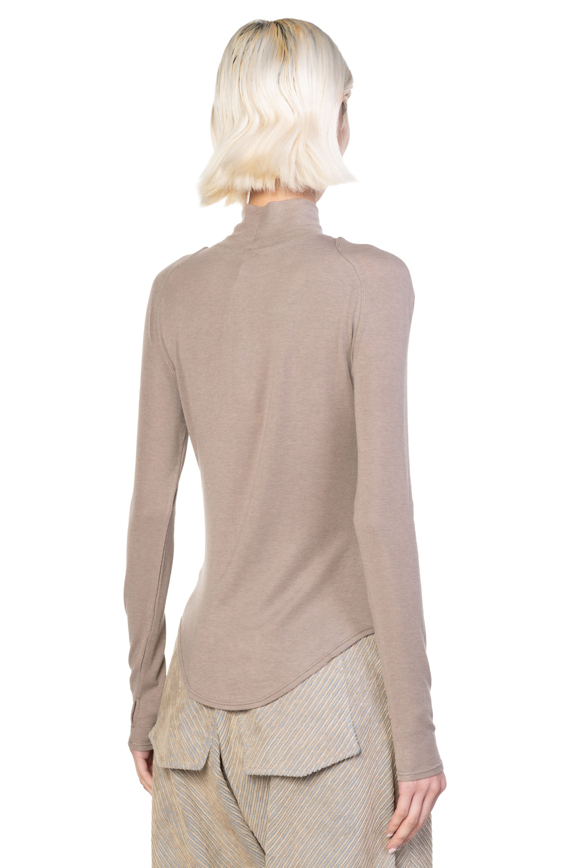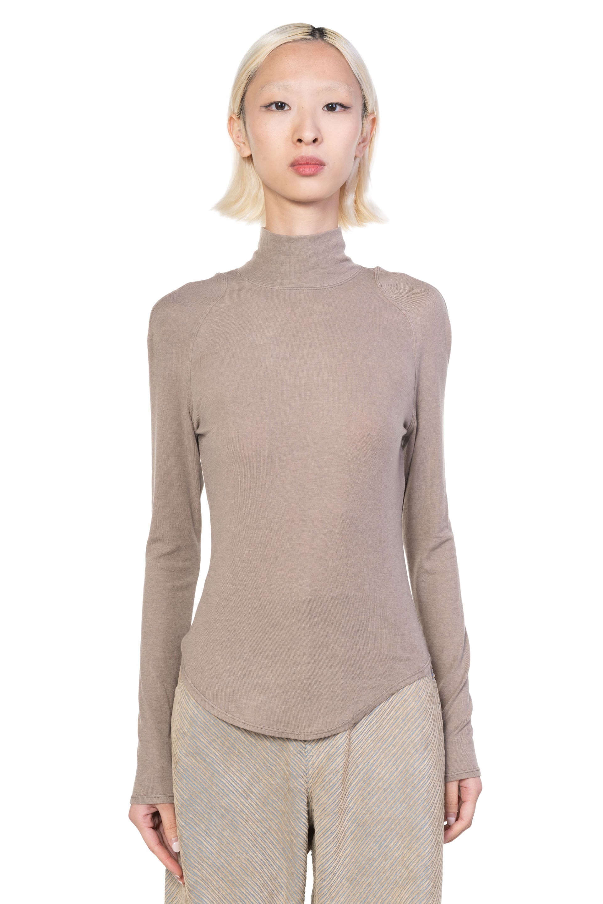 This top is crafted from a Lyocell–wool blend that is soft, breathable, and has plenty of stretch. This slim-fit top accentuates the upper body, with a mock neckline and raglan sleeves that subtly enhance the shoulders and neckline. Minimalist yet thoughtfully detailed, it balances simplicity with refinement.