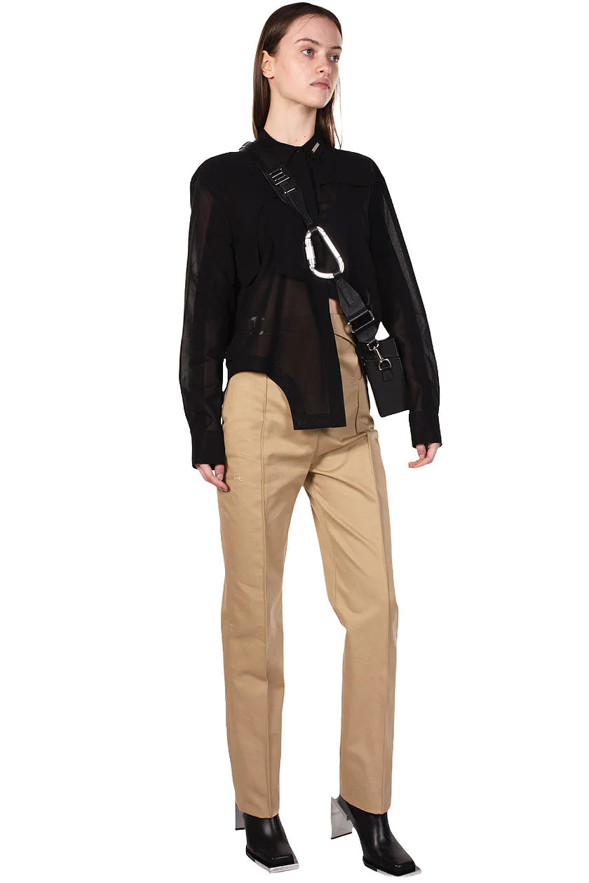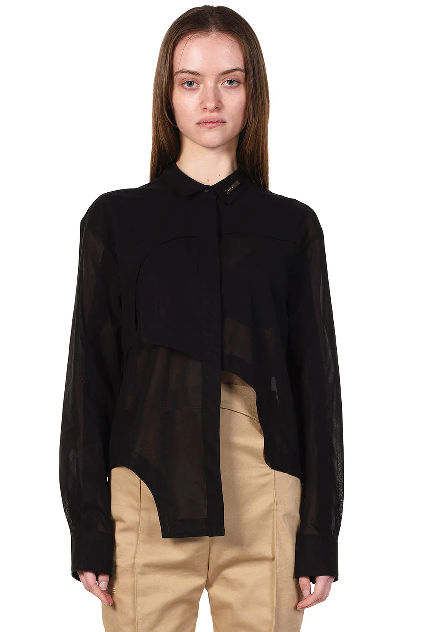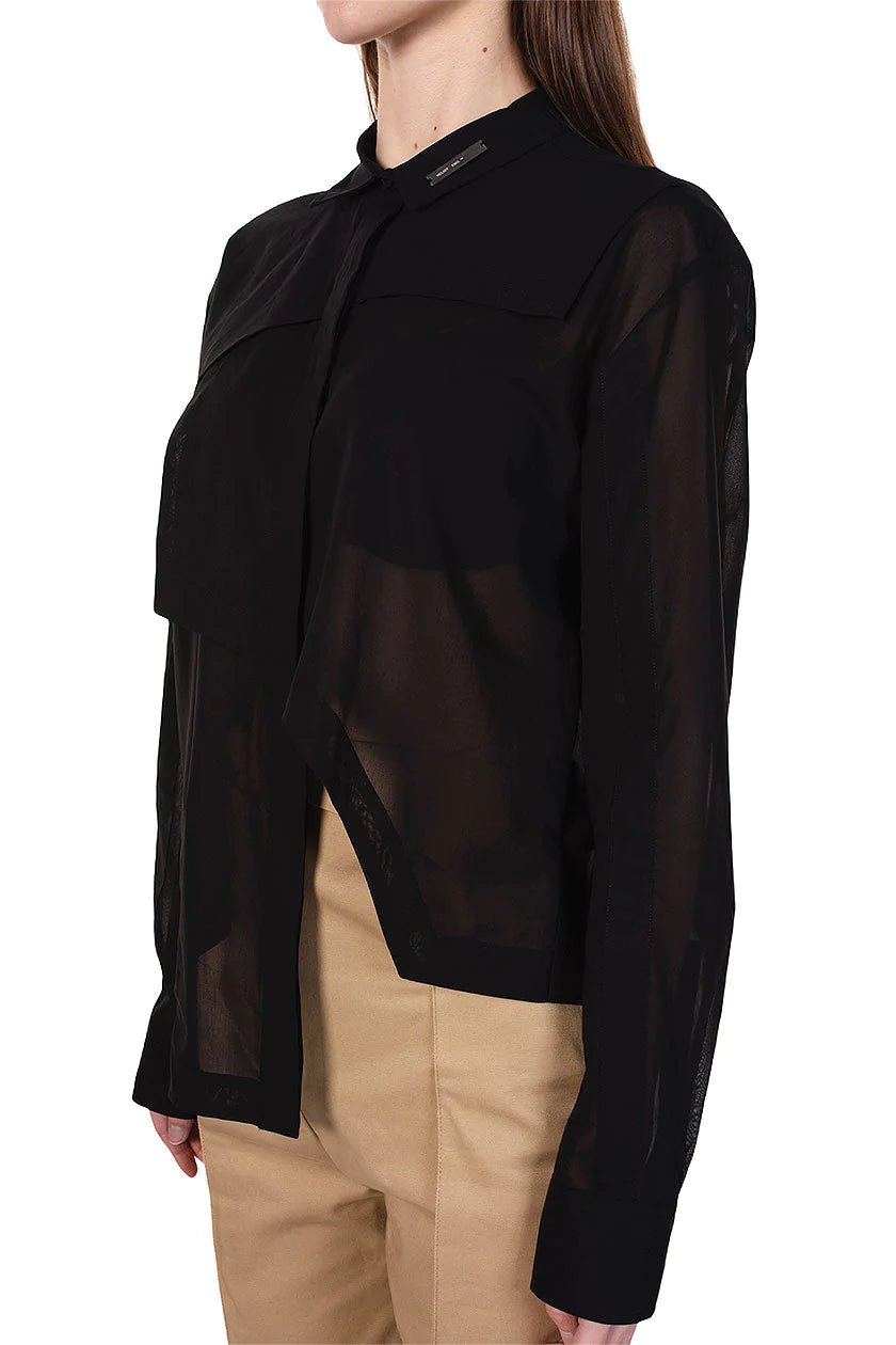 Overlapped asymmetric layers. Standard 100 by Oeko-tex® fabric made in Italy. Sheer fabric. Asymmetric hem. Concealed shirting button front closure. Heliot Emil ™ metal plate logo on the collar