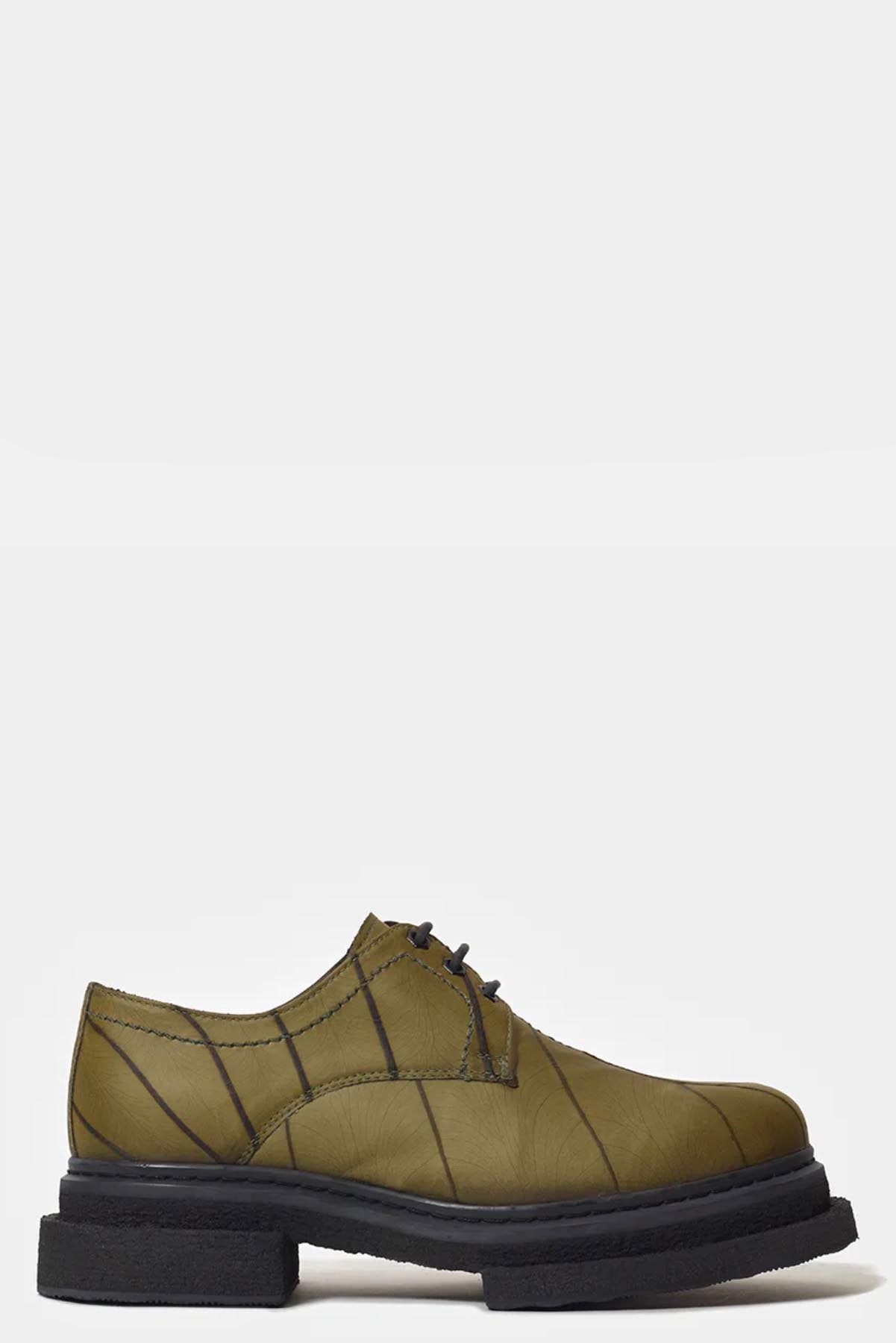 P. Andrade presents a Japanese avant-garde style combined with looks that are fit for rainforest excursions, tinged with tailoring cues and contrasted with technical touches as seen with the Leaf Leather Derby Green.